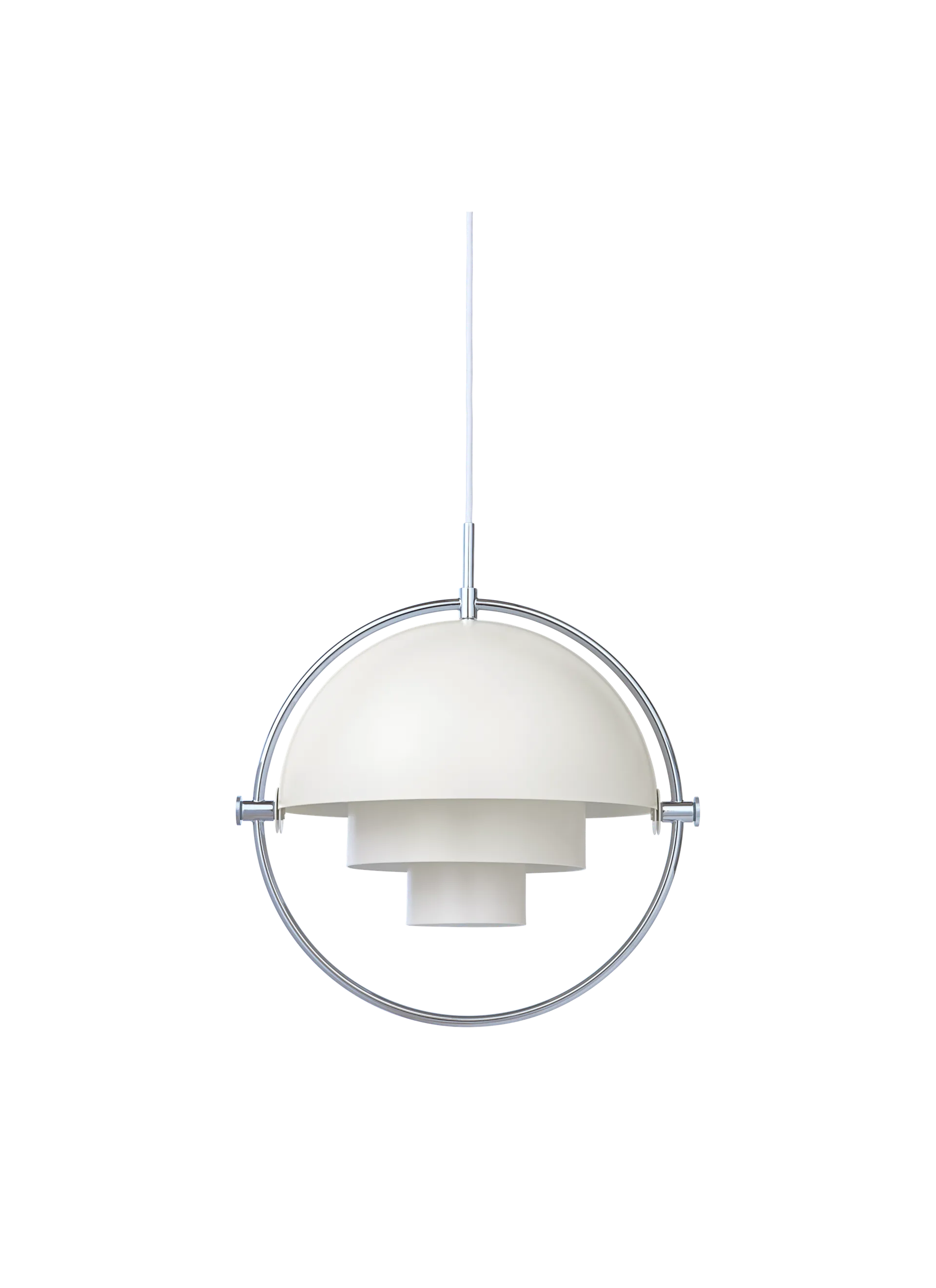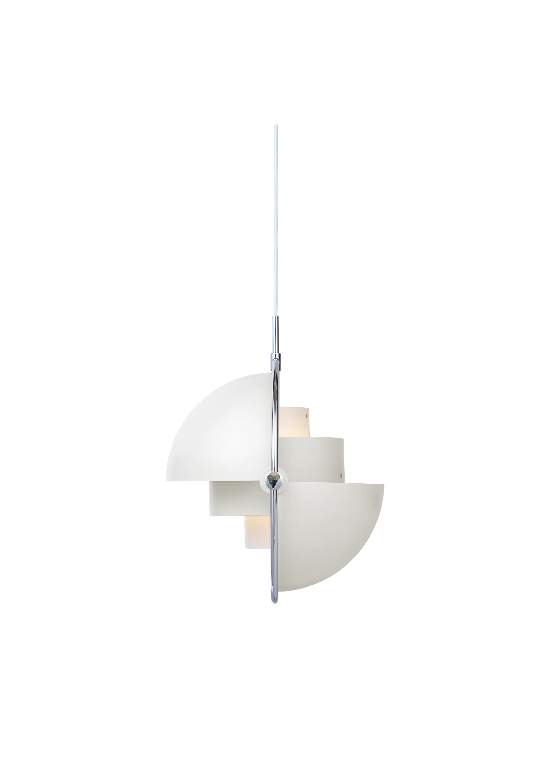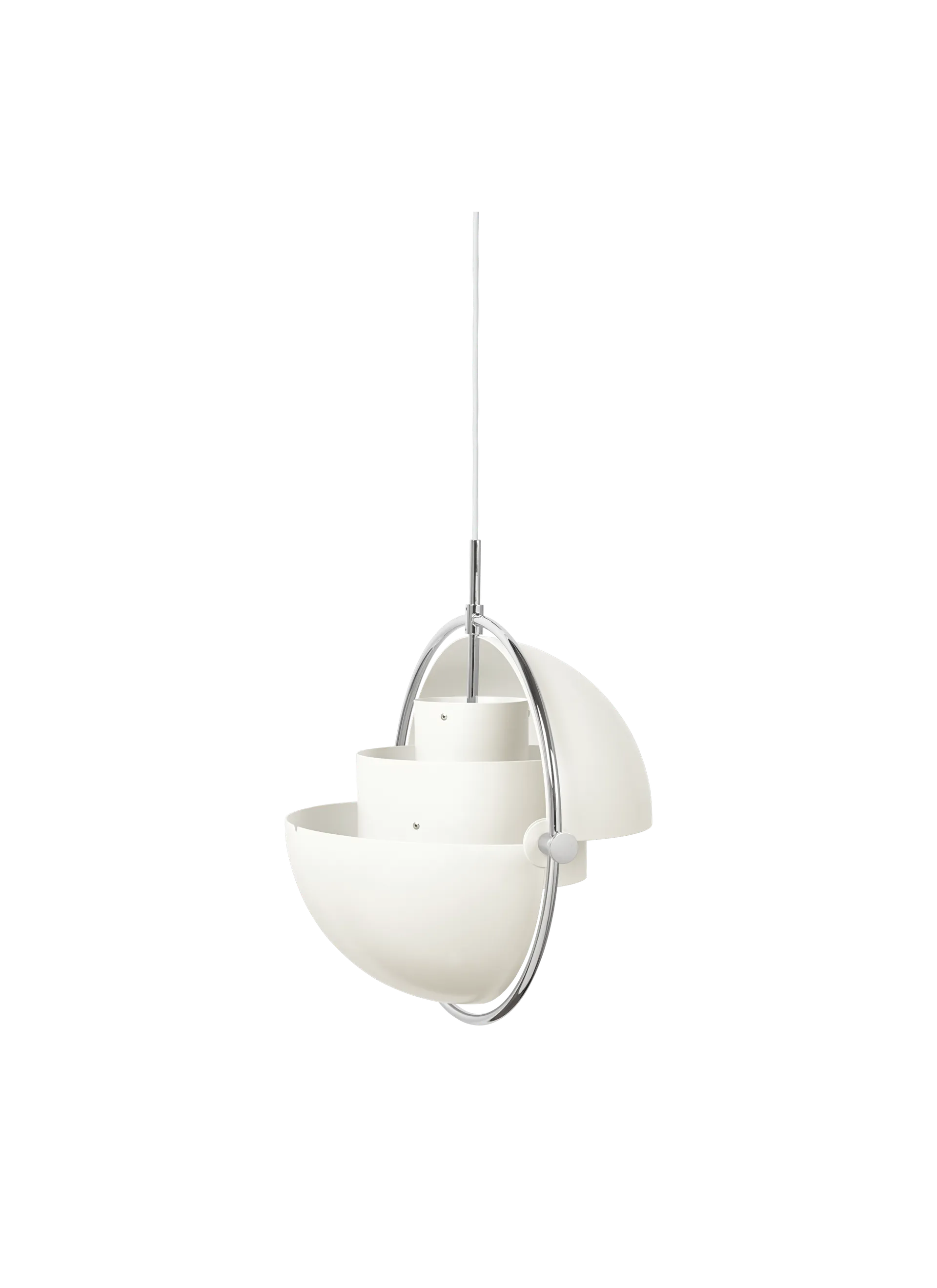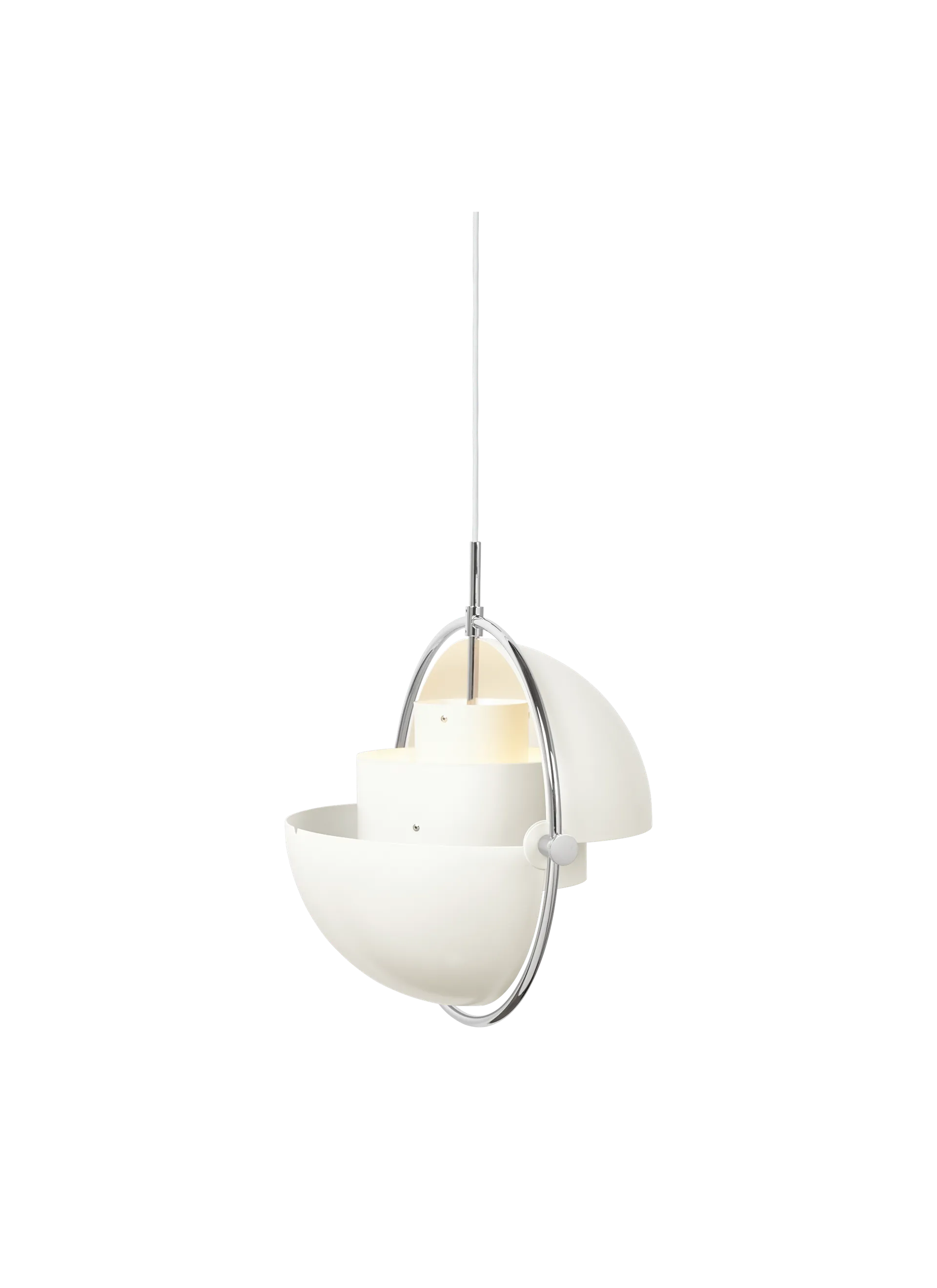 The Multi-Lite Pendant embraces the golden era of Danish design with its characteristic shape of two opposing outside, mobile shades that enable creating a personal installation and a wide range of lighting values in a room. By individually rotating the shades, the Multi-Lite Pendant can be transformed into multiple combinations where the light can be directed upwards, downwards or exude an asymmetrical art light. The Multi-Lite was first drawn in 1972 when Louis Weisdorf did an exception to his own design custom of using multiple repeating elements. Instead, it reflects his passion for diversity. Two cylindrical shapes lay the foundation of the lamp and a metal ring encompasses it and anchors the two quarter-spherical shades, which ultimately completes a picture of an iconic design with multiple purposes. The Multi-Lite Pendant has a timeless expression that fits into any domestic setting.