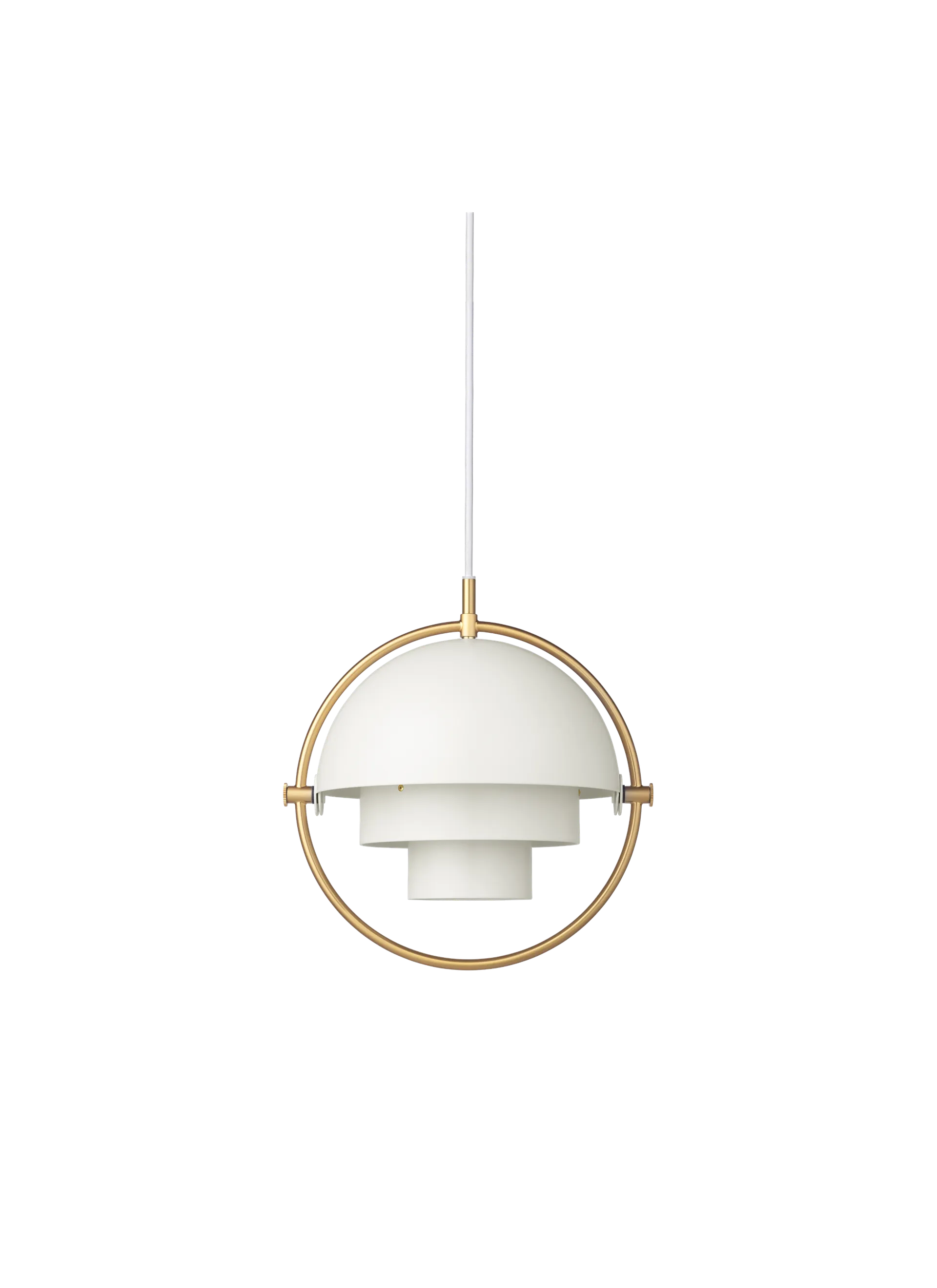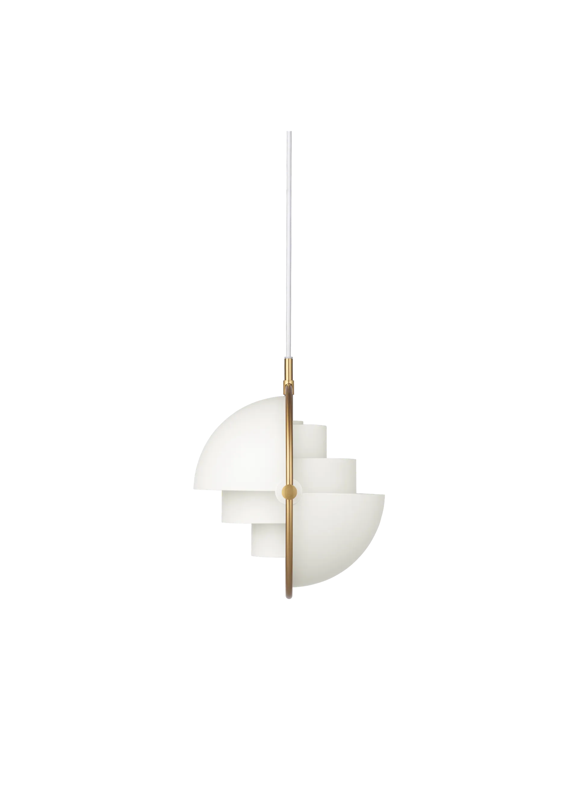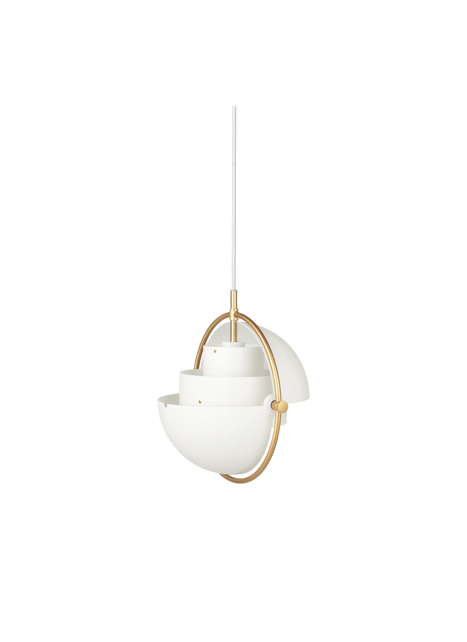 The Multi-Lite Pendant embraces the golden era of Danish design with its characteristic shape of two opposing outside, mobile shades that enable creating a personal installation and a wide range of lighting values in a room. By individually rotating the shades, the Multi-Lite Pendant can be transformed into multiple combinations where the light can be directed upwards, downwards or exude an asymmetrical art light. The Multi-Lite was first drawn in 1972 when Louis Weisdorf did an exception to his own design custom of using multiple repeating elements. Instead, it reflects his passion for diversity. Two cylindrical shapes lay the foundation of the lamp and a metal ring encompasses it and anchors the two quarter-spherical shades, which ultimately completes a picture of an iconic design with multiple purposes. The Multi-Lite Pendant has a timeless expression that fits into any domestic setting.