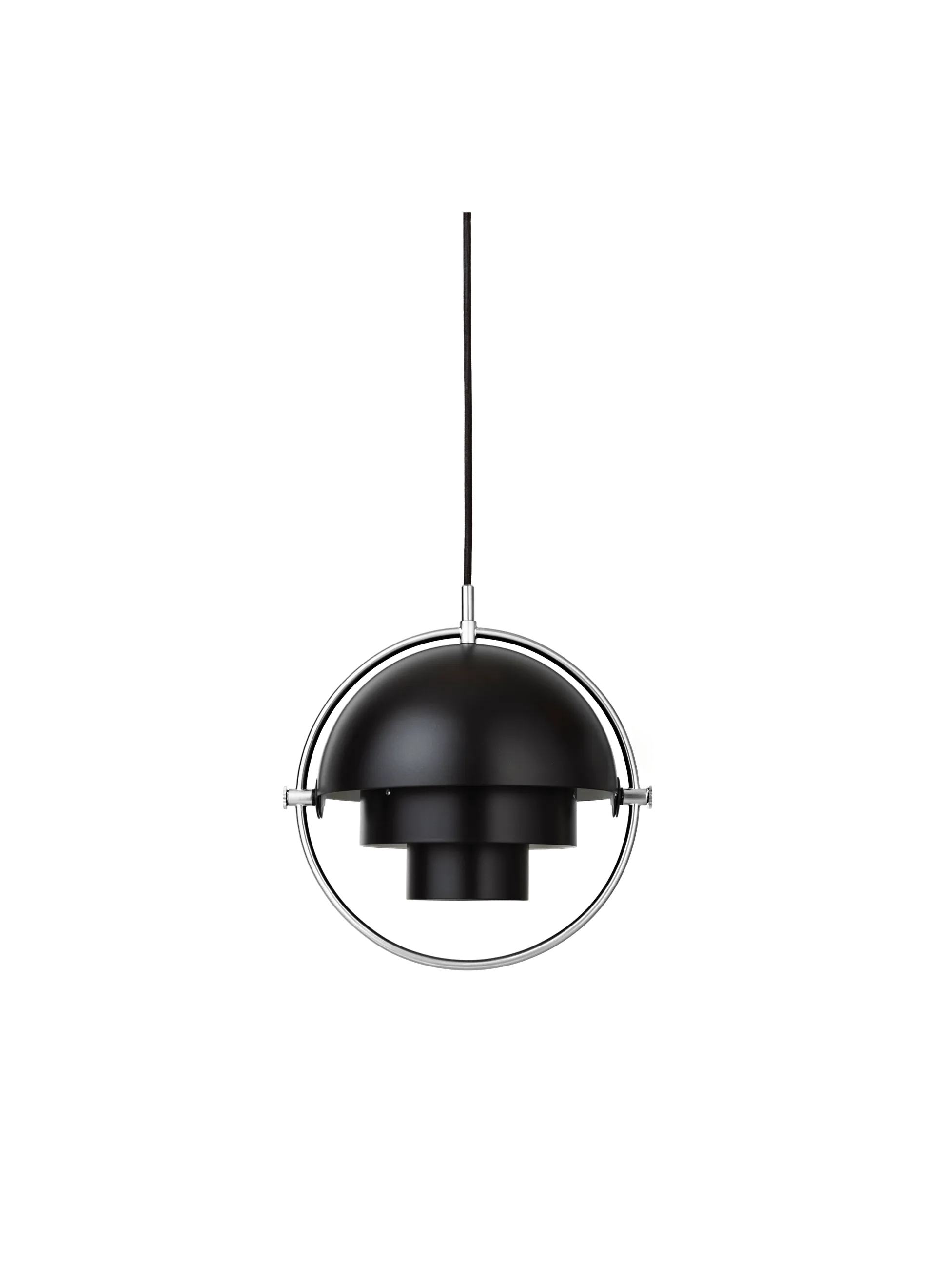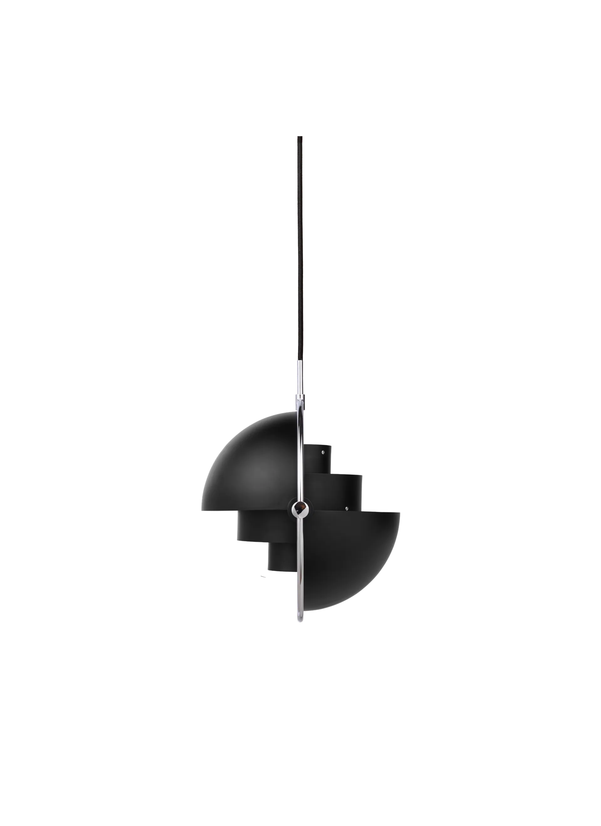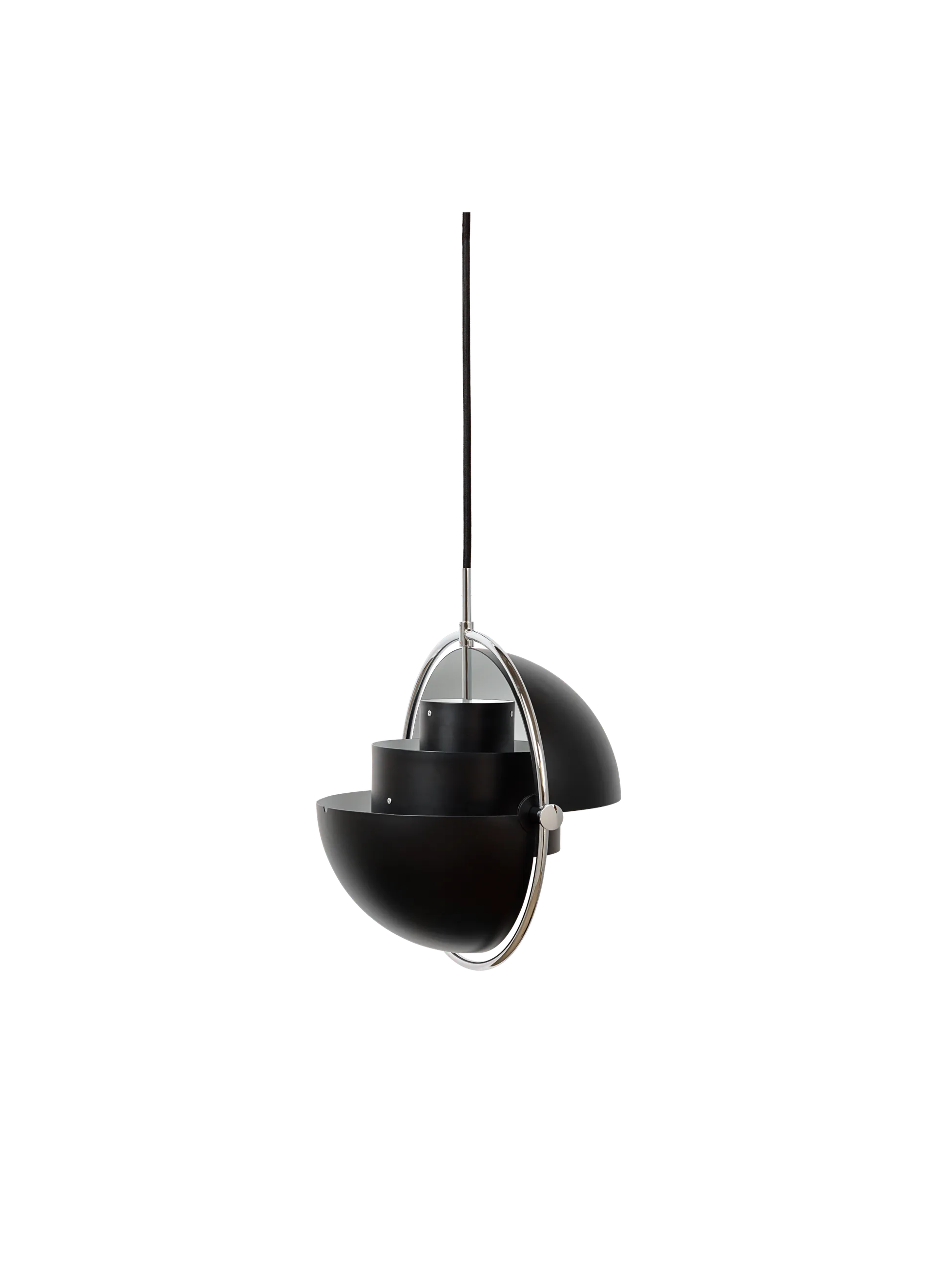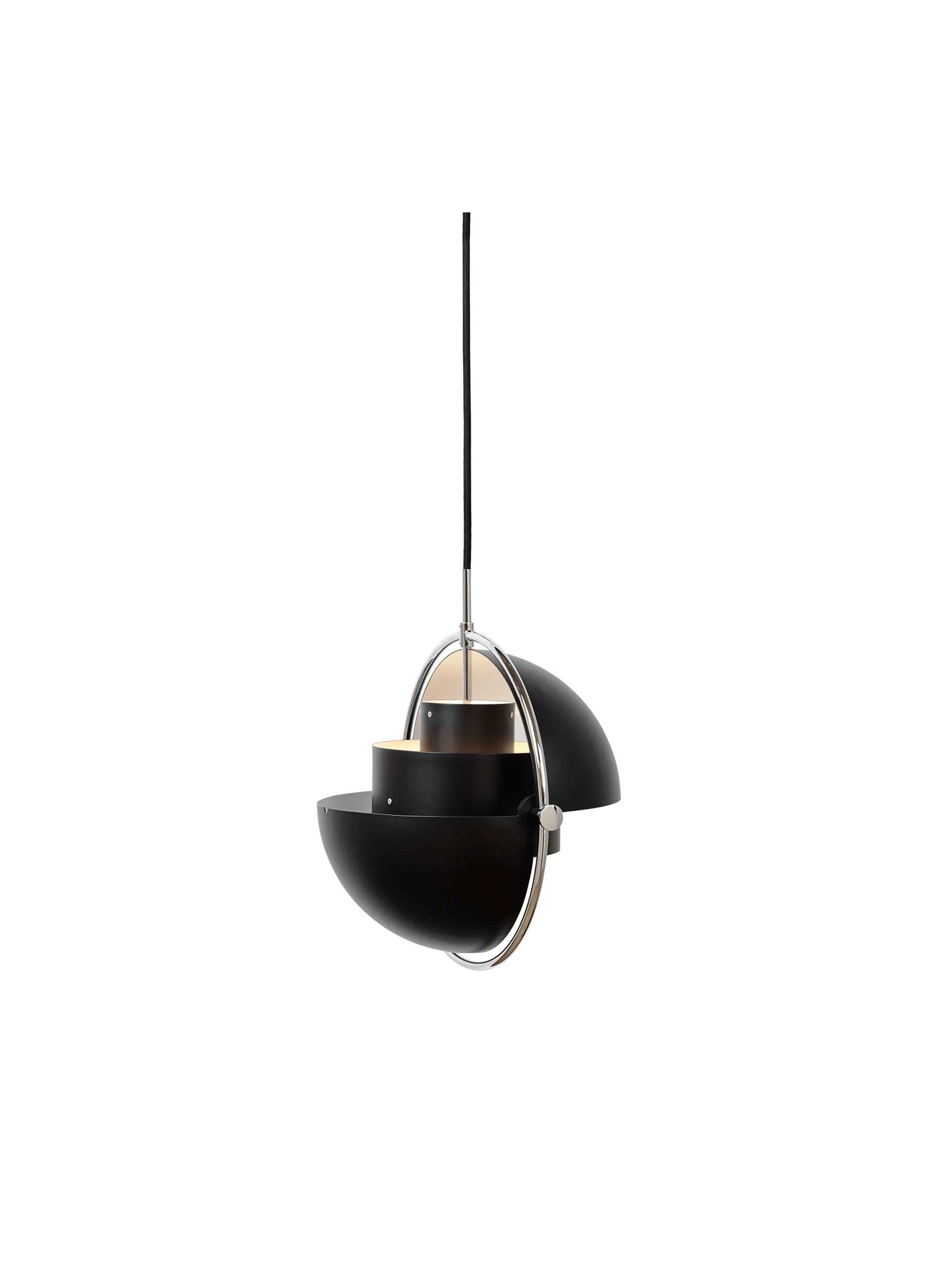 The Multi-Lite Pendant embraces the golden era of Danish design with its characteristic shape of two opposing outside, mobile shades that enable creating a personal installation and a wide range of lighting values in a room. By individually rotating the shades, the Multi-Lite Pendant can be transformed into multiple combinations where the light can be directed upwards, downwards or exude an asymmetrical art light. The Multi-Lite was first drawn in 1972 when Louis Weisdorf did an exception to his own design custom of using multiple repeating elements. Instead, it reflects his passion for diversity. Two cylindrical shapes lay the foundation of the lamp and a metal ring encompasses it and anchors the two quarter-spherical shades, which ultimately completes a picture of an iconic design with multiple purposes. The Multi-Lite Pendant has a timeless expression that fits into any domestic setting.