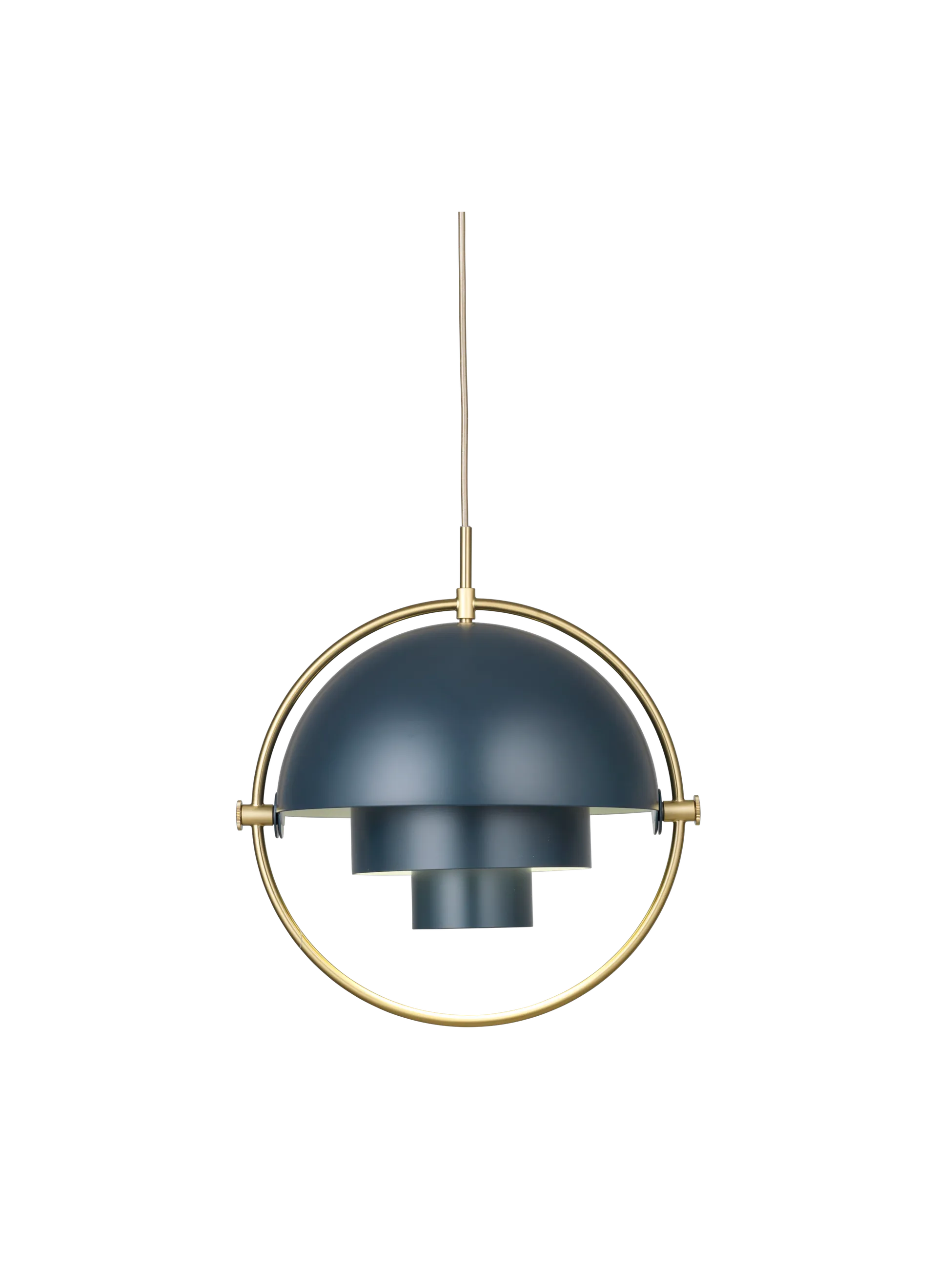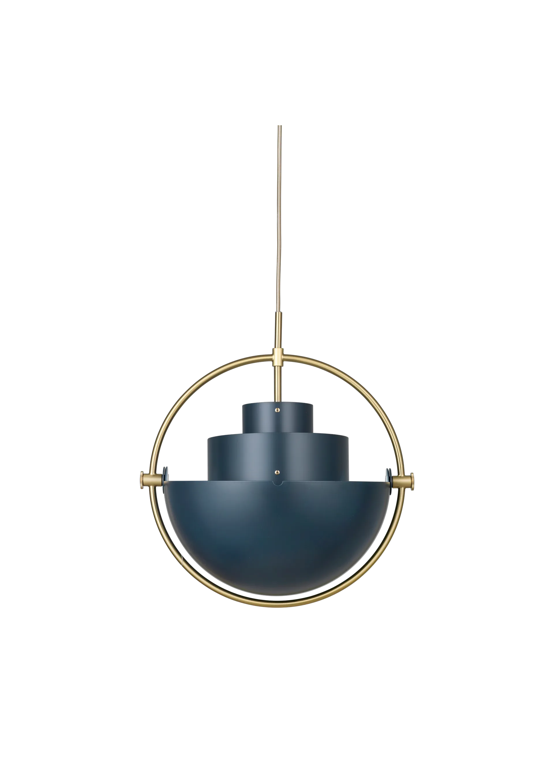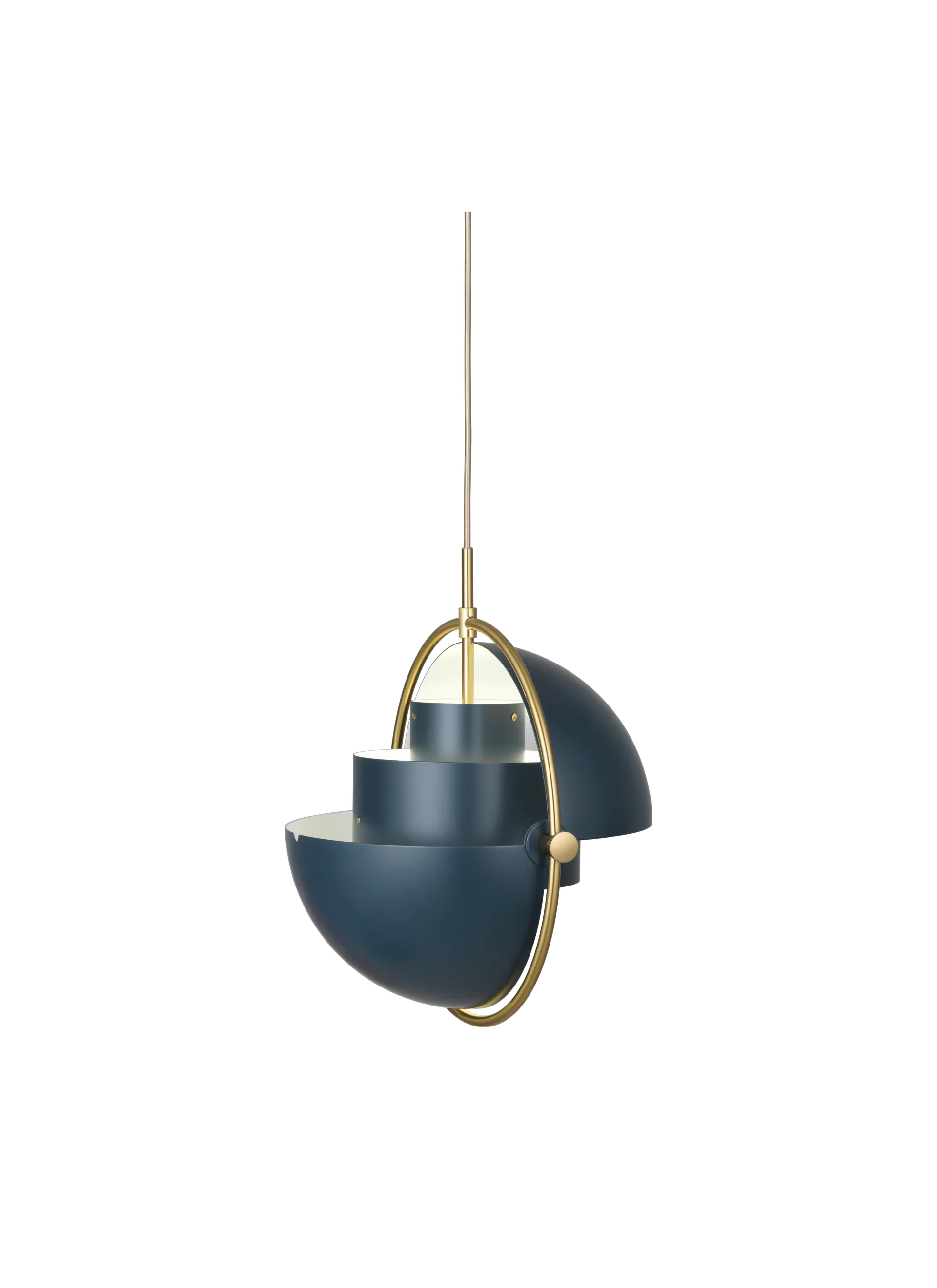 The Multi-Lite Pendant embraces the golden era of Danish design with its characteristic shape of two opposing outside, mobile shades that enable creating a personal installation and a wide range of lighting values in a room. By individually rotating the shades, the Multi-Lite Pendant can be transformed into multiple combinations where the light can be directed upwards, downwards or exude an asymmetrical art light. The Multi-Lite was first drawn in 1972 when Louis Weisdorf did an exception to his own design custom of using multiple repeating elements. Instead, it reflects his passion for diversity. Two cylindrical shapes lay the foundation of the lamp and a metal ring encompasses it and anchors the two quarter-spherical shades, which ultimately completes a picture of an iconic design with multiple purposes. The Multi-Lite Pendant has a timeless expression that fits into any domestic setting.