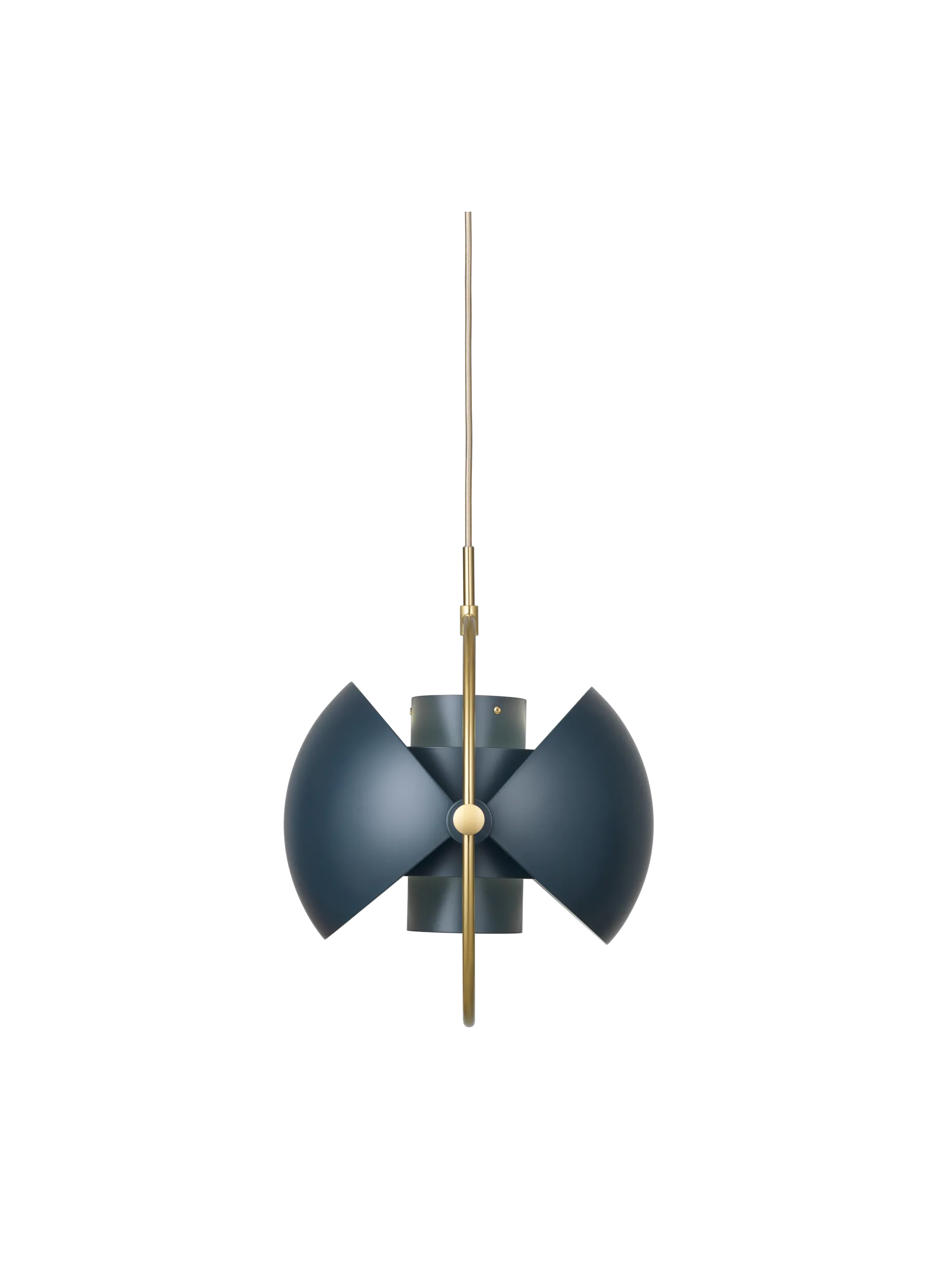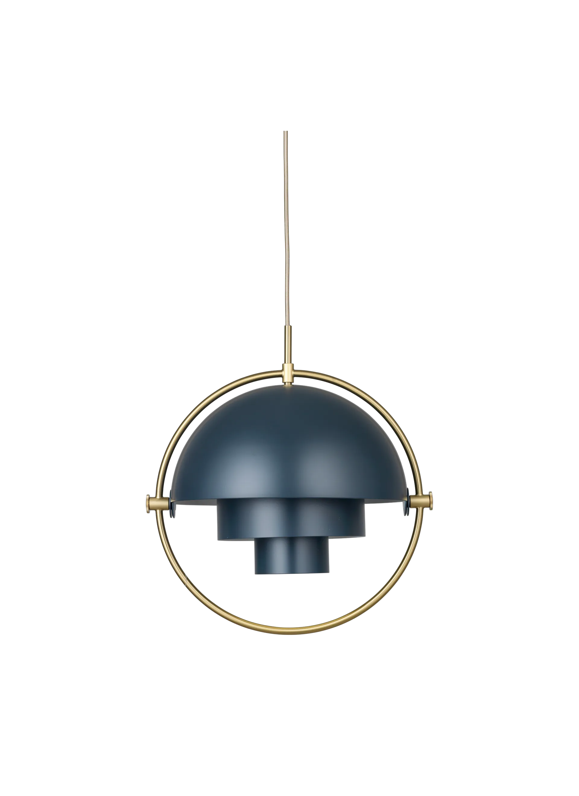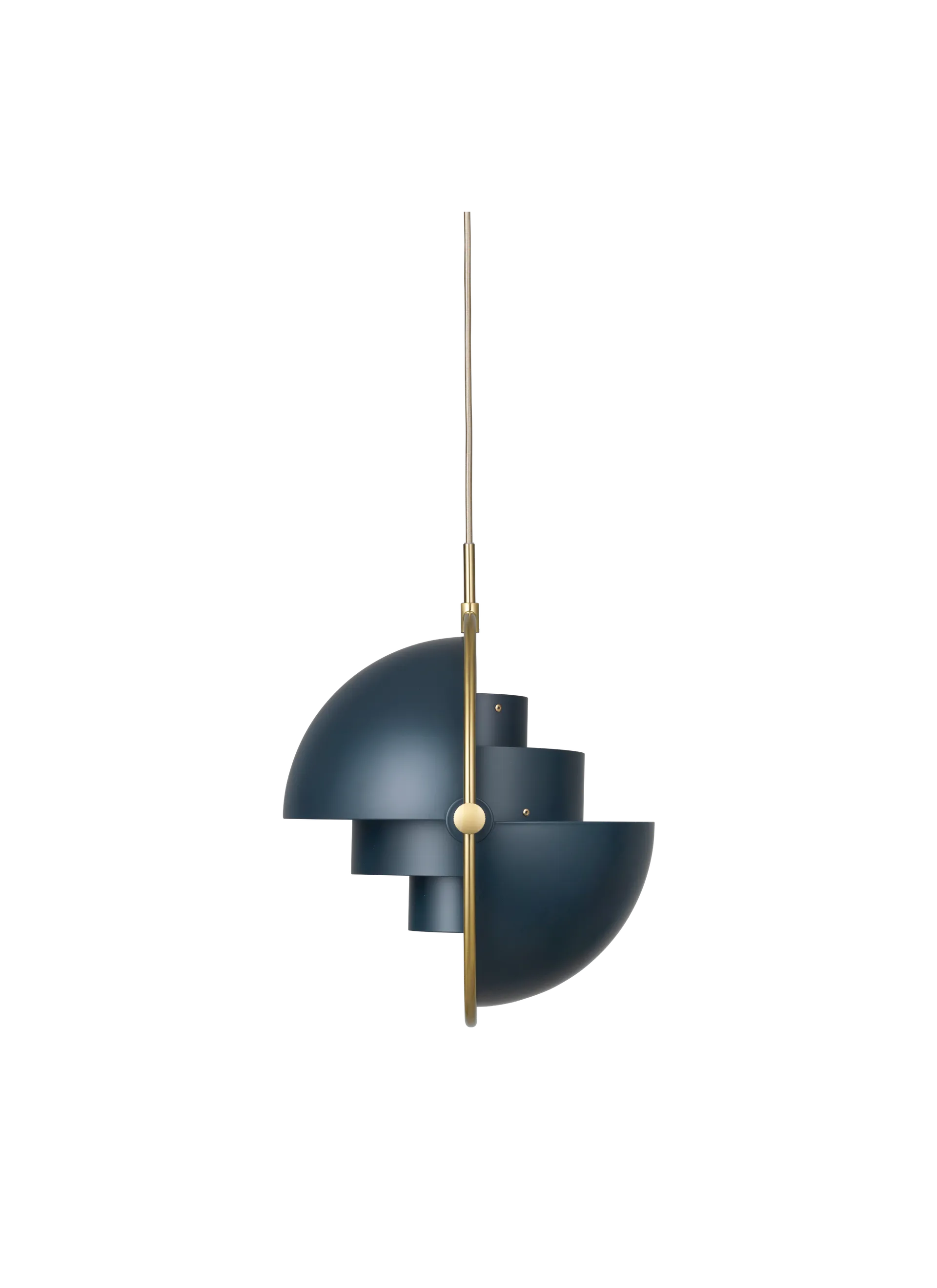 The Multi-Lite Pendant embraces the golden era of Danish design with its characteristic shape of two opposing outside, mobile shades that enable creating a personal installation and a wide range of lighting values in a room. By individually rotating the shades, the Multi-Lite Pendant can be transformed into multiple combinations where the light can be directed upwards, downwards or exude an asymmetrical art light. The Multi-Lite was first drawn in 1972 when Louis Weisdorf did an exception to his own design custom of using multiple repeating elements. Instead, it reflects his passion for diversity. Two cylindrical shapes lay the foundation of the lamp and a metal ring encompasses it and anchors the two quarter-spherical shades, which ultimately completes a picture of an iconic design with multiple purposes. The Multi-Lite Pendant has a timeless expression that fits into any domestic setting.