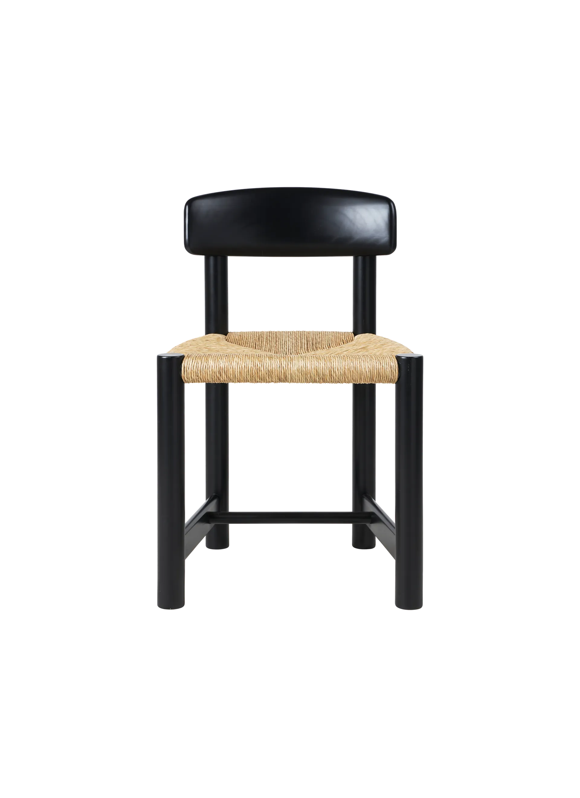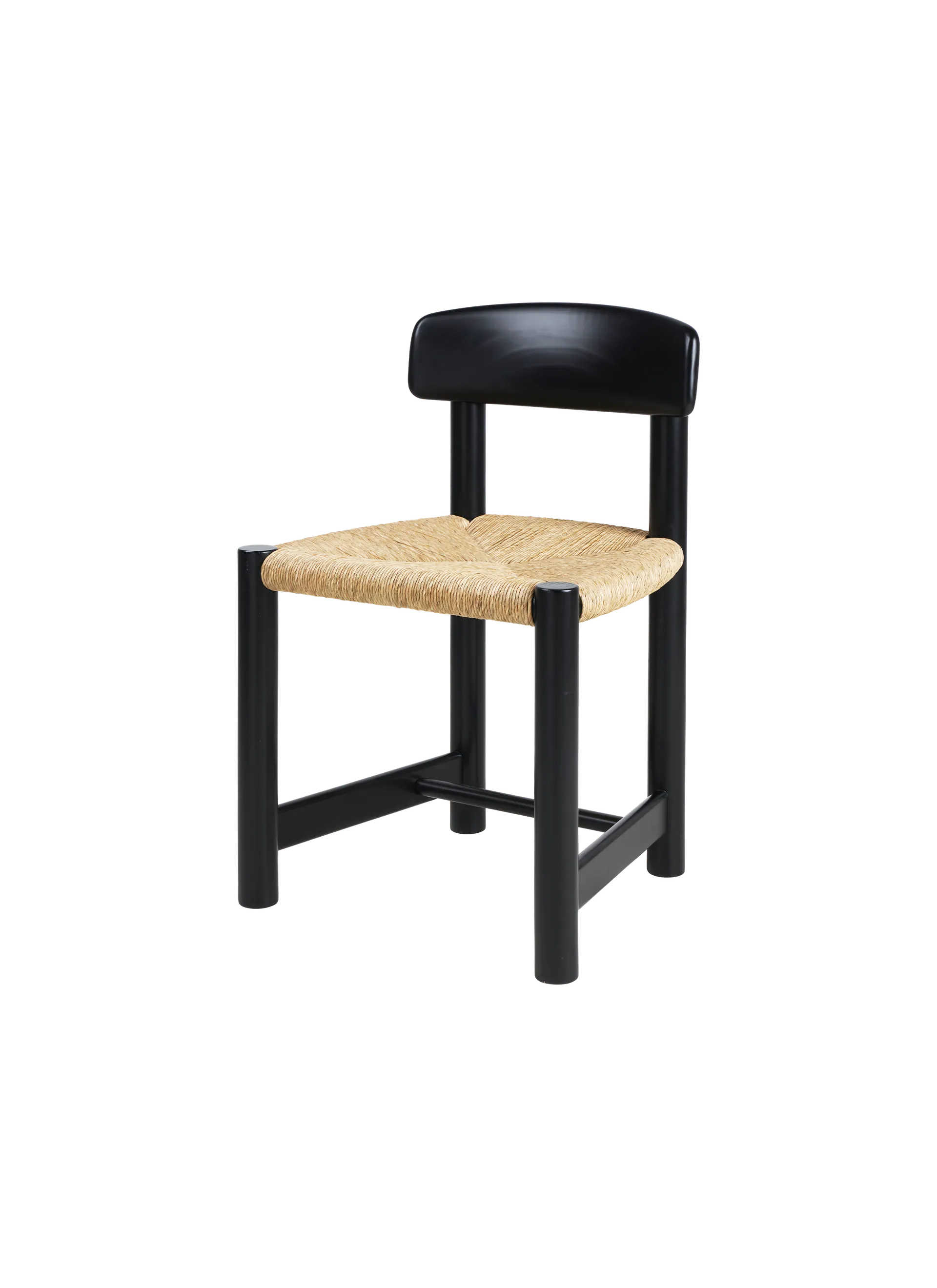 Chunky in appearance but light in weight, the chair’s frame is crafted from FSC®-certified solid pine (FSC®-C176589) from replanted forests, chosen for its faster growth rate and CO2-storage potential, and other controlled materials. The Daumiller Side Chair is available in either golden pine or with a brown/black-stained finish. While the golden edition emphasizes the natural pattern of the wood, imbuing the chair with a rustic farmhouse feel, the brown/black stain gives the chair a stronger silhouette and a cleaner-lined, more graphical expression, without compromising materiality.