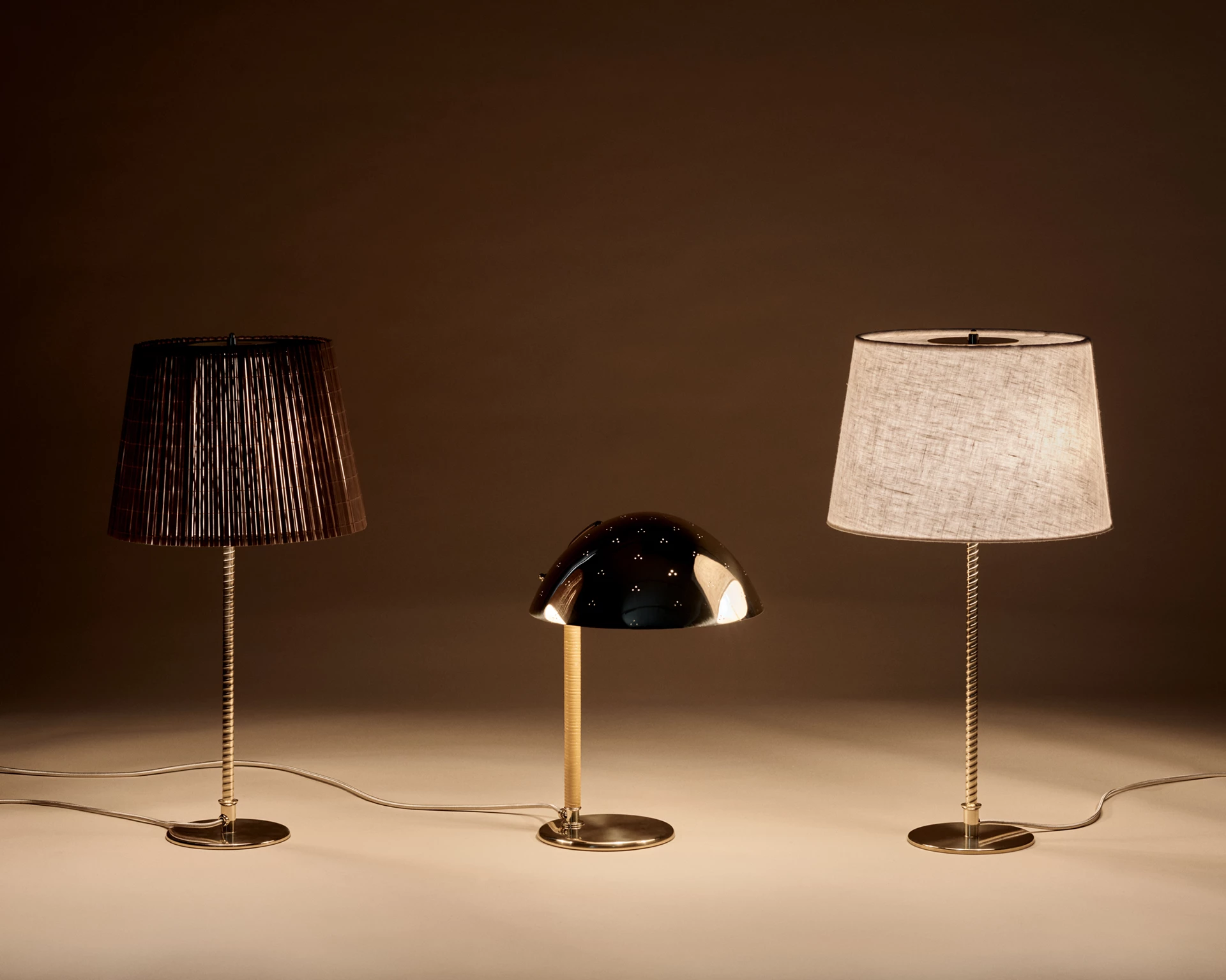 First produced around 1950, the 9205 is a classic, almost archetypal, table lamp with an unmistakable Tynell aesthetic. Elegant and slender, the lamp’s apparently simple form conceals an extraordinary degree of craftsmanship and highly skilled hand-making. The canvas model's shade is constructed by attaching the fabric to a liner, which is then manually fixed onto a wire frame, while the bamboo is made from a series of slats first sewn together by hand to form a pleated mat before being connected to the liner and frame a contemporary update to the ryegrass cane used in Taito’s original model. The stem is milled with a rattan-like pattern, created by a metalsmith using a lathe with great precision and attention to detail to mimic the effect of a series of overlapping strips. A brass plate, screwed into the stem, keeps the shade in place.