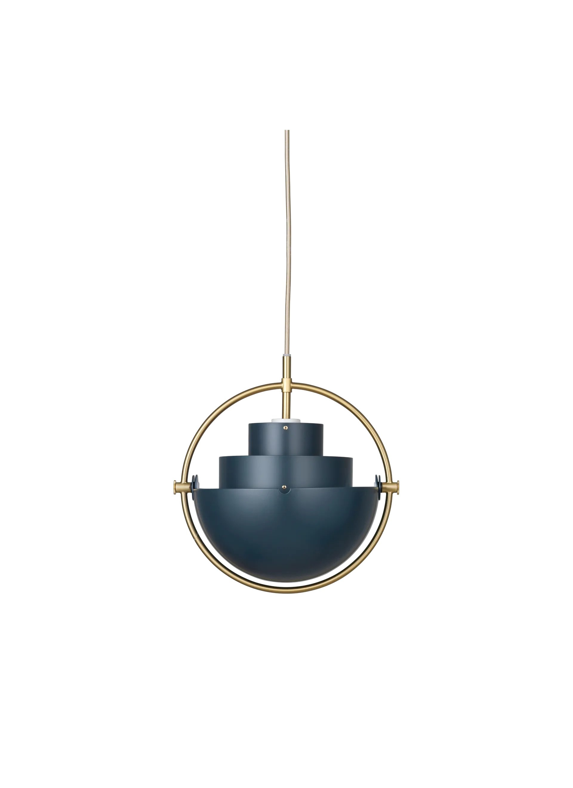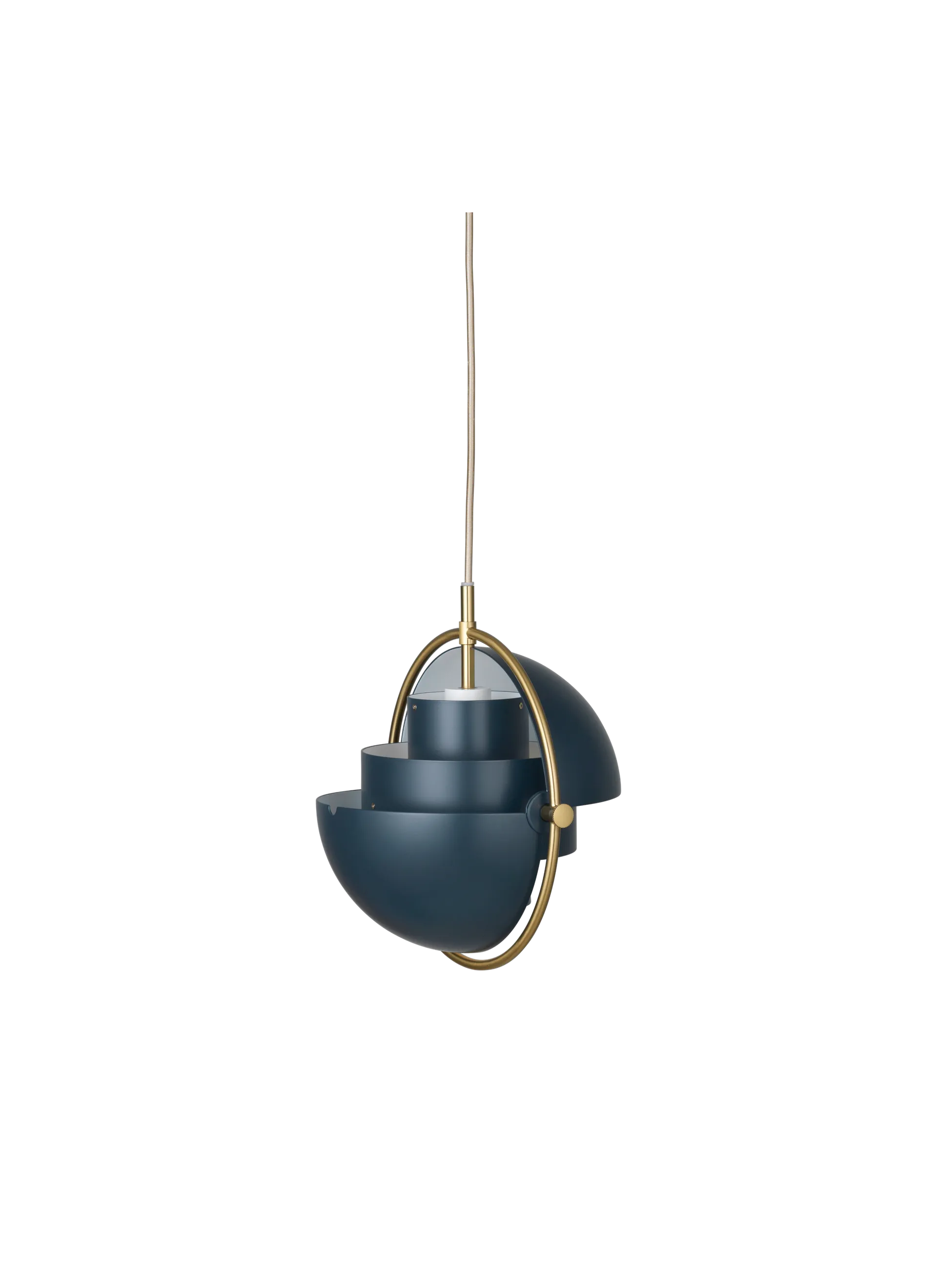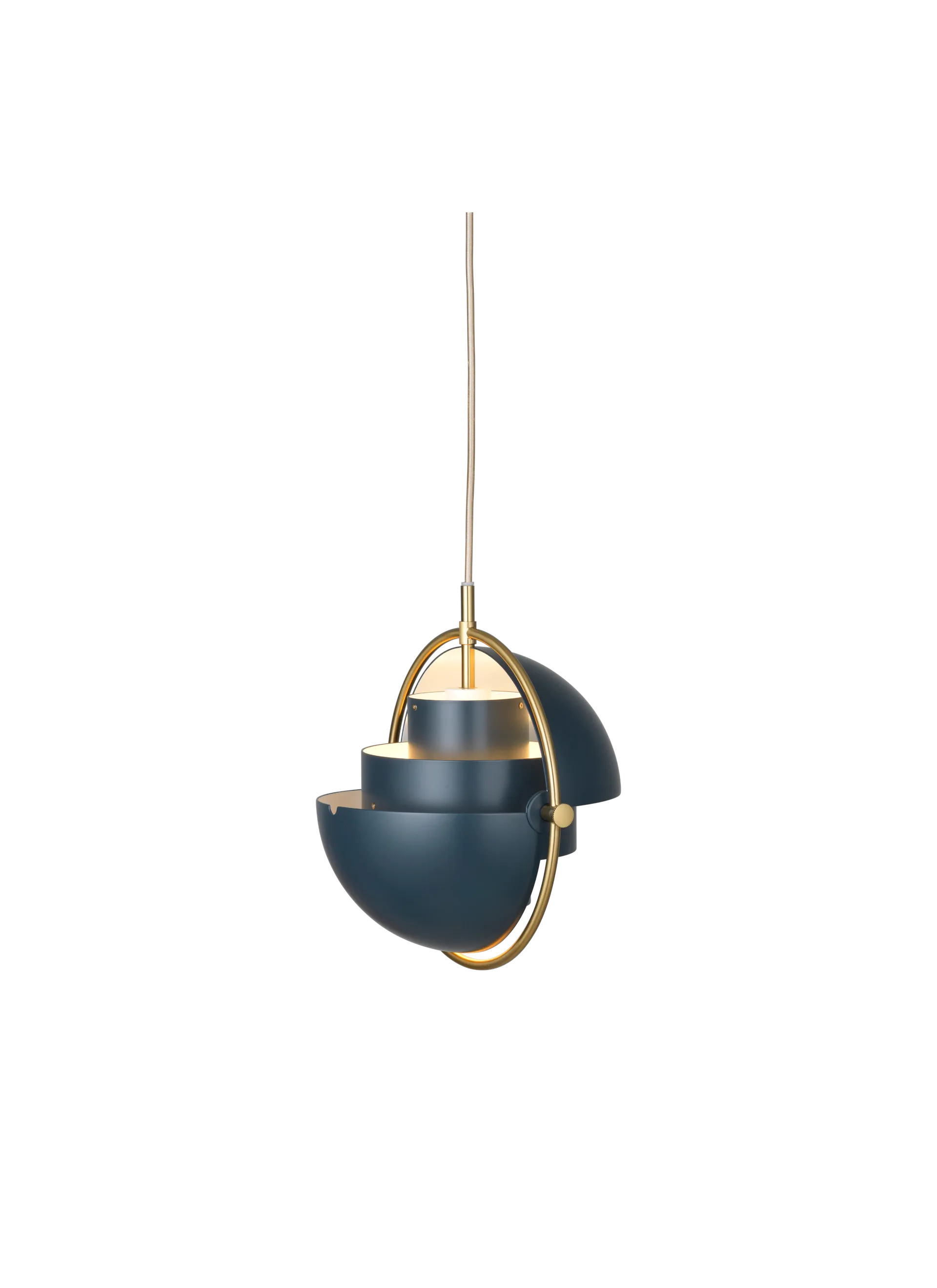 The Multi-Lite Pendant embraces the golden era of Danish design with its characteristic shape of two opposing outside, mobile shades that enable creating a personal installation and a wide range of lighting values in a room. By individually rotating the shades, the Multi-Lite Pendant can be transformed into multiple combinations where the light can be directed upwards, downwards or exude an asymmetrical art light. The Multi-Lite was first drawn in 1972 when Louis Weisdorf did an exception to his own design custom of using multiple repeating elements. Instead, it reflects his passion for diversity. Two cylindrical shapes lay the foundation of the lamp and a metal ring encompasses it and anchors the two quarter-spherical shades, which ultimately completes a picture of an iconic design with multiple purposes. The Multi-Lite Pendant has a timeless expression that fits into any domestic setting.