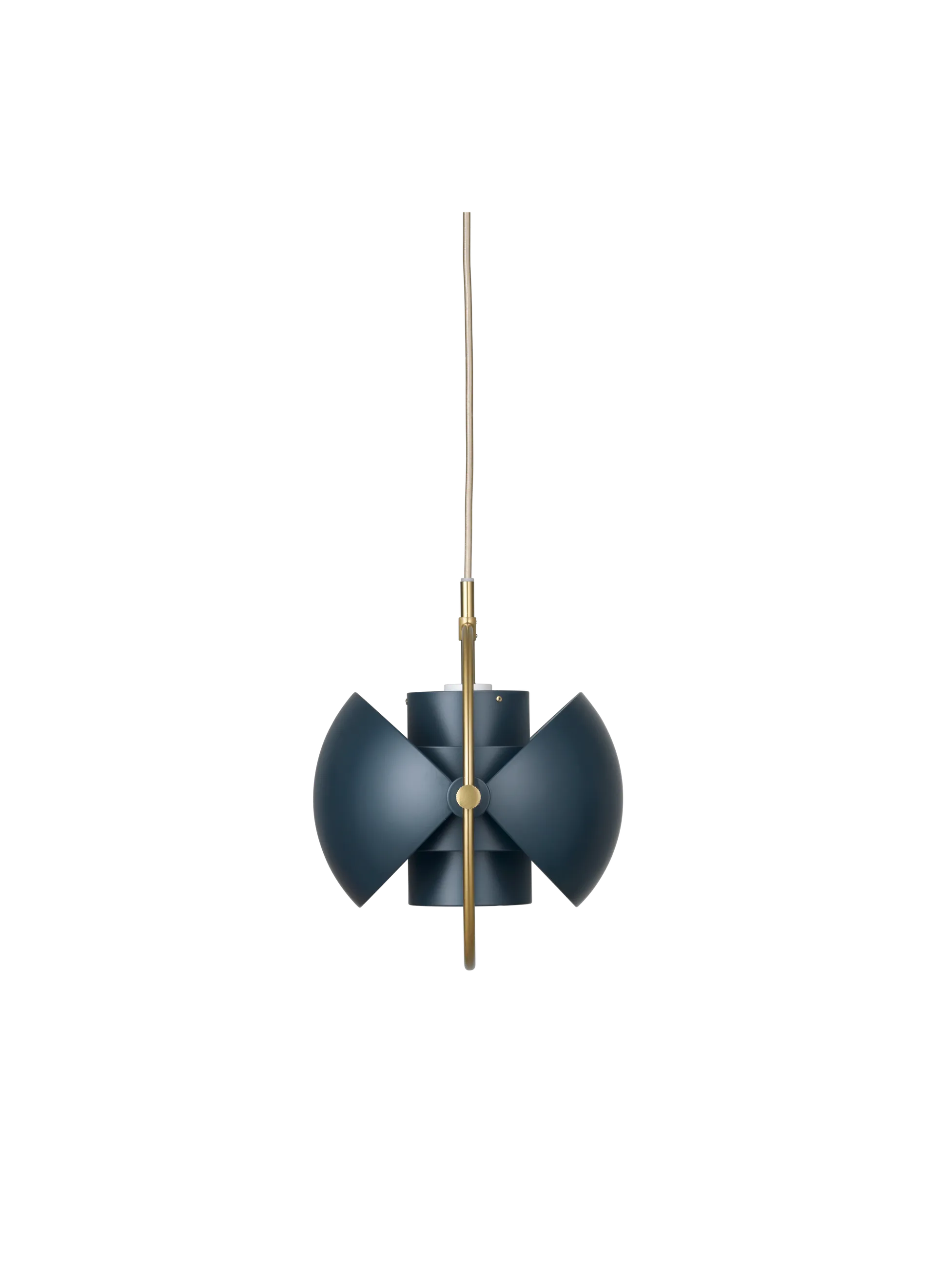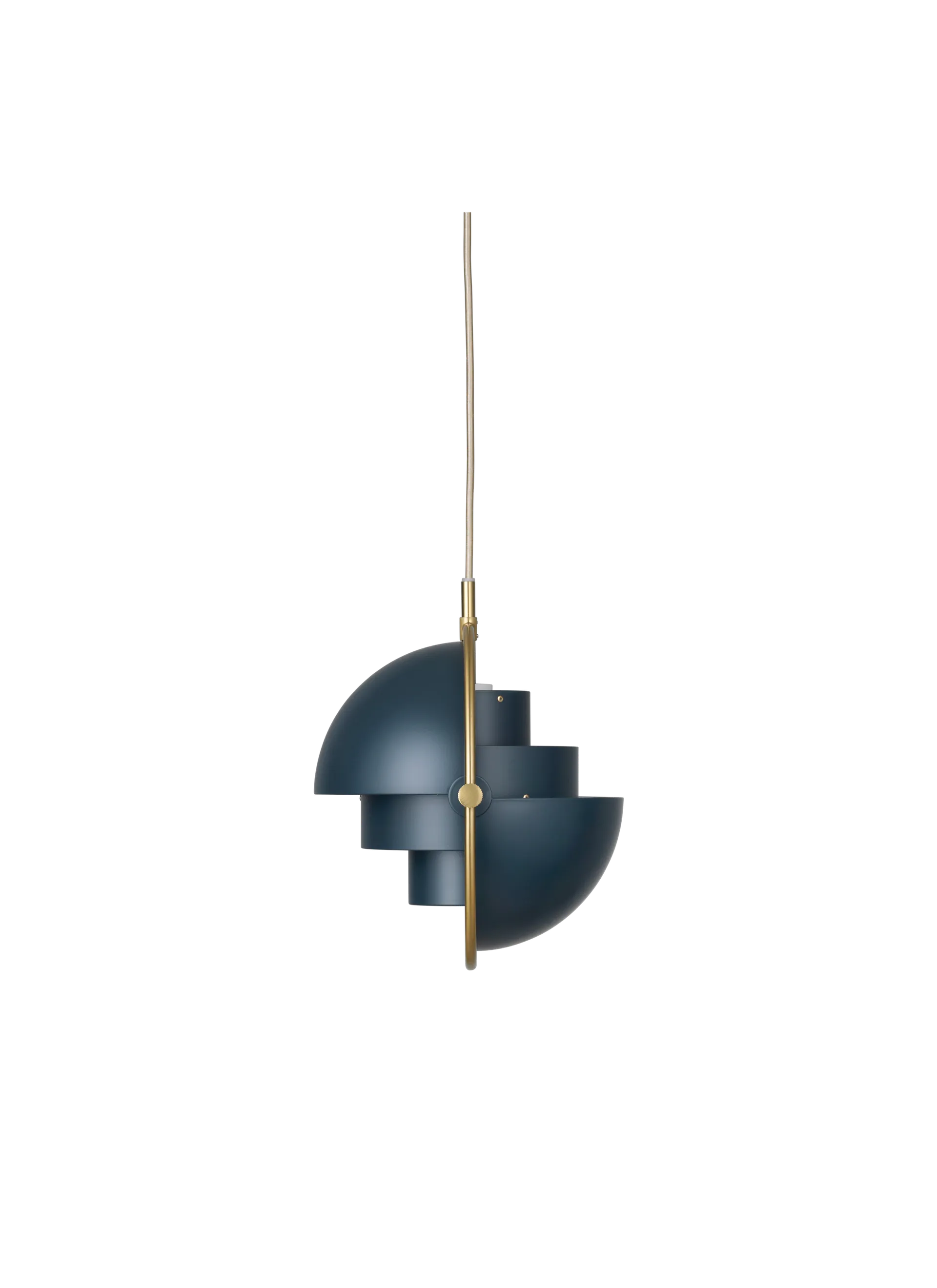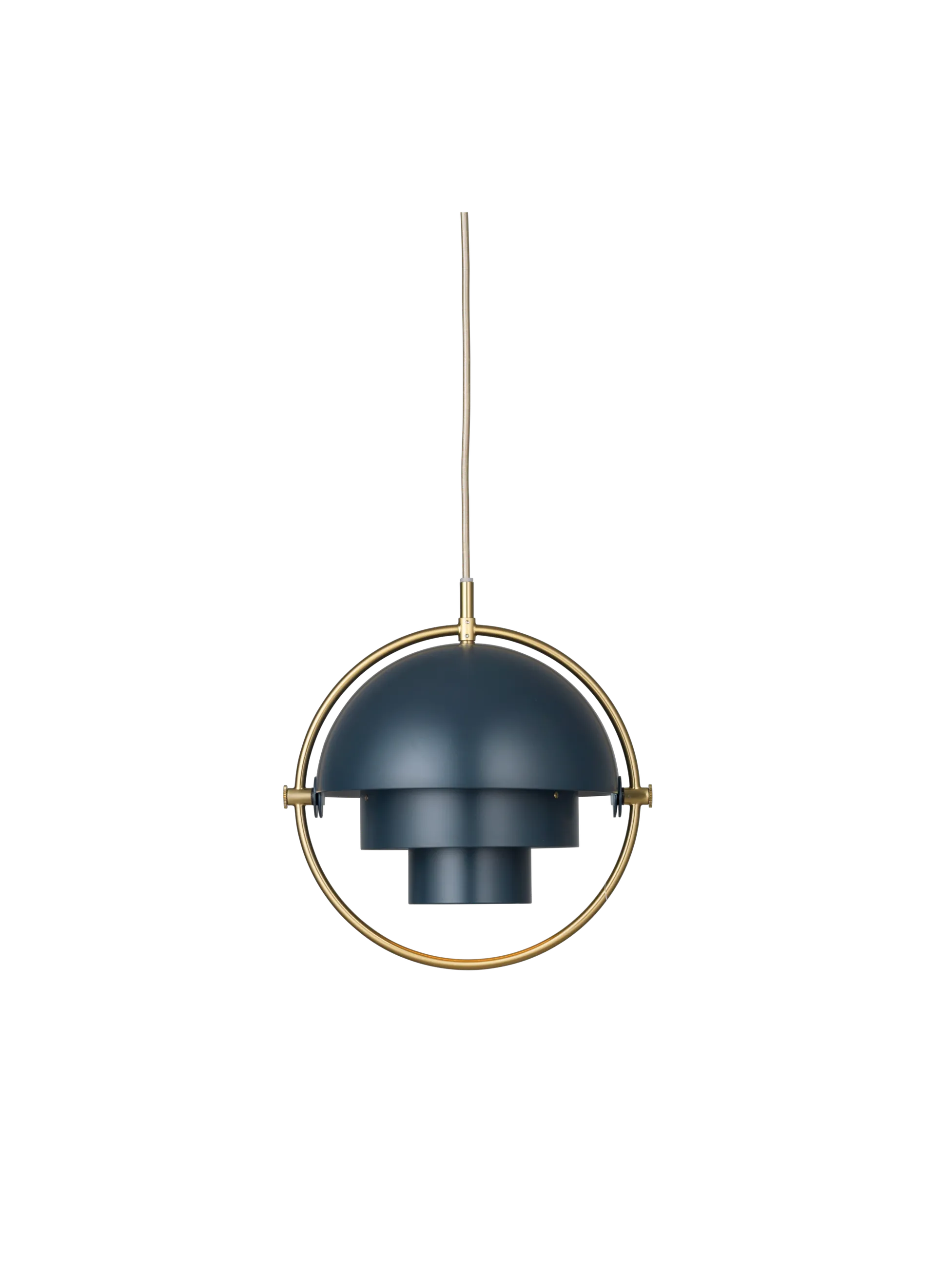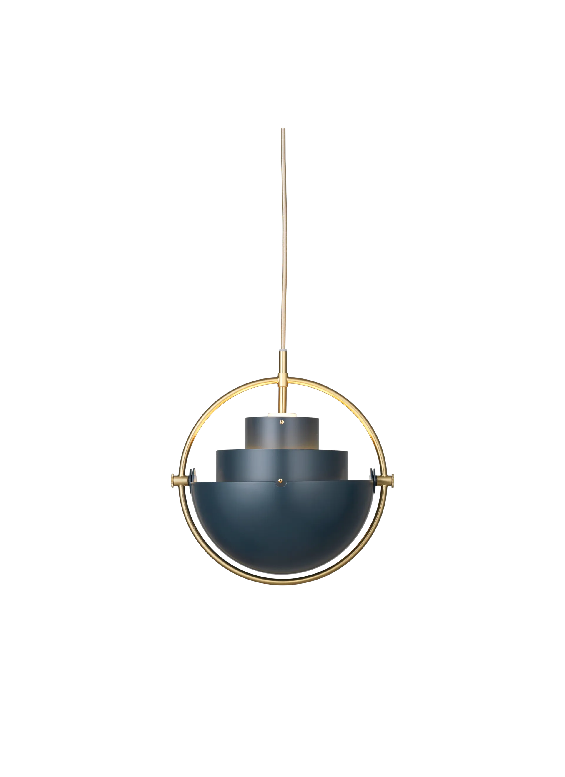 The Multi-Lite Pendant embraces the golden era of Danish design with its characteristic shape of two opposing outside, mobile shades that enable creating a personal installation and a wide range of lighting values in a room. By individually rotating the shades, the Multi-Lite Pendant can be transformed into multiple combinations where the light can be directed upwards, downwards or exude an asymmetrical art light. The Multi-Lite was first drawn in 1972 when Louis Weisdorf did an exception to his own design custom of using multiple repeating elements. Instead, it reflects his passion for diversity. Two cylindrical shapes lay the foundation of the lamp and a metal ring encompasses it and anchors the two quarter-spherical shades, which ultimately completes a picture of an iconic design with multiple purposes. The Multi-Lite Pendant has a timeless expression that fits into any domestic setting.