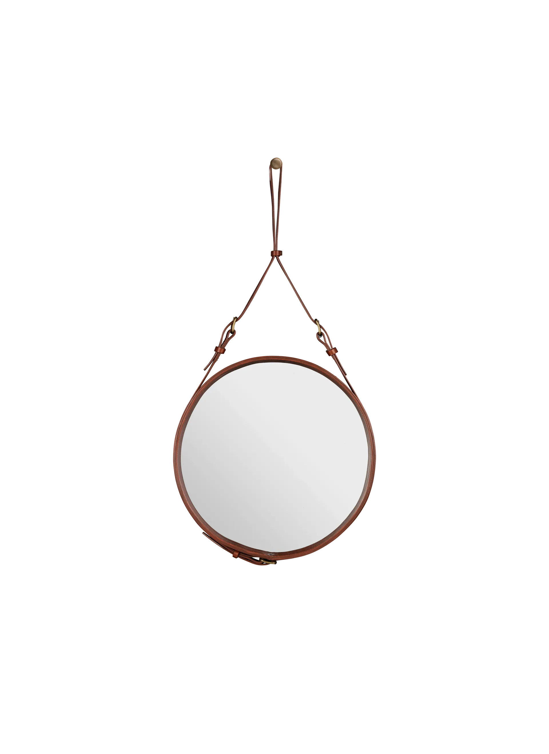 In 1950, Jacques Adnet formed a partnership with a famous French fashion house, where he developed a collection of discreet yet voluptuous leather-covered furniture and interior accessories. Known for being an innovative thinker, Adnet was one of the first designers to combine leather with glass. Accordingly, he designed the elegant, distinctive round leather mirror with equestrian inspired detailing - the Adnet Wall Mirror Circular. Besides the remarkable leather and burnished brass details, the mirror in three sizes is also unique as the strap holding the mirror is in direct proportion to the dimension of it. The timeless Adnet Wall Mirror Circular adds a sculptural value to any hallway, bathroom or living room and the three sizes can advantageously be combined to create an outstanding expression.