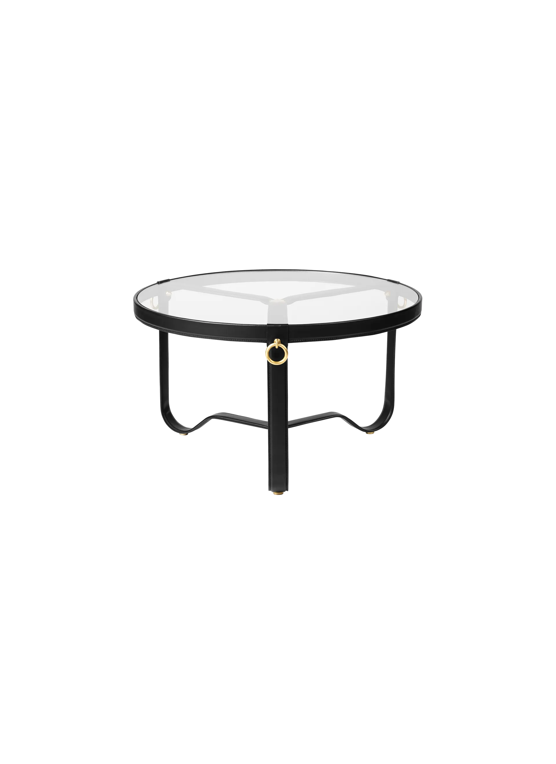 The Adnet Coffee Table Circular was originally designed by French Modernist Jacques Adnet in the 1950s. Adnet was always ahead of contemporary trends and became famous for his avant-garde designs and unusual combination of leather, metal and glass. The iconic Adnet Coffee Table Circular exemplifies everything the French architect and interior designer stands for and perfectly merges his Art Deco style with his strong commitment to functionalist principles. Placed on three soft curved metal legs, elegantly meeting in the heart of the table, the round glass top is edged with a hand-made leather rim and adorned with three gilded brass rings. The timeless design of the Adnet Coffee Table Circular embodies modern materials and superb craftsmanship and adds a distinctive value to any home or professional space.