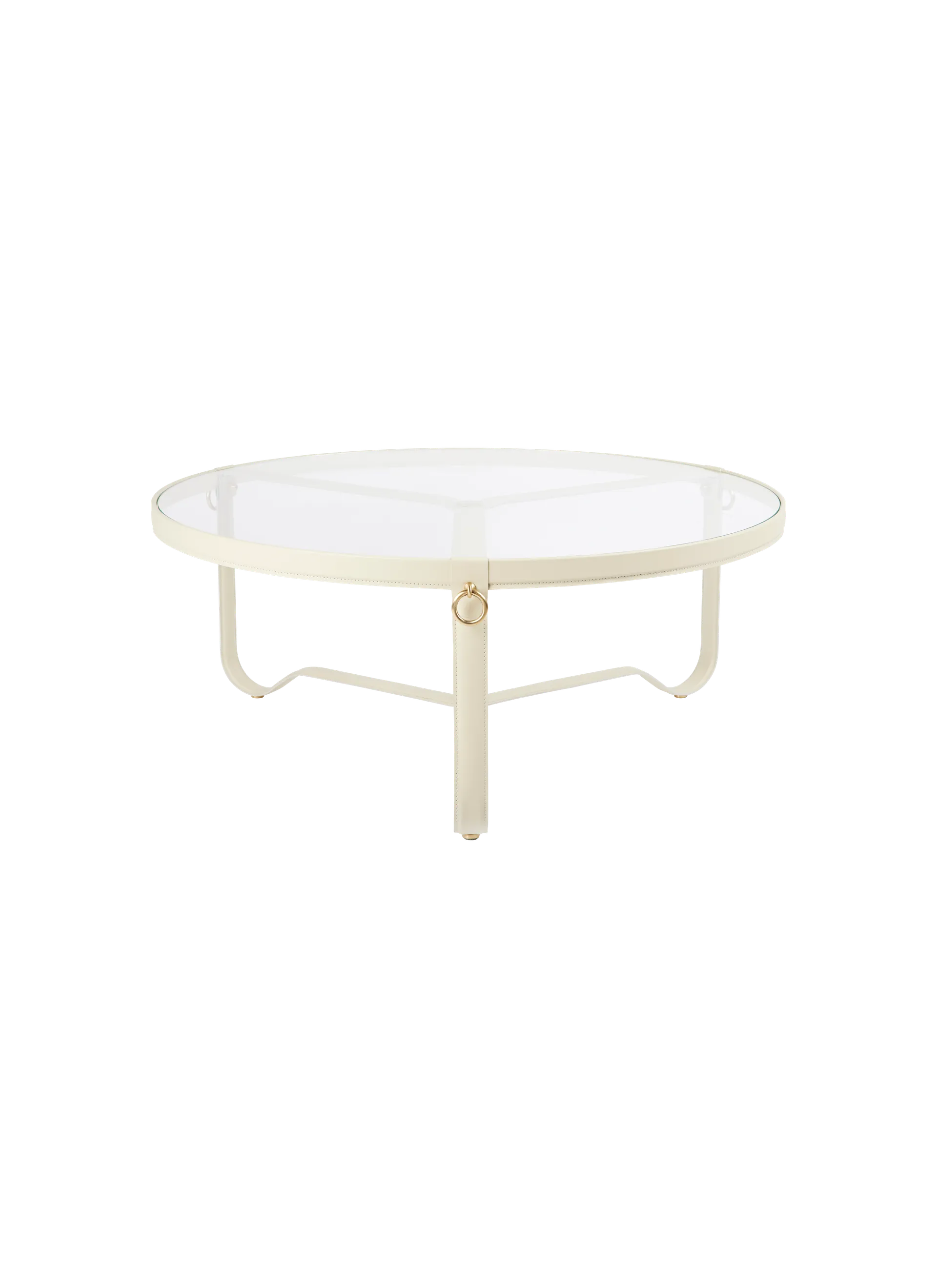 The Adnet Coffee Table Circular was originally designed by French Modernist Jacques Adnet in the 1950s. Adnet was always ahead of contemporary trends and became famous for his avant-garde designs and unusual combination of leather, metal and glass. The iconic Adnet Coffee Table Circular exemplifies everything the French architect and interior designer stands for and perfectly merges his Art Deco style with his strong commitment to functionalist principles. Placed on three soft curved metal legs, elegantly meeting in the heart of the table, the round glass top is edged with a hand-made leather rim and adorned with three gilded brass rings. The timeless design of the Adnet Coffee Table Circular embodies modern materials and superb craftsmanship and adds a distinctive value to any home or professional space.