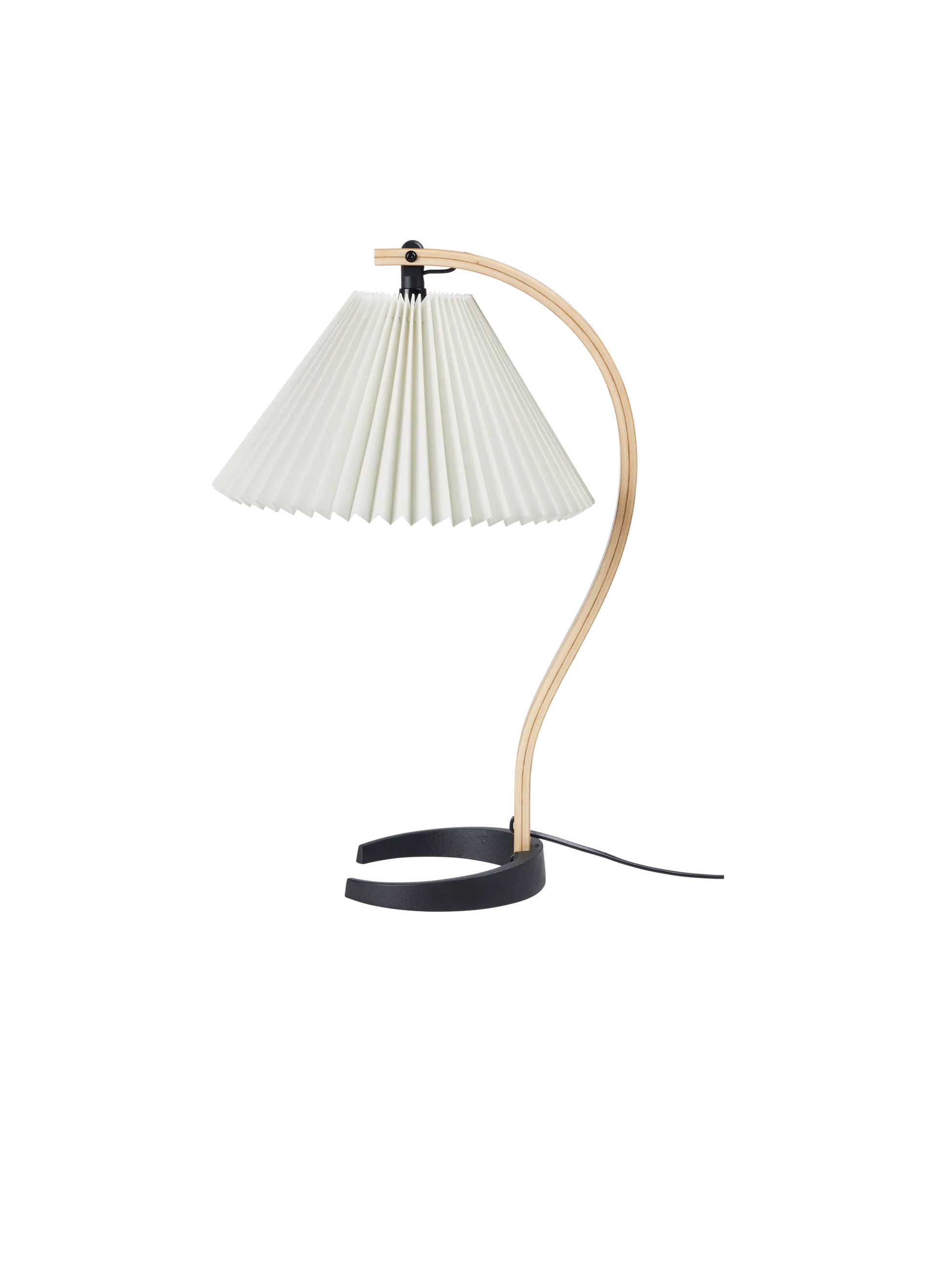 The bent-wood spine is crafted from nine alternating layers of oak and birch veneer, meticulously shaped to maintain the lamp’s elegant form. The stem is anchored in a black, crescent-shaped cast iron base, which provides both visual balance and a sturdy foundation, ensuring the lamp is as stable as it is stylish.