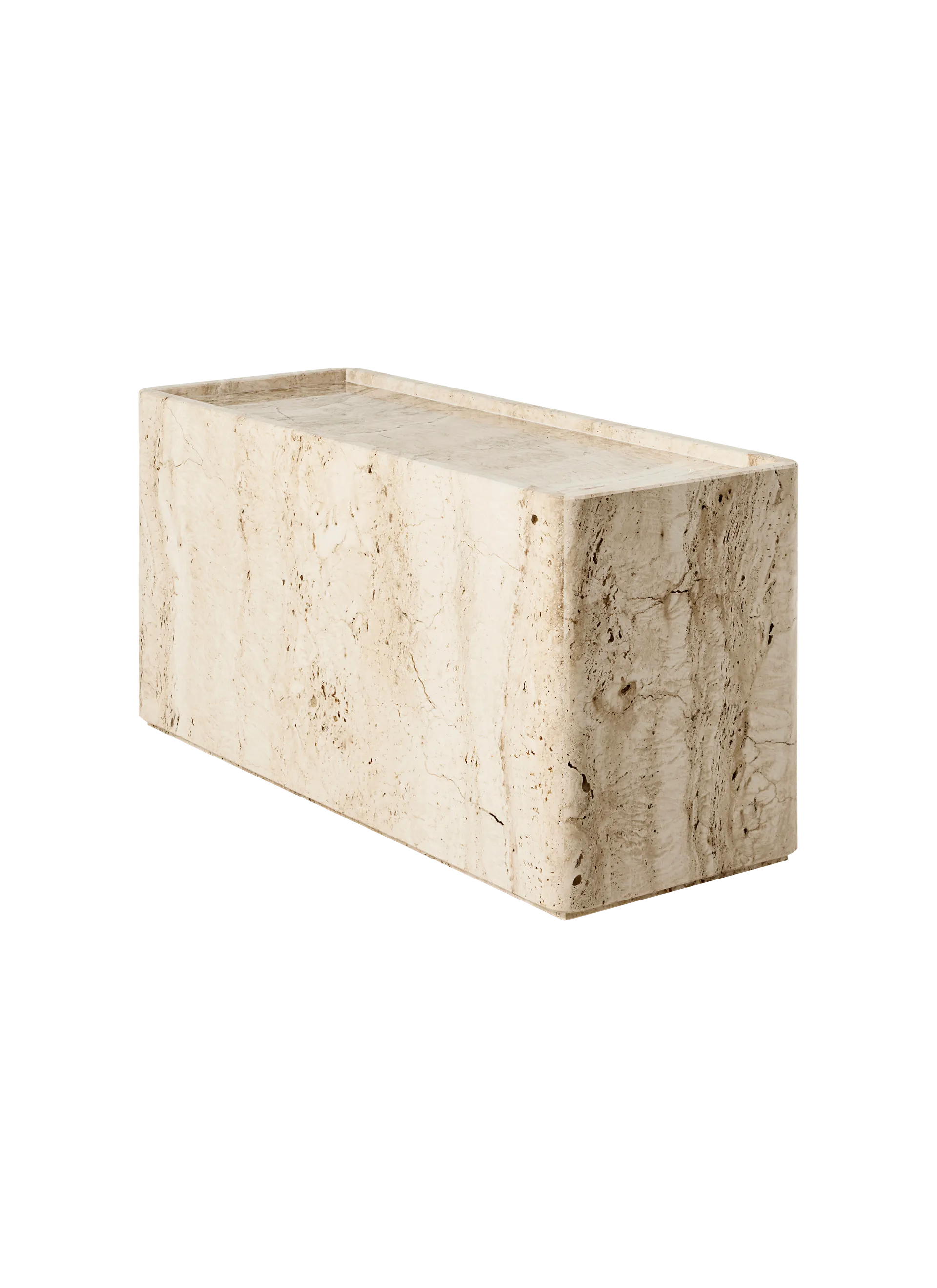 Continuing GamFratesi’s material exploration of travertine that began with the Epic and Doric Tables, the Pietra Side Tables celebrate the mesmerizing patterns found in the surface of the stone. Available in two sizes and two colors, the tables are deceptively lightweight, each constructed by hand from six pieces but resembling solid blocks. A raised lip around the gently curving edge of the tabletop creates a useful tray-like surface, ideal for displaying objects or placing a glass securely. Carefully cut, fitted, and finished, the curved edges and corners exemplify the extraordinary level of craftsmanship behind the table, and imbue the stone with a sense of softness.