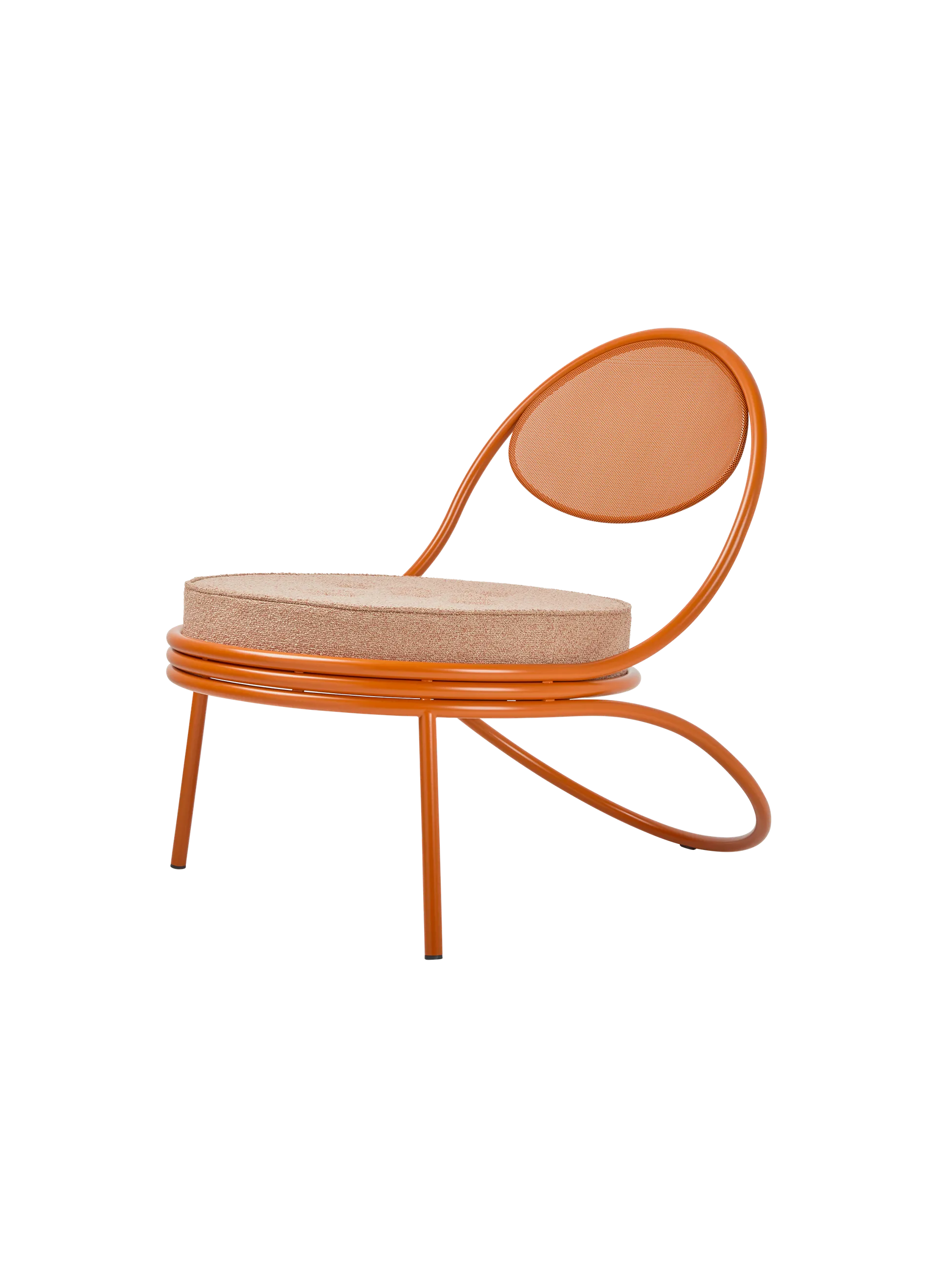 The Copacabana Lounge Chair was created in 1955 by Mathieu Matégot. The low Copacabana Lounge Chair has the impression of being designed with a single pencil stroke and the elegance of the chair resides in the continuous force of the line. It is constructed on the basis of a curved tubular frame that surrounds the round seat and the back made of the perforated metal Rigitulle sheet that often signifies the work of Matégot, ending with the continuous rear legs. The lounge chair, available in black and orange frames, is suitable for both indoor and outdoor use, depending on the fabric upholstery of the seat cushion.