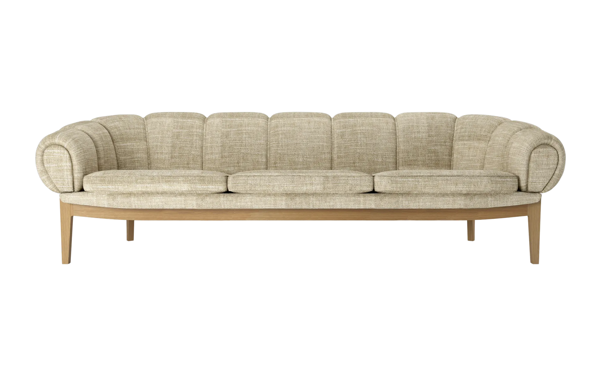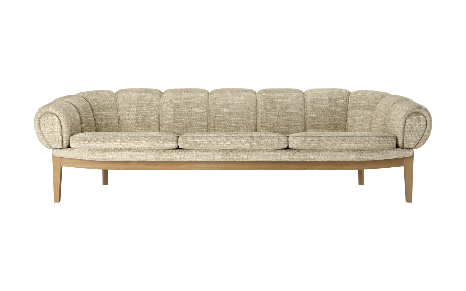 Playful, voluptuous and sublimely crafted, the newly reimagined Croissant Sofa makes a powerful statement in any interior setting and an heirloom to treasure for generations. Unmistakably the work of celebrated architect and designer Ilum Wikkelsø, the Croissant was his irreverent play on the more traditional Chesterfield sofa, using the French pastry as his inspirational reference. First released in 1962, it captured the zeitgeist of an optimistic decade, and has been a treasured collector’s piece ever since. Now GUBI has subtly refined the original to suit today’s body shapes and give a new generation the opportunity to enjoy Wikkelsø’s vision. Available in either leather or in a range of upholstered fabrics, the complex curves of the Croissant’s iconic form are achieved through meticulous hand-stitching, and sit atop a base frame and legs made from oiled walnut or oak. The Croissant Sofa’s abundance of character makes it ideal as a distinctive standalone piece in the home, workspace or hotel lobby.