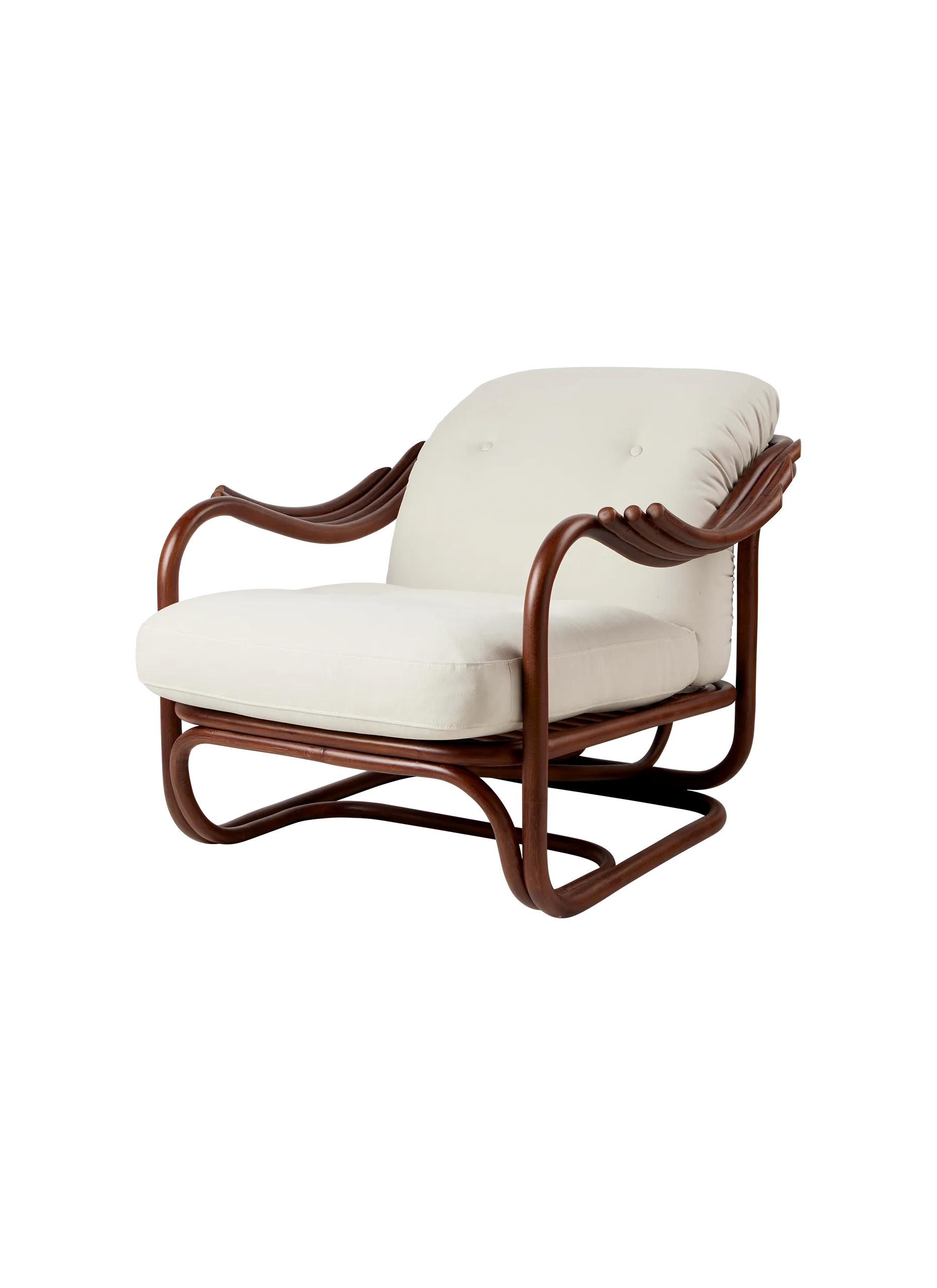 Seamlessly merging the inherent beauty and charm of natural rattan with meticulous ergonomic precision, the Poltrona Tria Lounge Chair embodies both artistry and function. Constructed almost solely from steam-bent rattan canes, curved and fixed into place by hand, it features a distinctive set of gracefully contoured armrests, creating a visually striking yet supremely comfortable seat. Enhanced by two deep-set cushions, the Poltrona Tria delivers an exceptional lounging experience in any indoor setting - while the natural material expressions bring a welcome touch of the outdoors into the home.