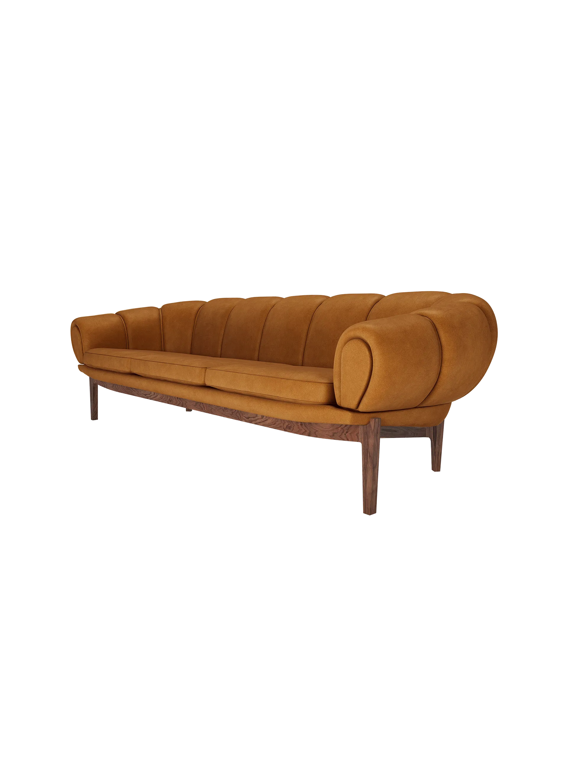Playful, voluptuous and sublimely crafted, the newly reimagined Croissant Sofa makes a powerful statement in any interior setting and an heirloom to treasure for generations. Unmistakably the work of celebrated architect and designer Ilum Wikkelsø, the Croissant was his irreverent play on the more traditional Chesterfield sofa, using the French pastry as his inspirational reference. First released in 1962, it captured the zeitgeist of an optimistic decade, and has been a treasured collector’s piece ever since. Now GUBI has subtly refined the original to suit today’s body shapes and give a new generation the opportunity to enjoy Wikkelsø’s vision. Available in either leather or in a range of upholstered fabrics, the complex curves of the Croissant’s iconic form are achieved through meticulous hand-stitching, and sit atop a base frame and legs made from oiled walnut or oak. The Croissant Sofa’s abundance of character makes it ideal as a distinctive standalone piece in the home, workspace or hotel lobby.