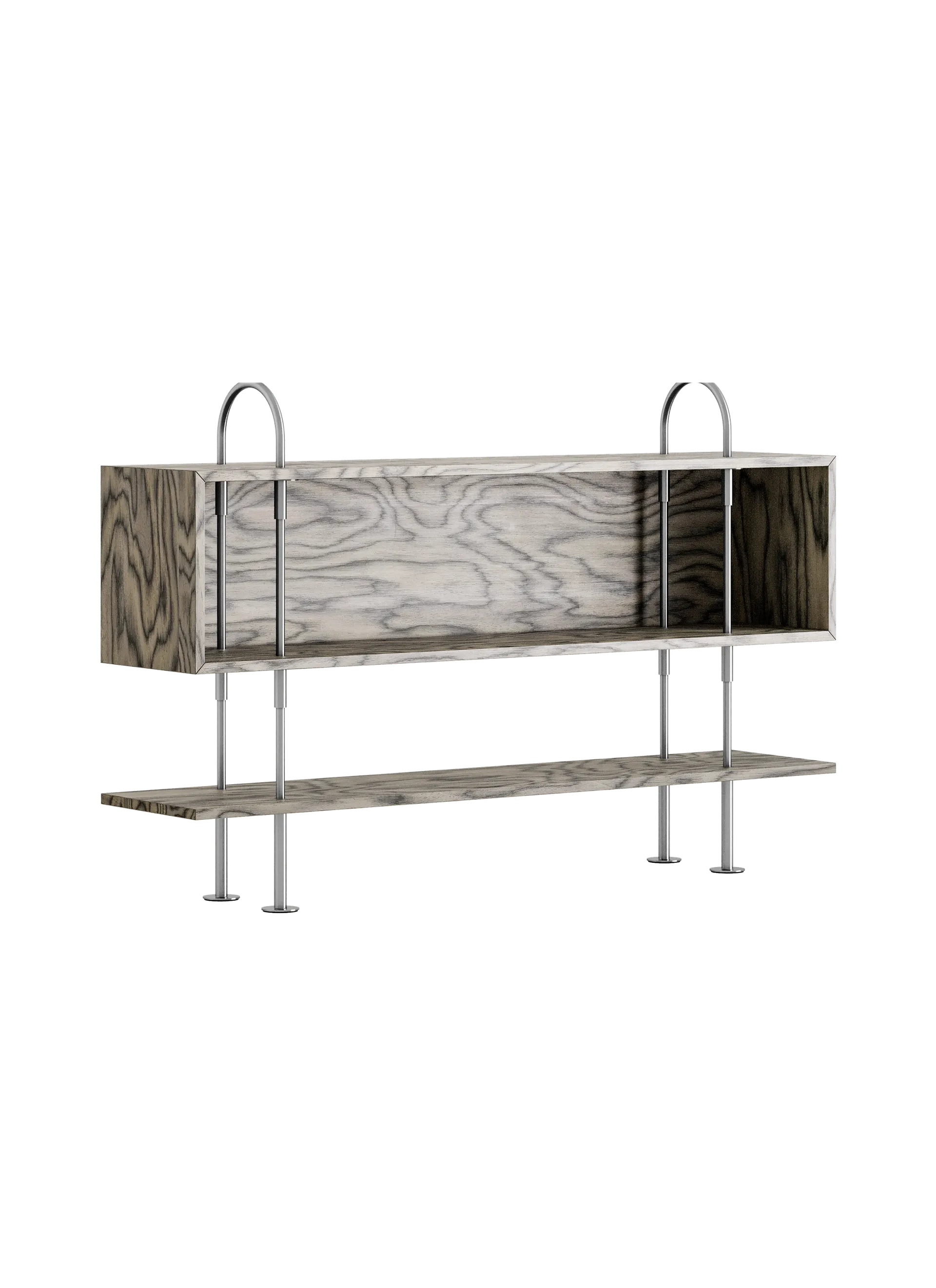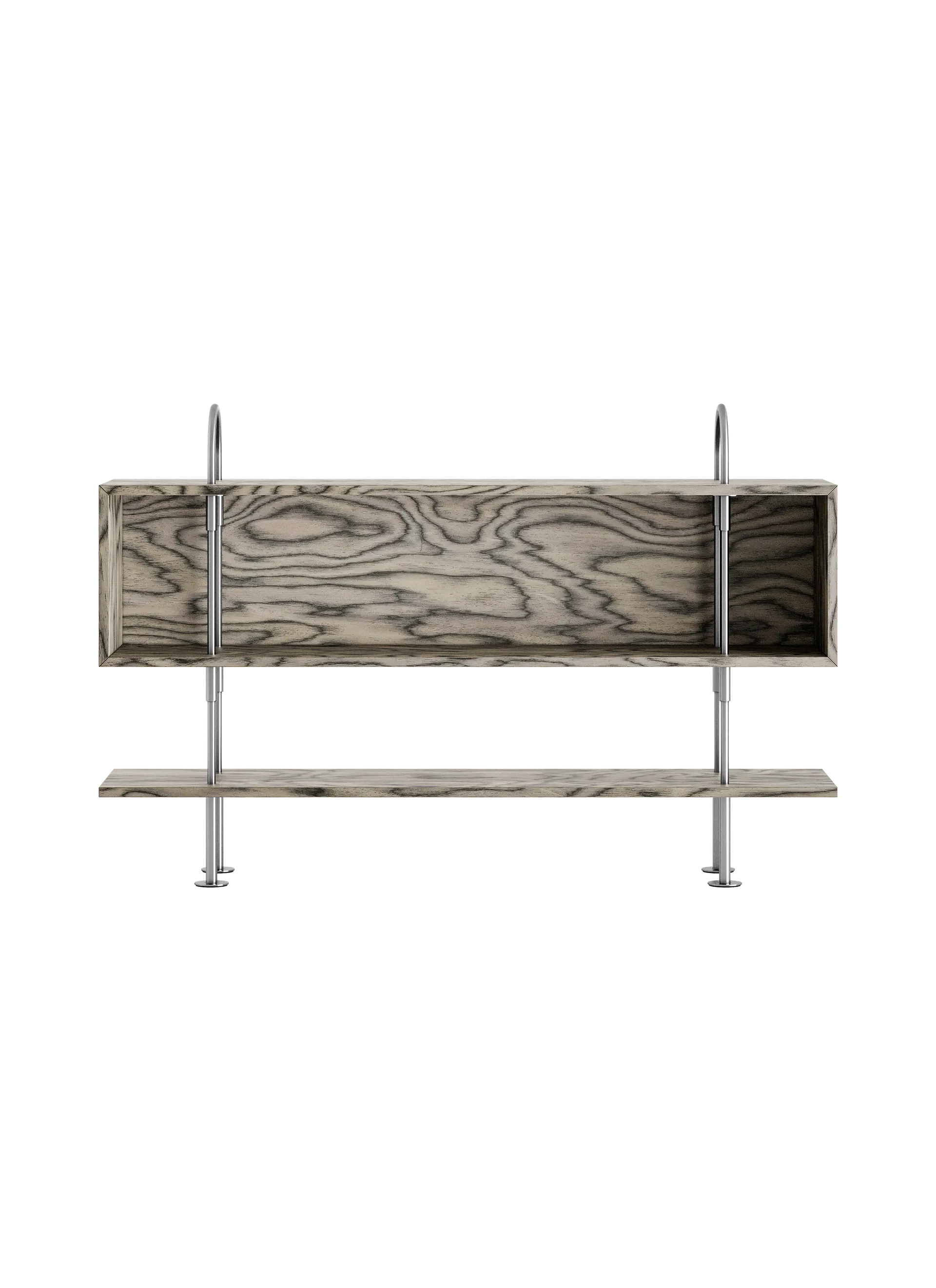 The FSC®-certified black-brown stained ash is the darkest shelf option, offering a quietly confident foundation that supports both utility and visual calm, while the ALPI Sottsass Gray veneer (FSC® C176589) introduces an unexpected softness and tactile depth, with its swirling, almost fabric like patterned gray surface. For a more sculptural and modern aesthetic, cool-gray tinted-glass shelves add semi transparent layers that emphasize Keen’s structural rhythm and playful expressiveness.
