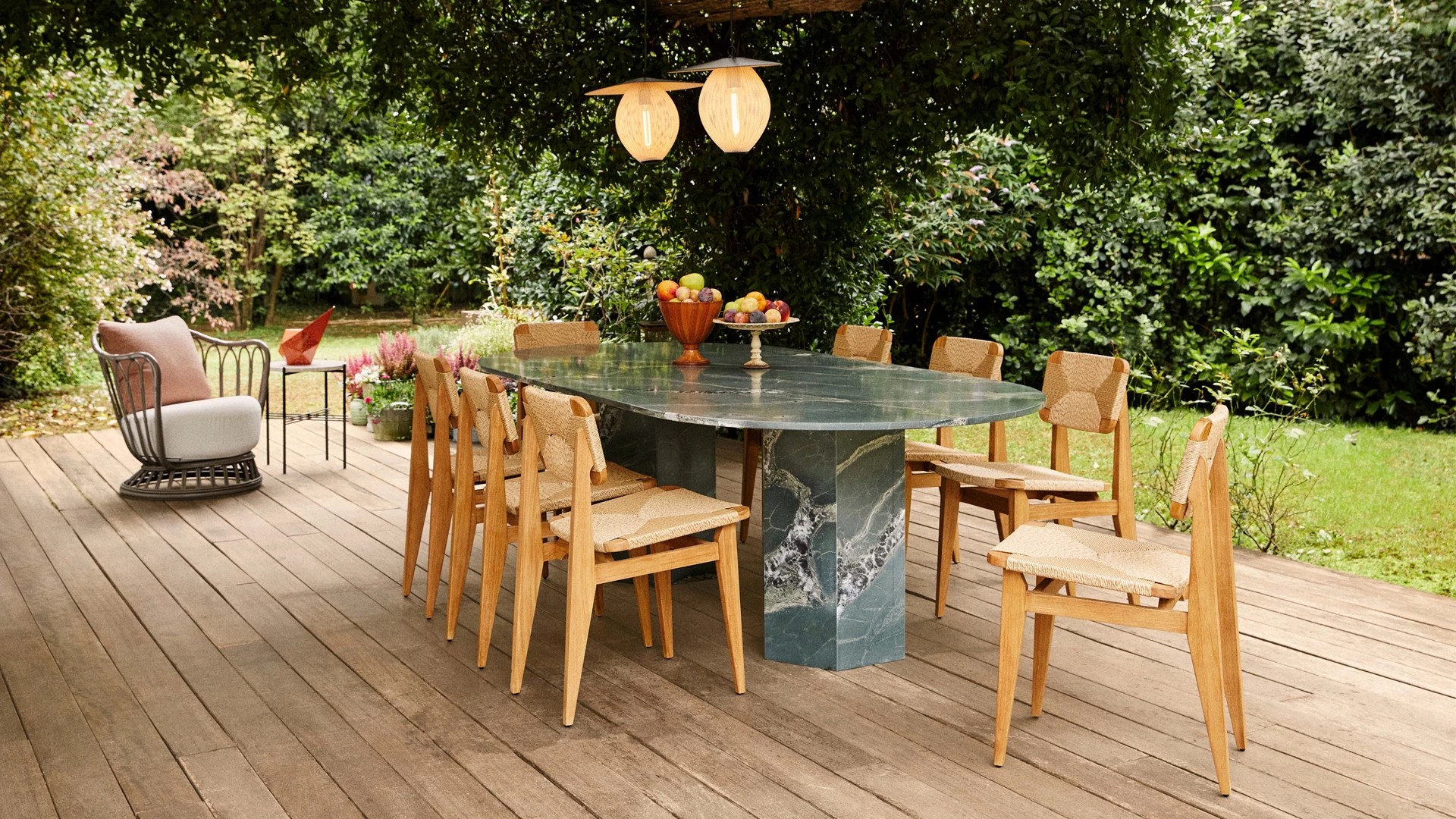 The C-Chair optimized for the outdoors in both ergonomics and materiality. Proportions have been fine-tuned to maximize comfort and frames have been carefully crafted with traditional joinery using plantation teak. The seats and backrests are tightly woven from an outdoor all-weather fiber made of an extruded polyethylene and twisted to resemble natural hyacinth woven furniture.