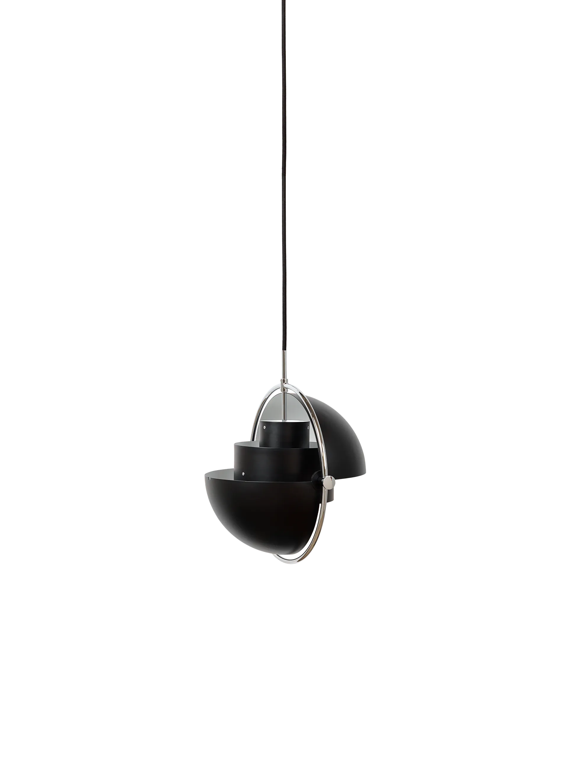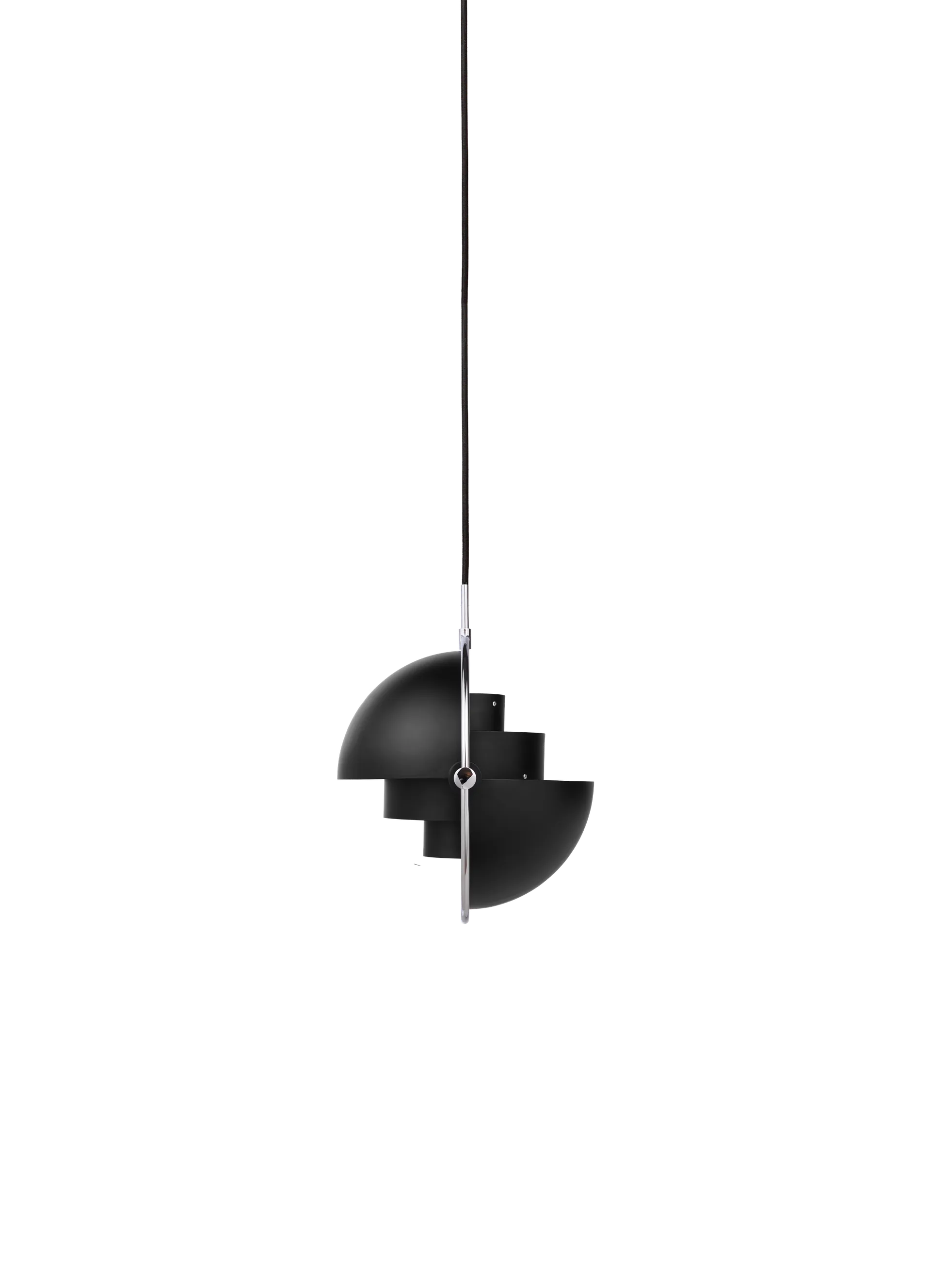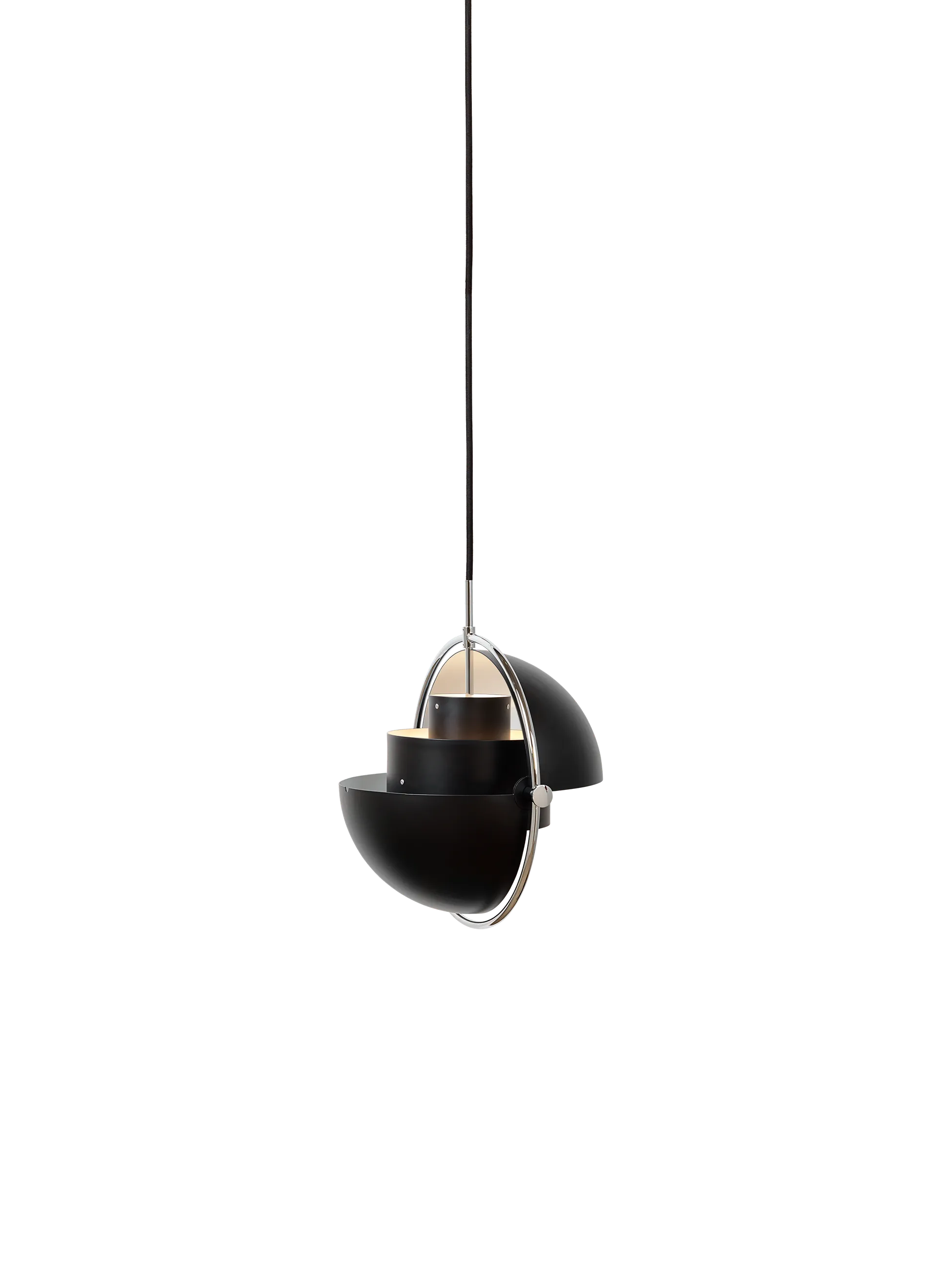 The Multi-Lite Pendant embraces the golden era of Danish design with its characteristic shape of two opposing outside, mobile shades that enable creating a personal installation and a wide range of lighting values in a room. By individually rotating the shades, the Multi-Lite Pendant can be transformed into multiple combinations where the light can be directed upwards, downwards or exude an asymmetrical art light. The Multi-Lite was first drawn in 1972 when Louis Weisdorf did an exception to his own design custom of using multiple repeating elements. Instead, it reflects his passion for diversity. Two cylindrical shapes lay the foundation of the lamp and a metal ring encompasses it and anchors the two quarter-spherical shades, which ultimately completes a picture of an iconic design with multiple purposes. The Multi-Lite Pendant has a timeless expression that fits into any domestic setting.