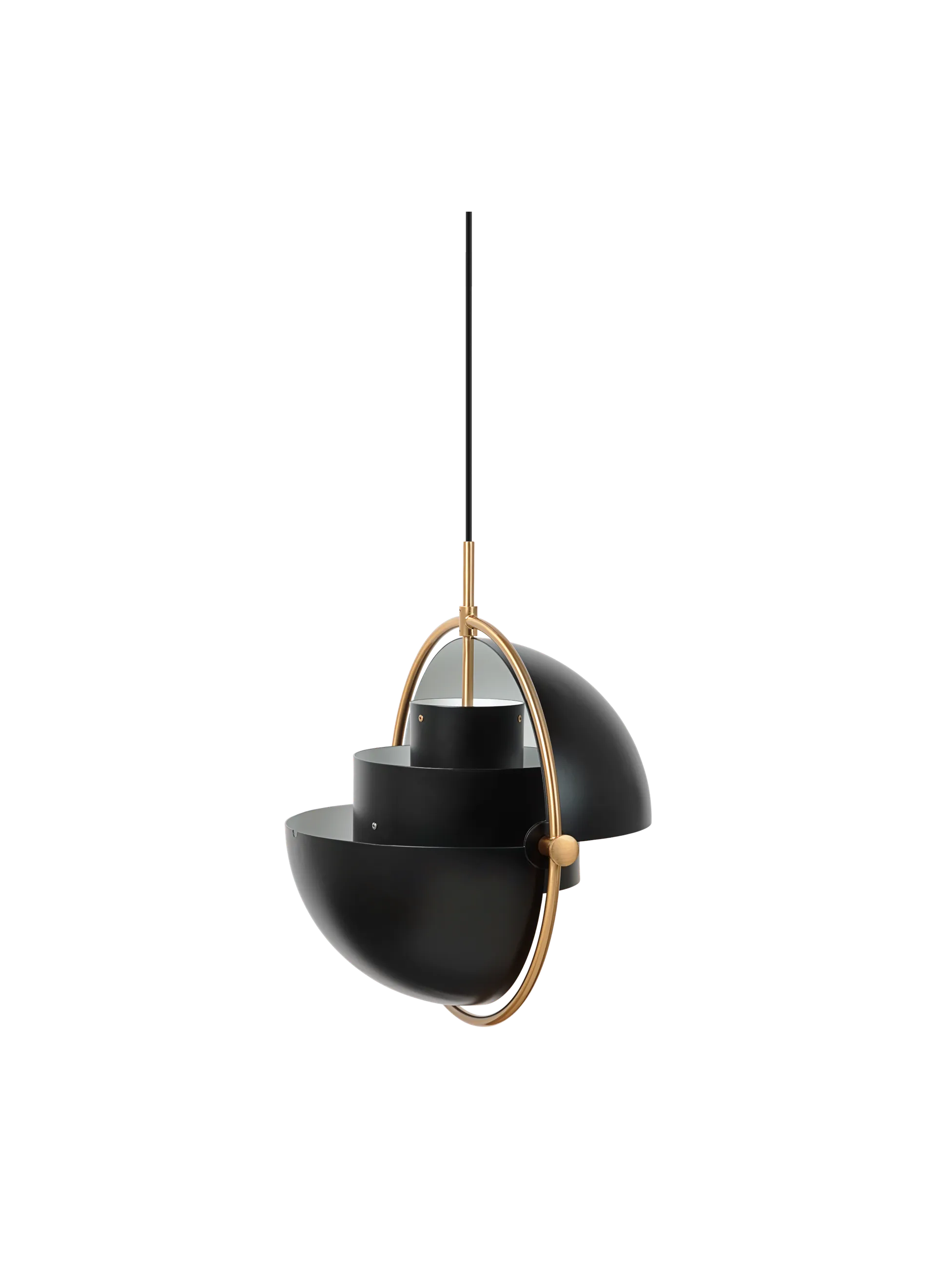 The Multi-Lite Pendant embraces the golden era of Danish design with its characteristic shape of two opposing outside, mobile shades that enable creating a personal installation and a wide range of lighting values in a room. By individually rotating the shades, the Multi-Lite Pendant can be transformed into multiple combinations where the light can be directed upwards, downwards or exude an asymmetrical art light. The Multi-Lite was first drawn in 1972 when Louis Weisdorf did an exception to his own design custom of using multiple repeating elements. Instead, it reflects his passion for diversity. Two cylindrical shapes lay the foundation of the lamp and a metal ring encompasses it and anchors the two quarter-spherical shades, which ultimately completes a picture of an iconic design with multiple purposes. The Multi-Lite Pendant has a timeless expression that fits into any domestic setting.