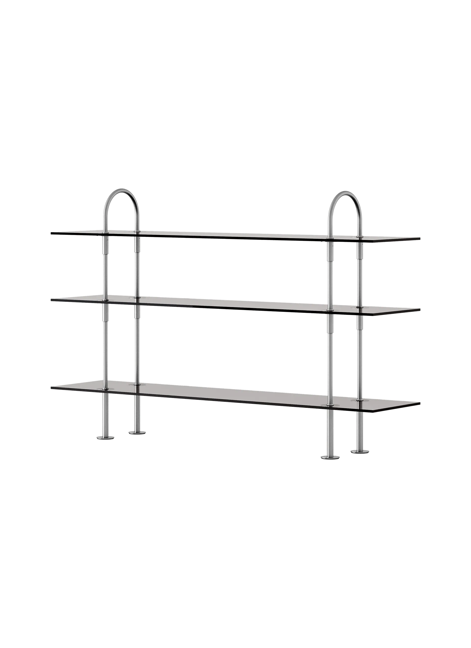 The core components of the system are vertical metal rods, three lengths of open shelf, an enclosed box shelf, feet for the bottom, and soft arches at the top. The connectors enable the unit to be extended vertically by adding more rods and shelves, with each rod piercing the shelf above through a specially engineered connector bracket.