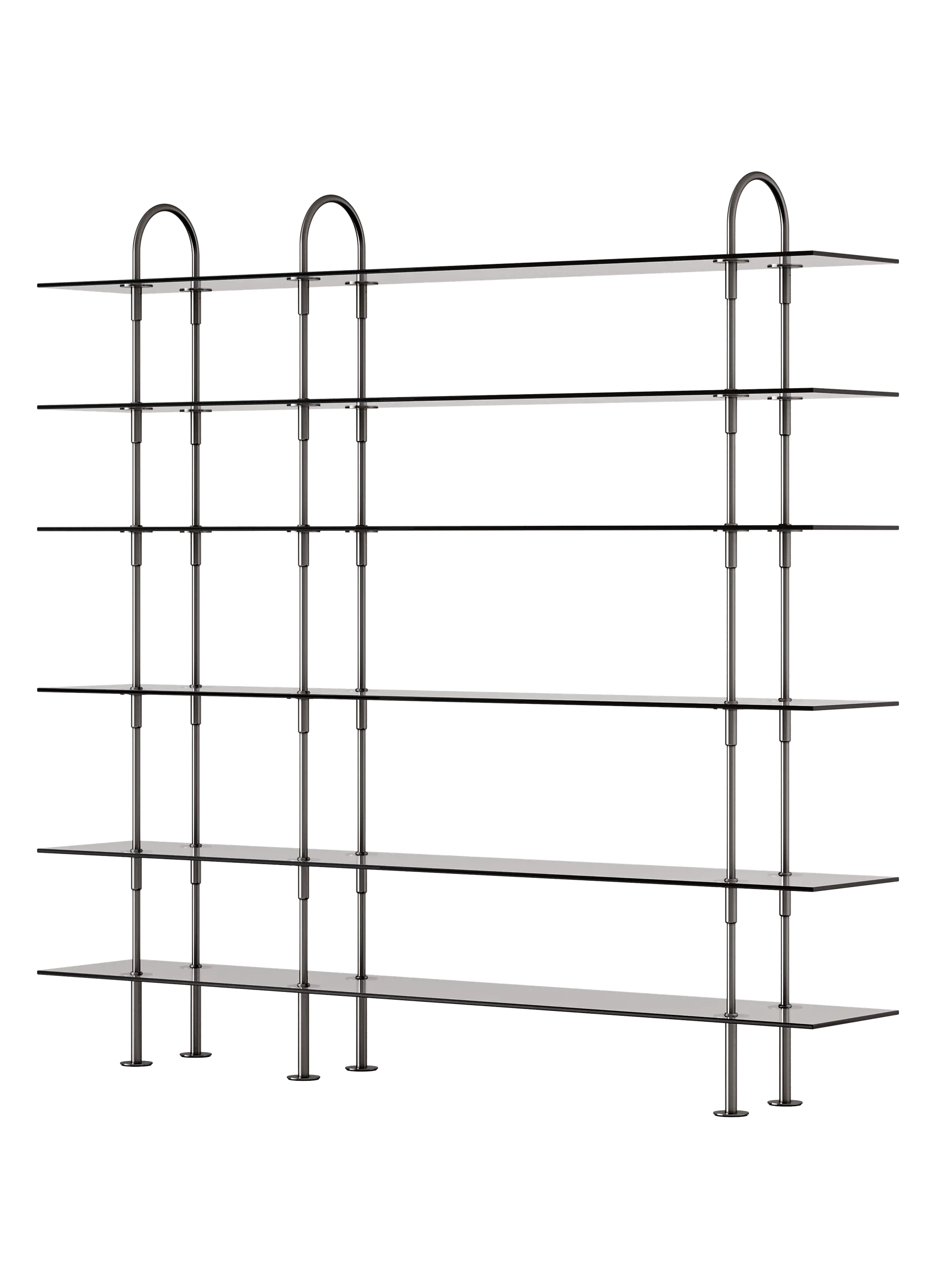 The core components of the system are vertical metal rods, three lengths of open shelf, an enclosed box shelf, feet for the bottom, and soft arches at the top. The connectors enable the unit to be extended vertically by adding more rods and shelves, with each rod piercing the shelf above through a specially engineered connector bracket.