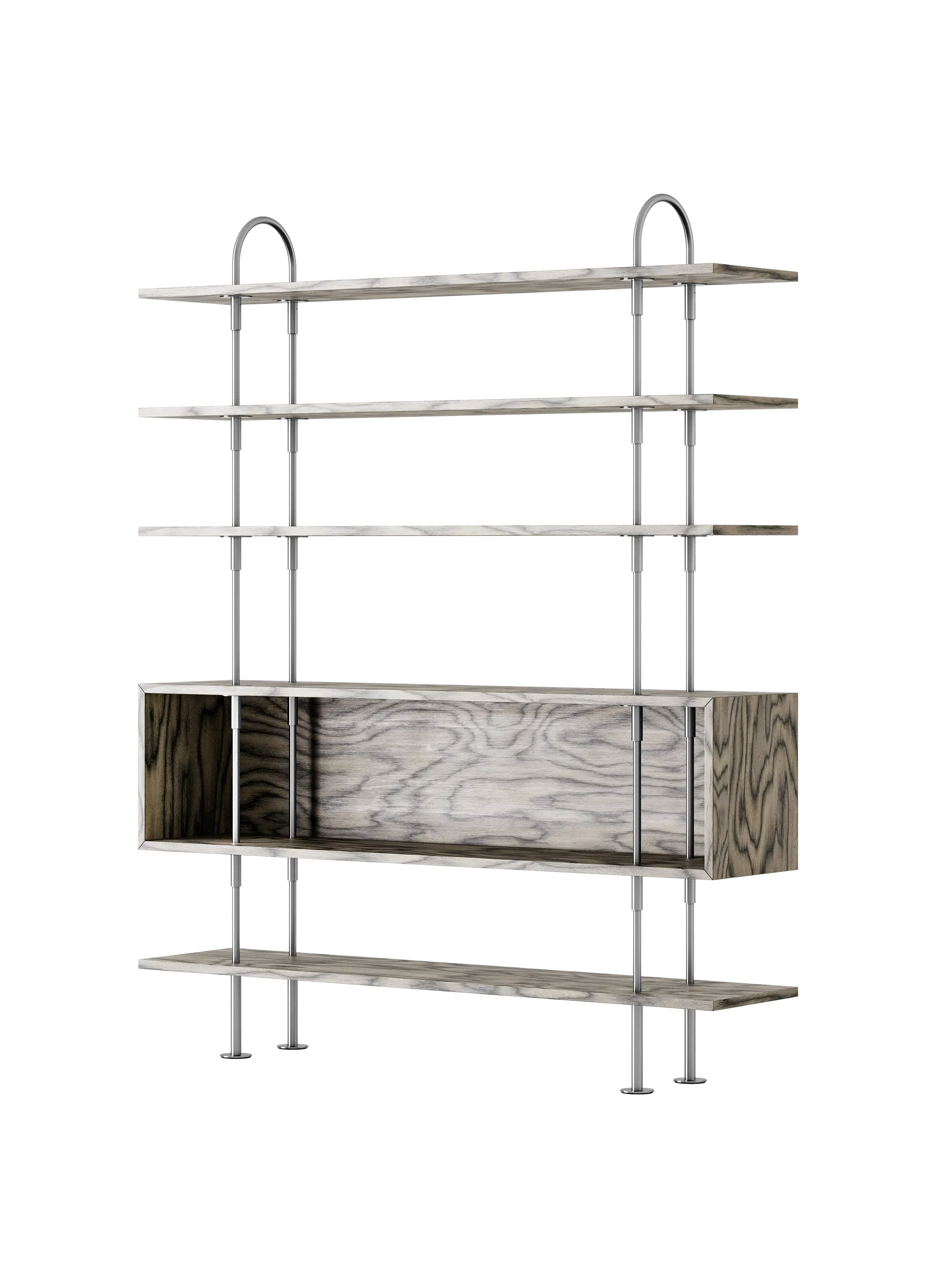 The core components of the system are vertical metal rods, three lengths of open shelf, an enclosed box shelf, feet for the bottom, and soft arches at the top. The connectors enable the unit to be extended vertically by adding more rods and shelves, with each rod piercing the shelf above through a specially engineered connector bracket.