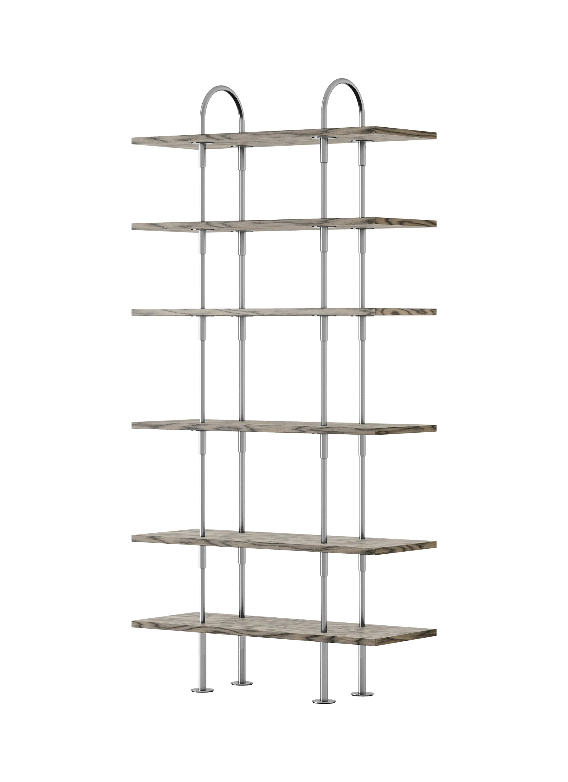 The core components of the system are vertical metal rods, three lengths of open shelf, an enclosed box shelf, feet for the bottom, and soft arches at the top. The connectors enable the unit to be extended vertically by adding more rods and shelves, with each rod piercing the shelf above through a specially engineered connector bracket.