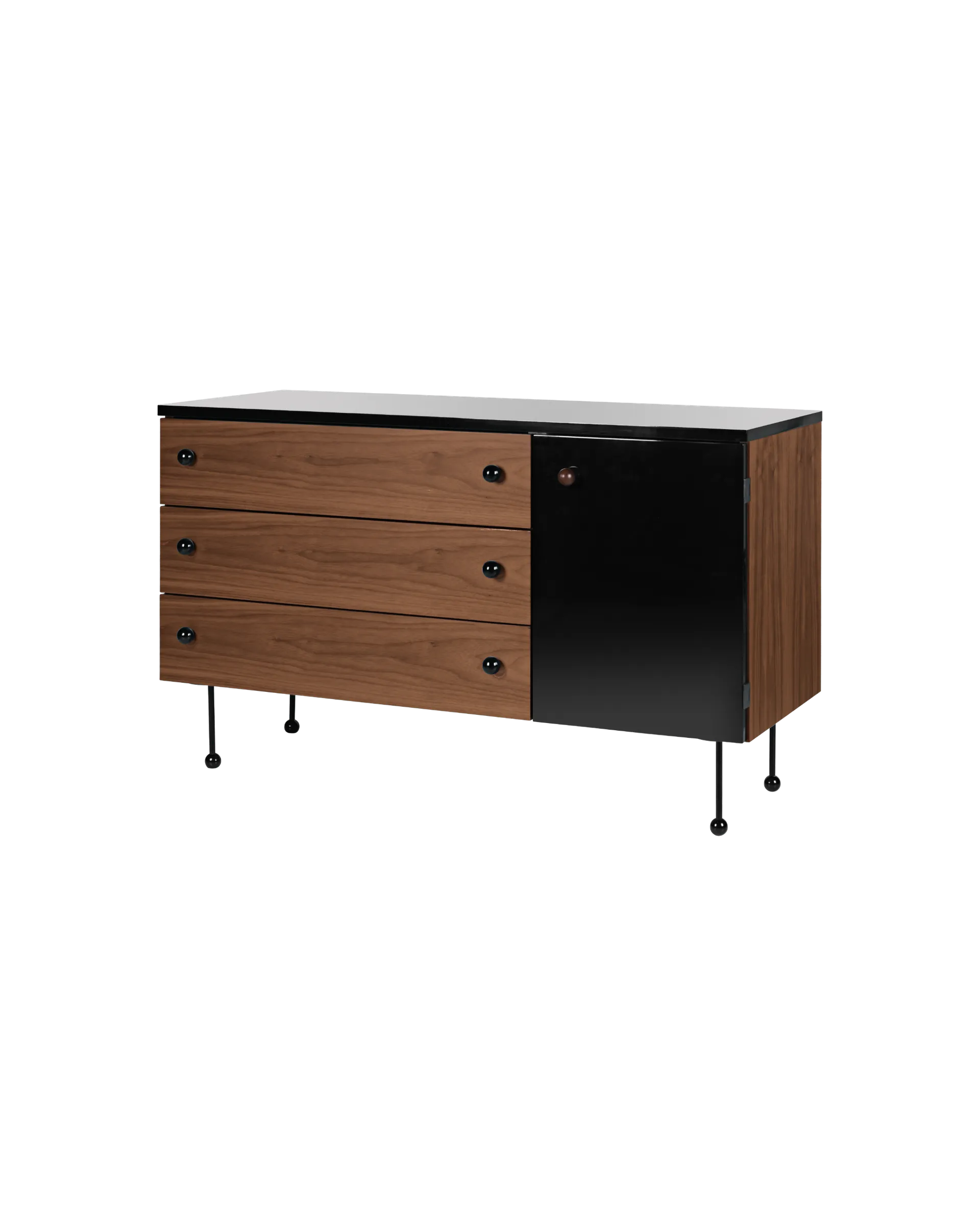 Designed in 1952 by Greta M. Grossman, but named the 62 Sideboard as it was deemed to be ten years ahead of its time. The sideboard illustrates the designer’s penchant for exceptional shapes and unusual pairing of materials. The slender metal legs with ball-shaped feet, a characteristic trait of Grossman, contrasts the sharp rectangular shape in luxurious American walnut, giving the furniture a characteristic appearance of lightness and almost seeming to defy gravity. Adding to its elegance, the sideboard is provided with a deep, black full gloss finish on the tabletop and small solid wooden spheres.