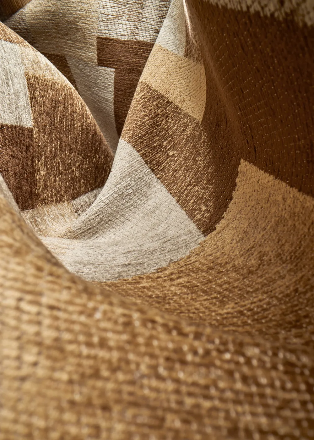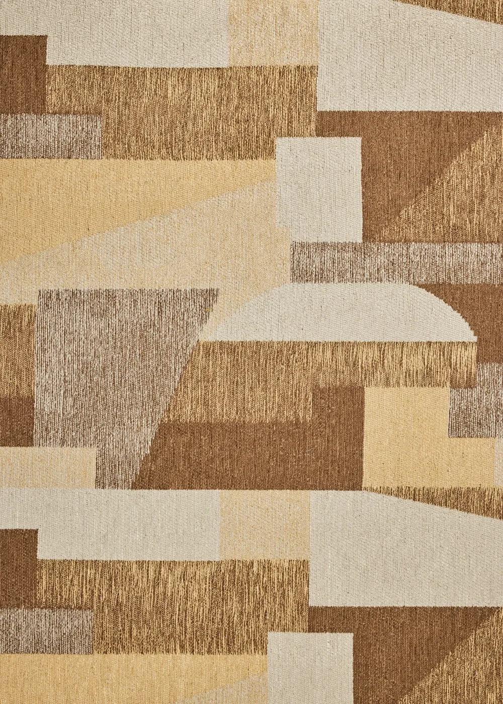 Combining expressive geometric looks with a velvet-like texture, new-to-GUBI Dadja is woven from soft and thin chenille yarn. It is available in two colorways – one a medley of rich browns and caramels, the other a more subtle blend of mocha and soft earth tones. In both, the calm and elegant colors combine to create an abstract play of shapes and volumes. The characterful design enhances the natural movement of the yarn, lending a distinctive tactility to each shape, and ensuring the fabric has a striking visual identity.