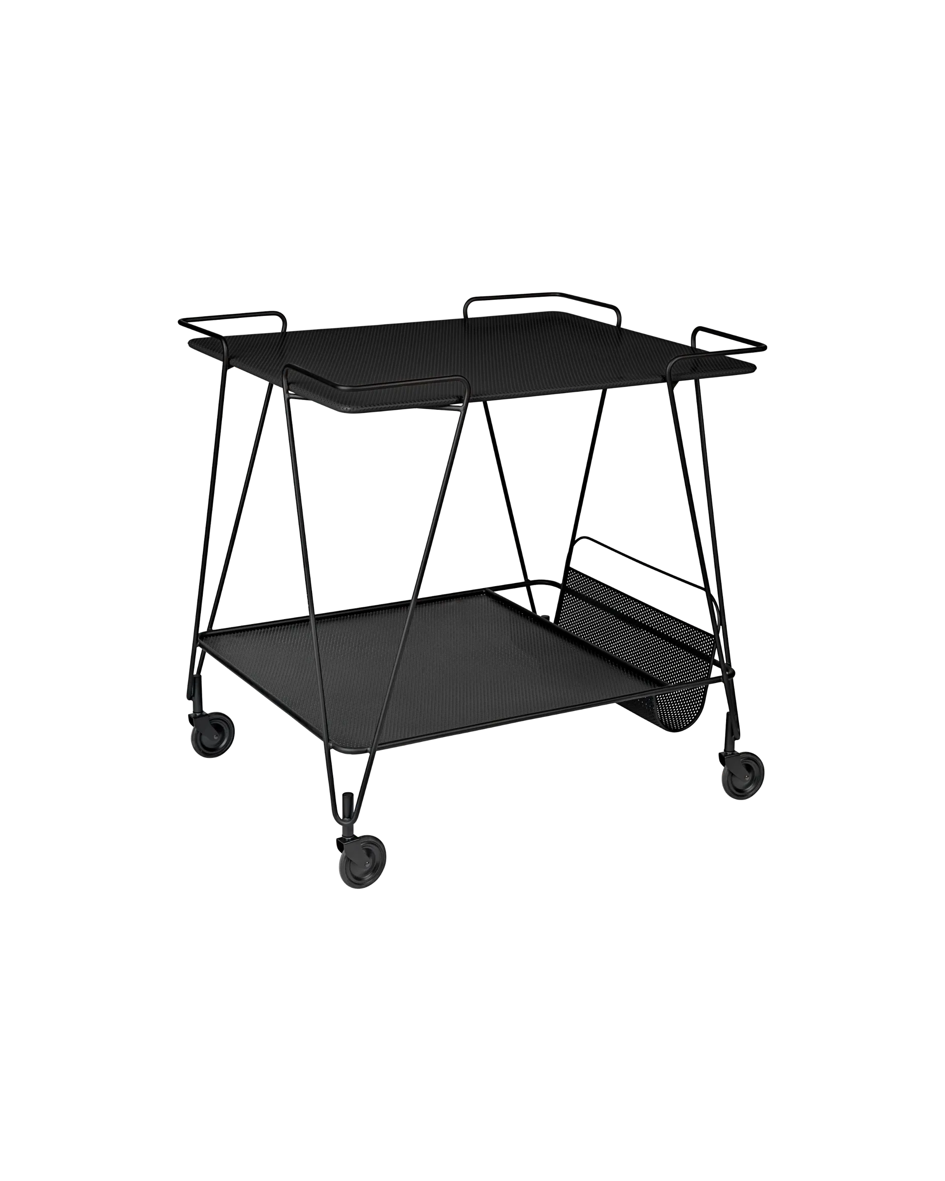 The master and founder of the innovative and groundbreaking technique Rigitulle, where perforated metal is combined with metal tubing, Mathieu Matégot, designed his tea trolley between 1953 and 1954. The spacious Matégot Trolley is adorned with two trays, the upper available in the different colours and the lower in black and includes a newspaper holder that proves, with its bent metal design, the technique's strength of being flexible as tulle and strong as metal. The lightness it evokes is improved by its rolling castors and makes it float along the floor.