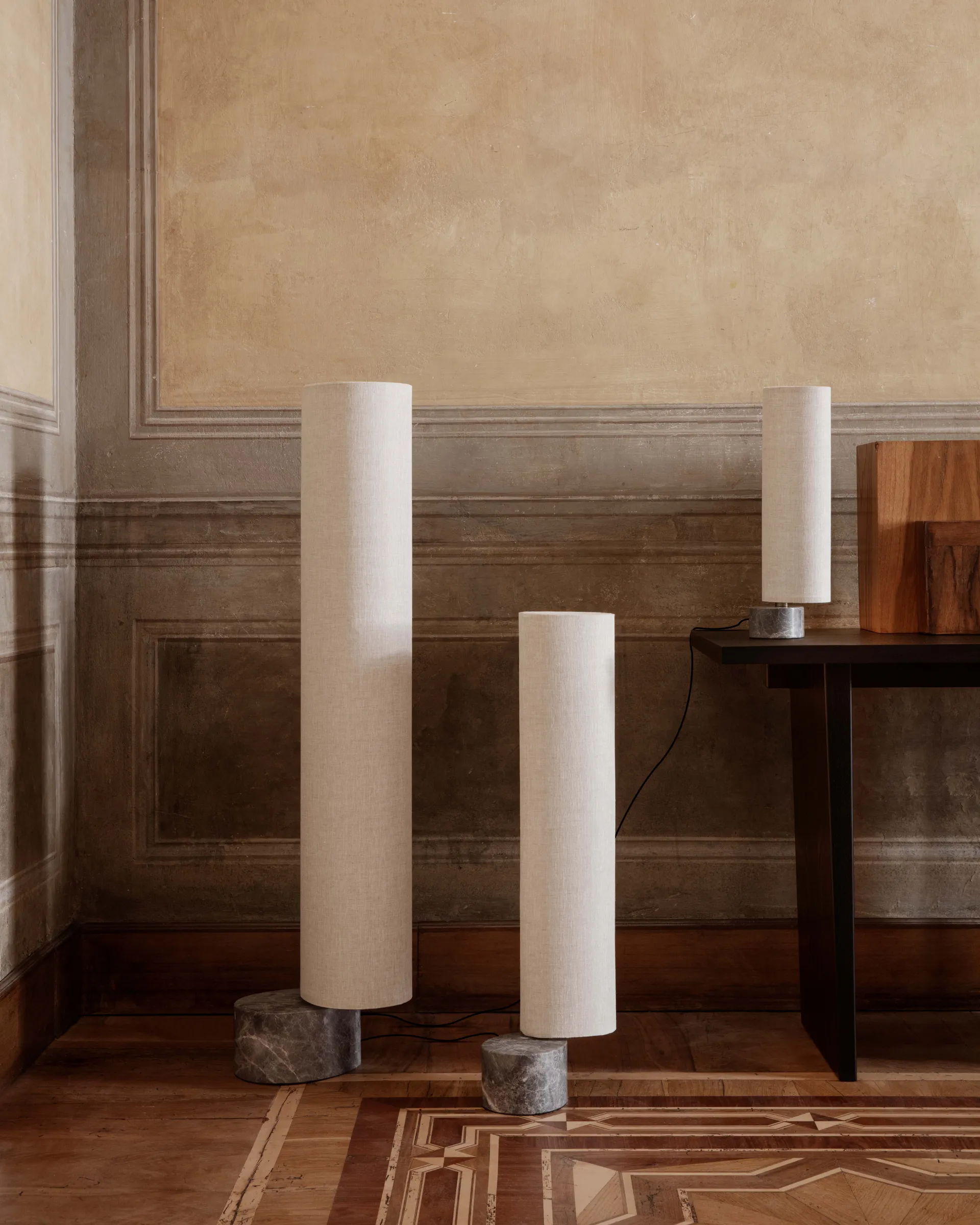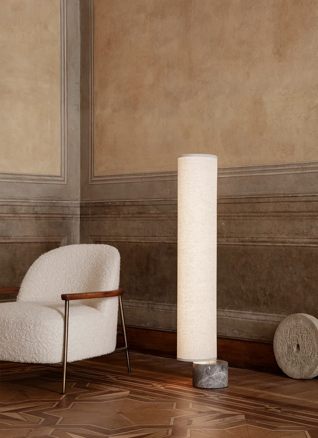 Playful, poetic and pared back, Space Copenhagen’s design team have reimagined the traditional lantern with the calming and characterful Unbound Floor Lamp. With the teardrop-shaped marble base acting as an anchor, the white linen or natural canvas shade can be effortlessly rotated around it, as though it were a sail, gently billowing. Its dark antique brass ‘mast’ supports an array of dimmable LED lights within the shade that create a soft, diffuse and evenly distributed light. The largest of the Unbound Floor Lamps, it can be used to create a bold, standalone statement, or it can be paired with the medium and small versions to create a sculptural cluster. Changing the angles of the ‘sails' to each other makes a calming, floating and dynamic sculpture, even when switched off. This balance of character and sophistication make the Unbound Floor Lamps destined to grace both the private home and grand projects alike.