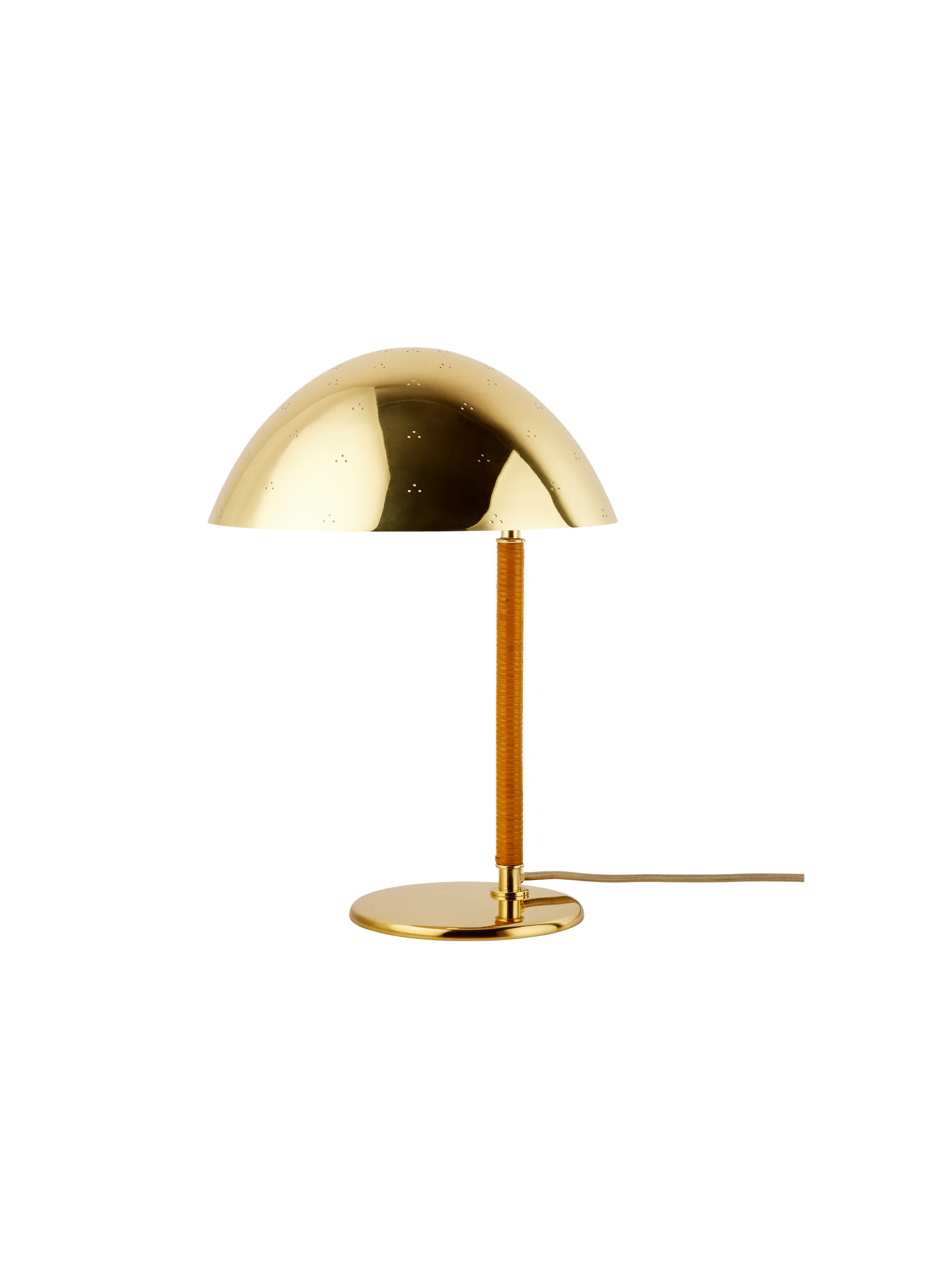 One of the great industrial designers and metal craftsmen of the 20th century, Tynell came into the world at precisely the right time to become one of the pioneers of modern lighting; as the electric light spread across the world, so too did Tynell’s design visions. The 9209 has a distinctively shaped shade in spun brass that has led to it being referred to as the ‘Kypärä’ – the Finnish word for ‘helmet’. Held in place by a curved brass arm, the individually molded shade is decorated with triangular patterns of perforation – a Tynell decorative signature – which requires a specialist punch tool and the utmost precision to achieve by hand. As well as guiding the light downward, thanks to the holes punched in the surface, the shade also allows pinpricks of light through, creating a soft, textured glow and a starlight-like sparkle.