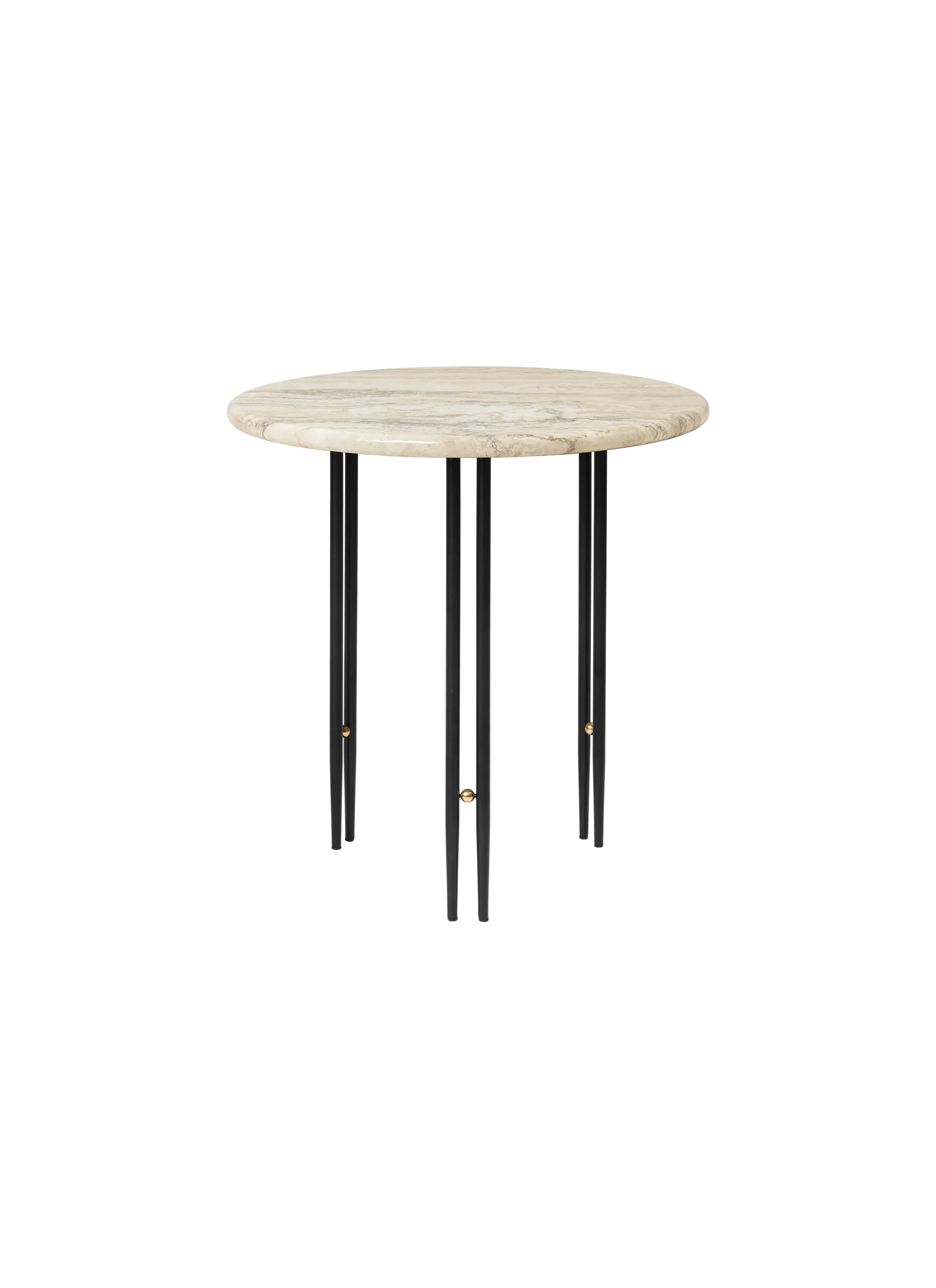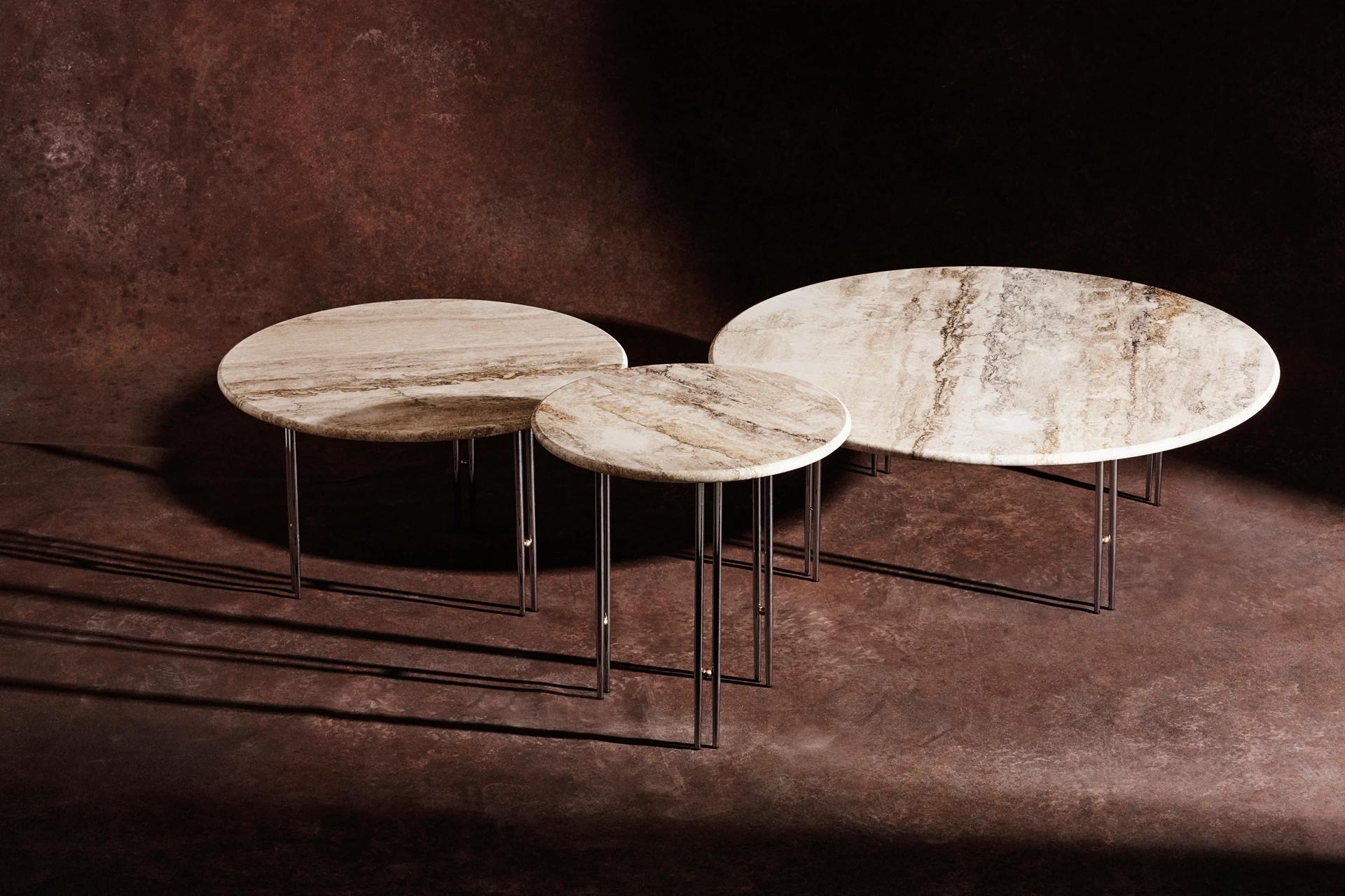 The IOI Side Table by GamFratesi is a celebration of Italian materiality, featuring solid brass, steel, and now travertine. Drawing on geometric Art Deco references with a contemporary design language, the collection explores the empty space between the physical form as much as the form itself. Striking and unique, the IOI Collection takes its name from the structure of the table legs, each of which is formed from twin metal tubes linked by a sphere of brass the letters I-O-I rendered in physical form. Retaining this slender base, in black or chrome options, GUBI’s new edition introduces a new material and color to the circular tabletop travertine in Rippled Beige and refines its shape. The sides are rounded to create a U-shaped edge that arcs evenly on the top and bottom.