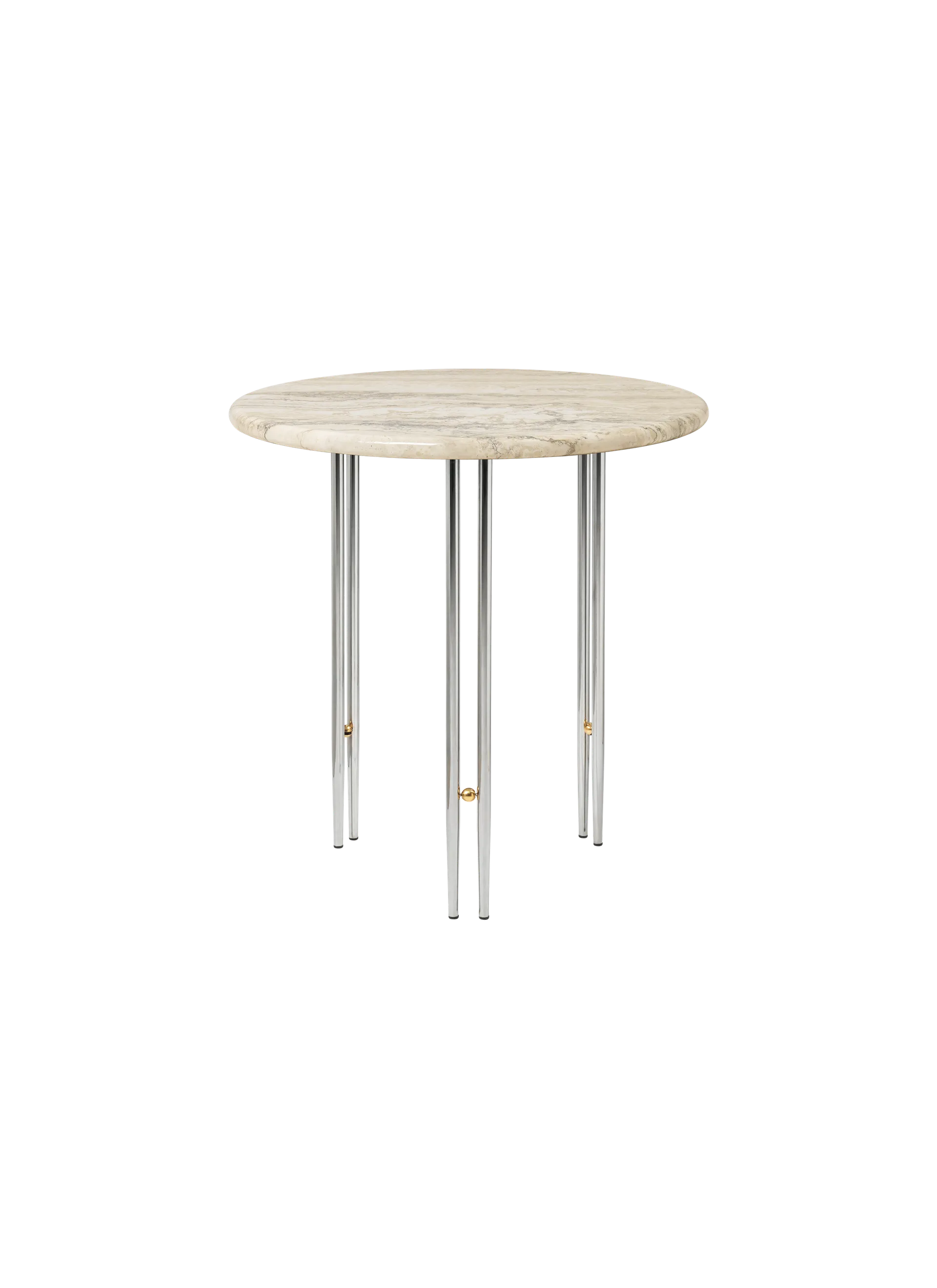 The IOI Side Table by GamFratesi is a celebration of Italian materiality, featuring solid brass, steel, and now travertine. Drawing on geometric Art Deco references with a contemporary design language, the collection explores the empty space between the physical form as much as the form itself. Striking and unique, the IOI Collection takes its name from the structure of the table legs, each of which is formed from twin metal tubes linked by a sphere of brass the letters I-O-I rendered in physical form. Retaining this slender base, in black or chrome options, GUBI’s new edition introduces a new material and color to the circular tabletop travertine in Rippled Beige and refines its shape. The sides are rounded to create a U-shaped edge that arcs evenly on the top and bottom.