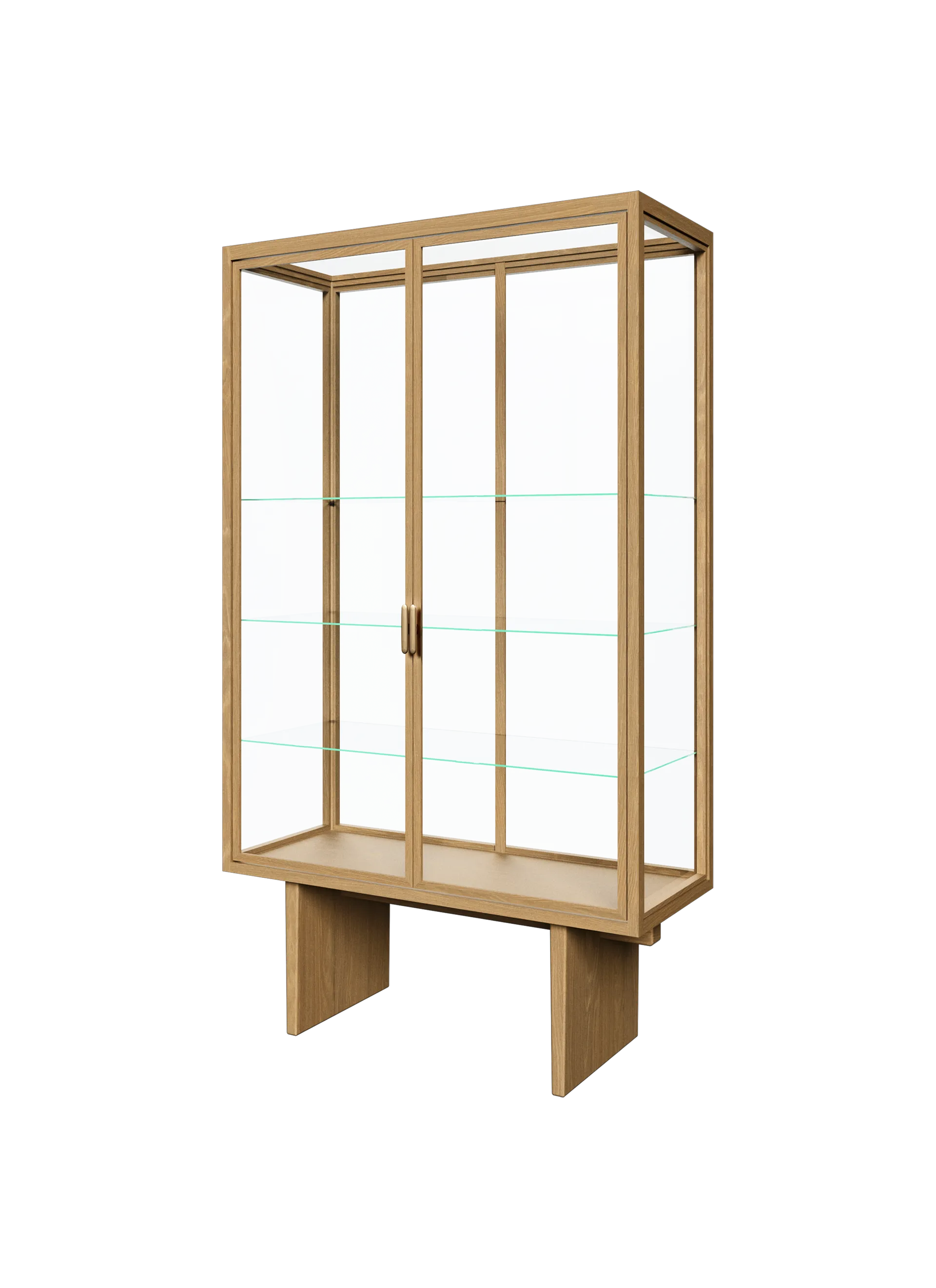 Understated sophistication, timeless aesthetics, and outstanding craftsmanship are the hallmarks of this statement display cabinet designed by Space Copenhagen. Inspired by antique Japanese furniture in both style and craft, this oak-veneered cabinet is elevated by two vertical legs, providing a lightness to its appearance and an understated elegance to its form. The frame secures a tall glass case, with three glass shelves, and two perfectly-aligned glass doors, completing the overall impression of lightness and transparency. Its very simplicity means the Private Vitrine can be used to store and display many types of possessions, from books to precious ornaments