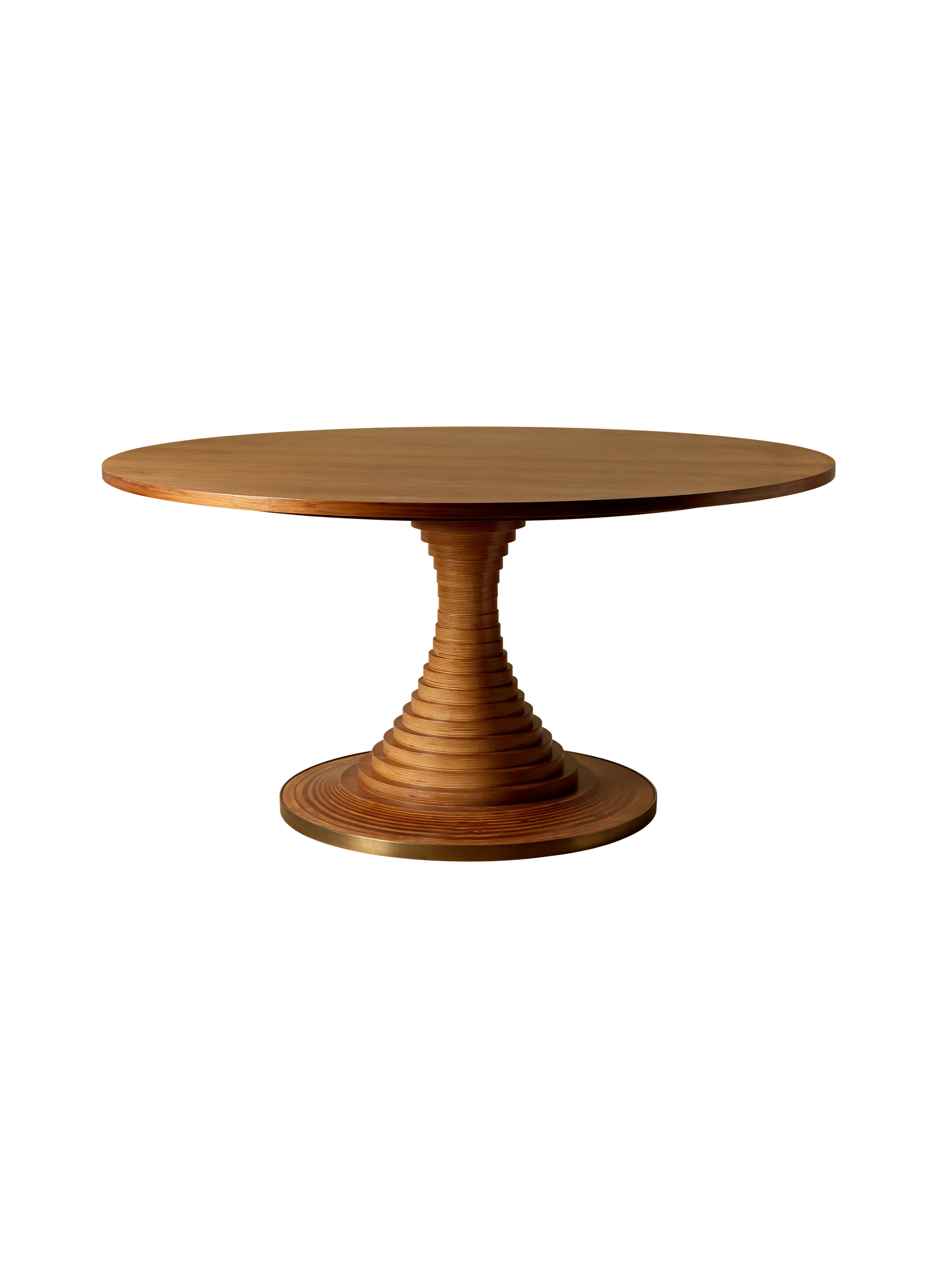 Designed in 1963 by the influential Italian architect Carlo De Carli, the Tavolo a Dischi dining table is an elegant marriage of function and form, combining structural innovation, expressive materiality, and practical excellence. The round table is ingeniously constructed from 3cm-thick FSC® Mix-certified birch plywood discs of varying diameters and from other responsible sources (FSC® C176589), stacked around a concealed metal core, to form an elegant curve that supports a generous tabletop in walnut veneer, now available in two sizes. A burnished brass-toned steel band at the base adds material contrast while providing protection. Equally suited to dining, meetings, or gatherings, the Tavolo a Dischi is a centerpiece that brings people together, fostering connection and conversation.