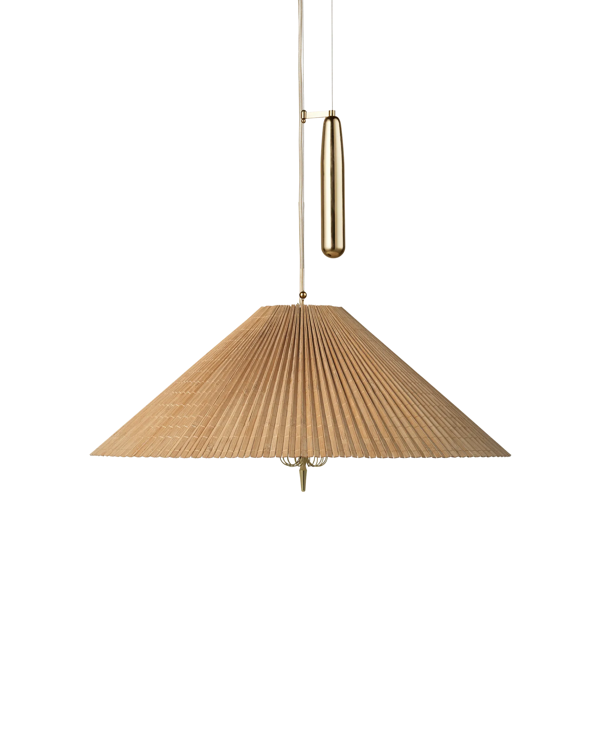 Designed by the legendary Paavo Tynell, the 1972 pendant features a conical shade in bamboo, crafted by master artisans. The bamboo slats are hand sewn into a pleated mat and fastened by hand to the wire frame, with a linen liner in between. This directs light down towards the base and creates a diffuse glow around the shade and upward, as the bamboo slats are penetrated by the light. Tynell's signature brass details are present as well, adding an air of timelessness and perfectly complementing the warm tone of the wood and light. Below the bulb, a fabric diffuser modulates the light and, beneath this, a decorative brass detail gives each lamp a flourish of character, and subtly influences the play of light it generates.