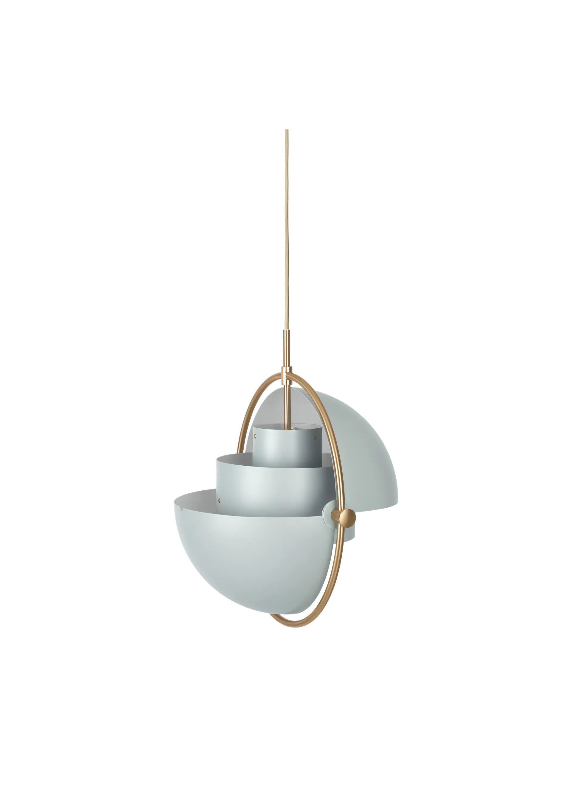 The Multi-Lite Pendant embraces the golden era of Danish design with its characteristic shape of two opposing outside, mobile shades that enable creating a personal installation and a wide range of lighting values in a room. By individually rotating the shades, the Multi-Lite Pendant can be transformed into multiple combinations where the light can be directed upwards, downwards or exude an asymmetrical art light. The Multi-Lite was first drawn in 1972 when Louis Weisdorf did an exception to his own design custom of using multiple repeating elements. Instead, it reflects his passion for diversity. Two cylindrical shapes lay the foundation of the lamp and a metal ring encompasses it and anchors the two quarter-spherical shades, which ultimately completes a picture of an iconic design with multiple purposes. The Multi-Lite Pendant has a timeless expression that fits into any domestic setting.