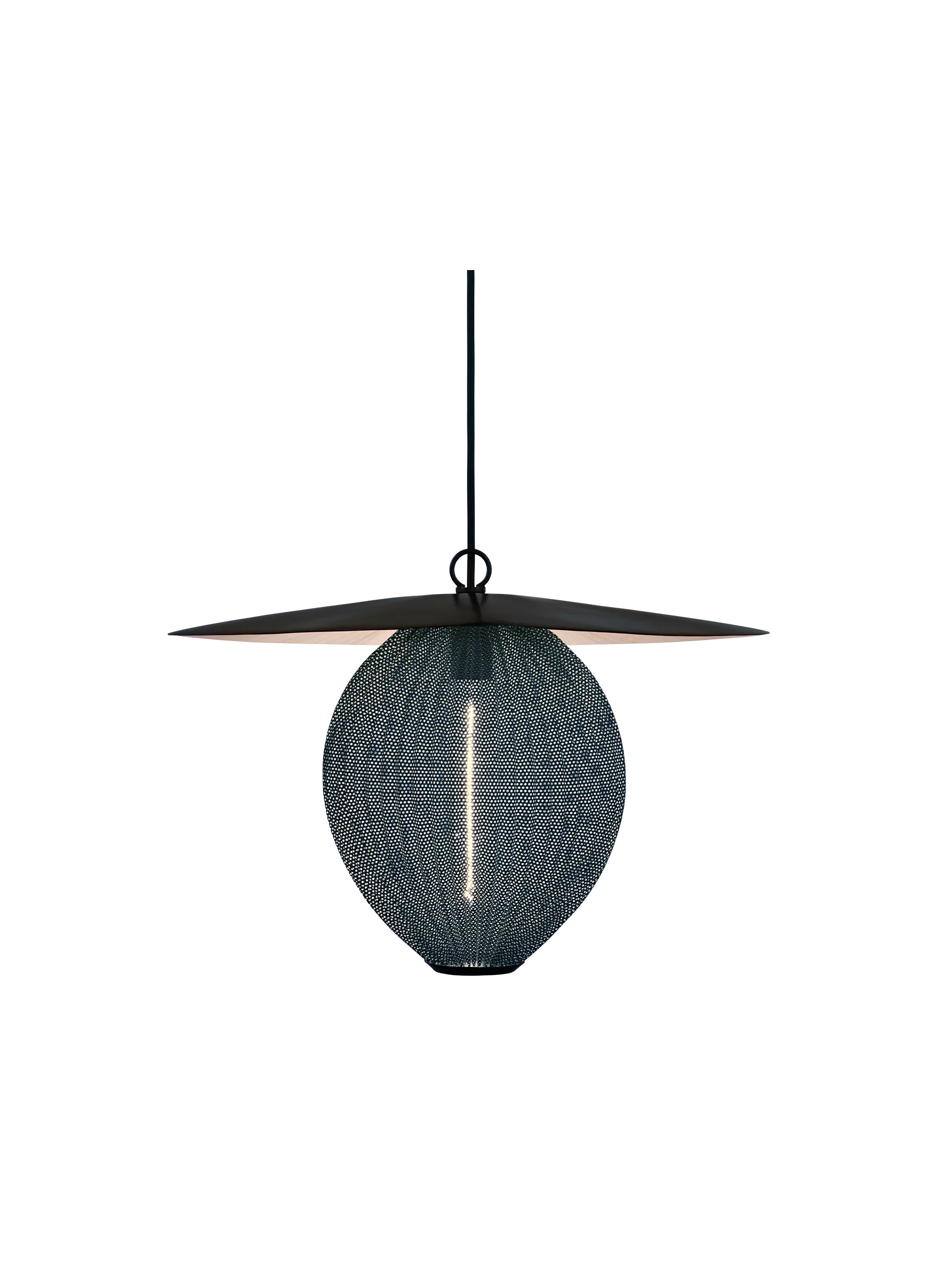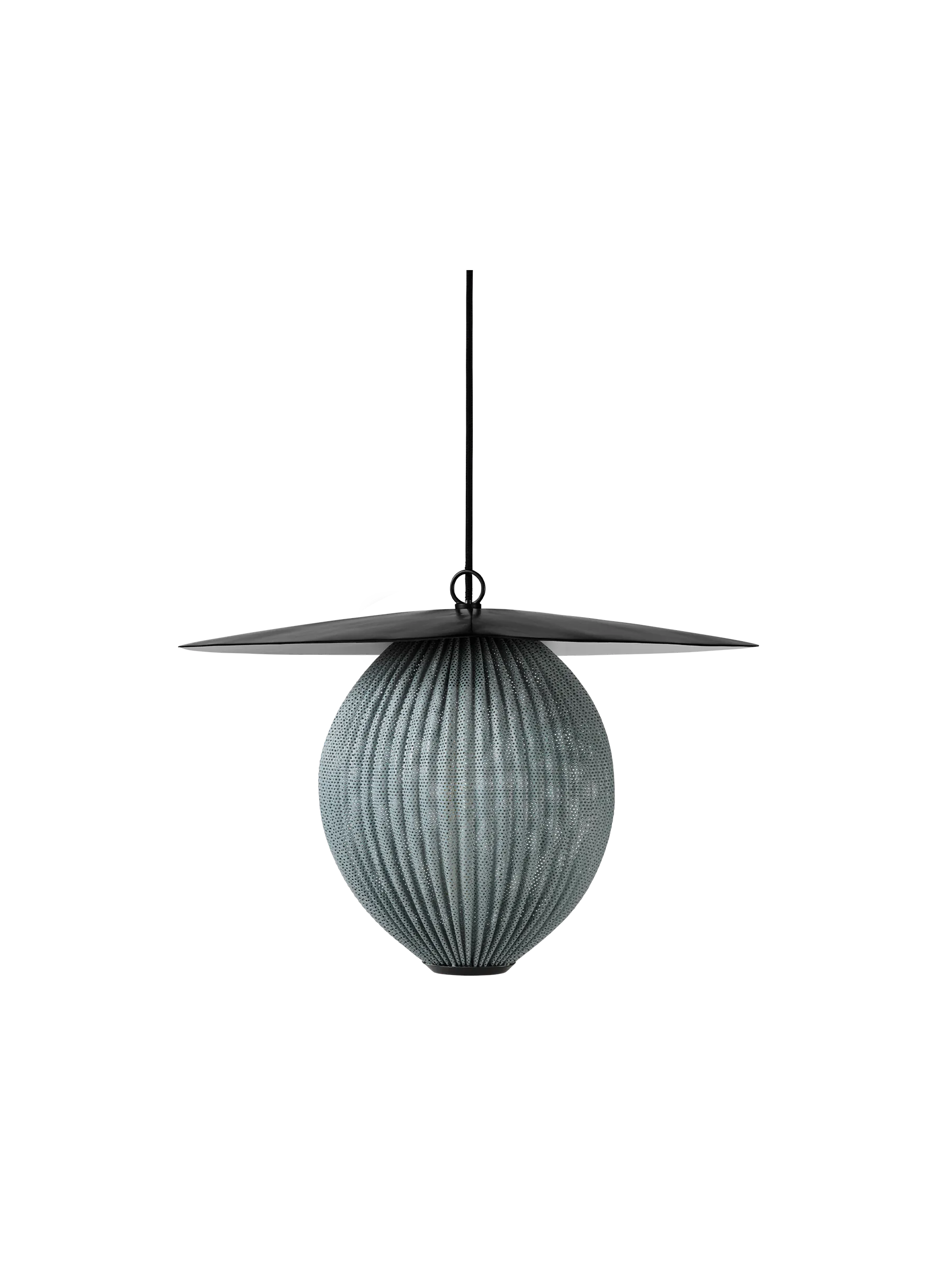 The Satellite Pendant of two sizes is designed by Mathieu Matégot in 1953 with geometrical shapes and an organic shade to create outstanding sculptural aesthetics. The name, Satellite, was given by Matégot as a wink and tribute to the scientific progress in France in the years after the Second World War. The Satellite Pendant holds the distinctive trait of Rigitulle, a technique and material invented by the designer himself that makes it possible to bend and fold the fabric-like metal sheet to an original, oblong-shaped pendant lamp. The lampshade has five colour options; midnight black, white cloud, shy cherry, venetian gold and rainy grey, and is unique with its bulb all covered by perforated metal to exude an atmospheric light - creating a festive appearance. The interplay of light and shadow cast on walls and floors generate a dramatic feature in any dining room, hallway or restaurant. Hang the Satellite Pendant alone as a character piece or in multiples to create a cloud of luminosity.