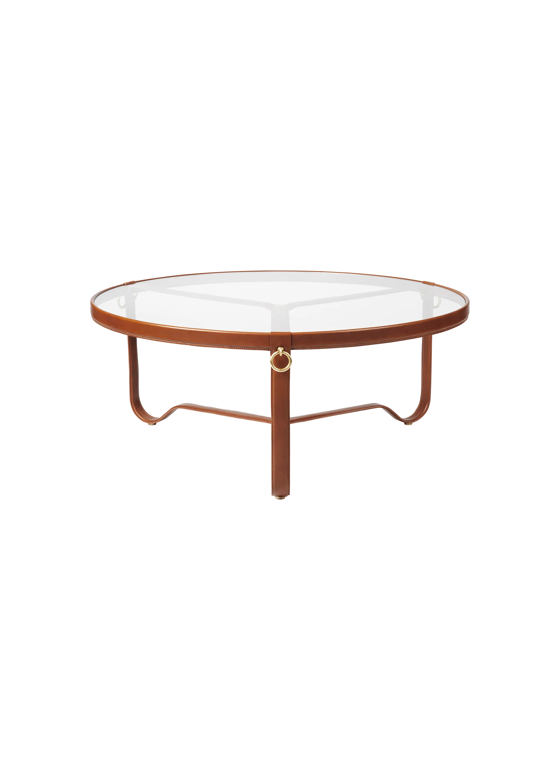 The Adnet Coffee Table Circular was originally designed by French Modernist Jacques Adnet in the 1950s. Adnet was always ahead of contemporary trends and became famous for his avant-garde designs and unusual combination of leather, metal and glass. The iconic Adnet Coffee Table Circular exemplifies everything the French architect and interior designer stands for and perfectly merges his Art Deco style with his strong commitment to functionalist principles. Placed on three soft curved metal legs, elegantly meeting in the heart of the table, the round glass top is edged with a hand-made leather rim and adorned with three gilded brass rings. The timeless design of the Adnet Coffee Table Circular embodies modern materials and superb craftsmanship and adds a distinctive value to any home or professional space.