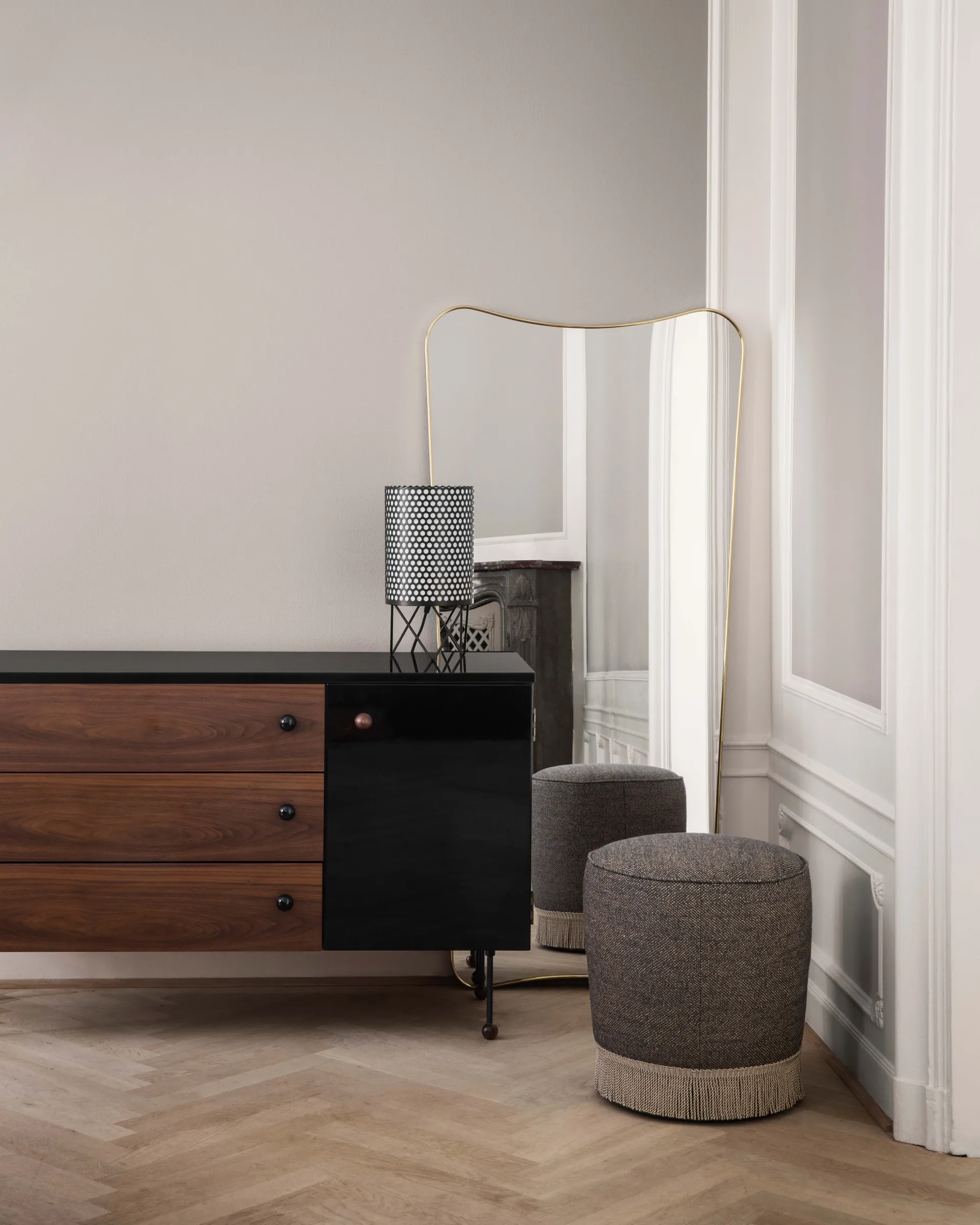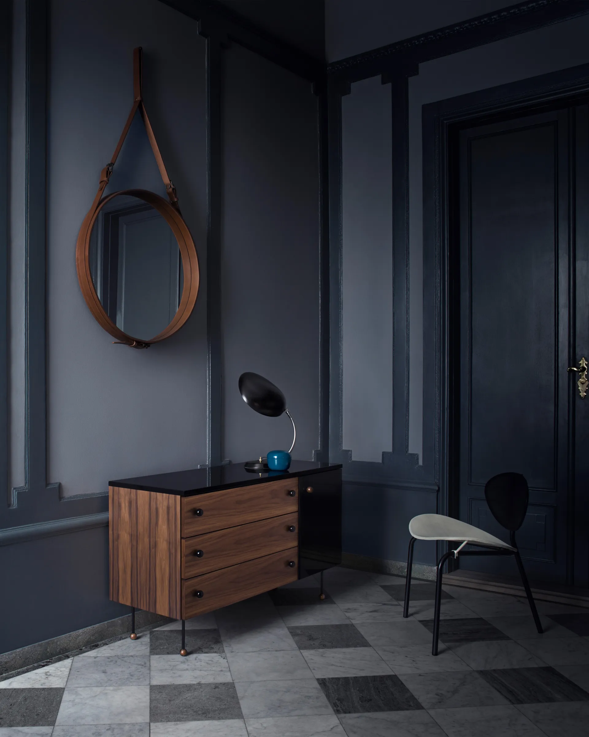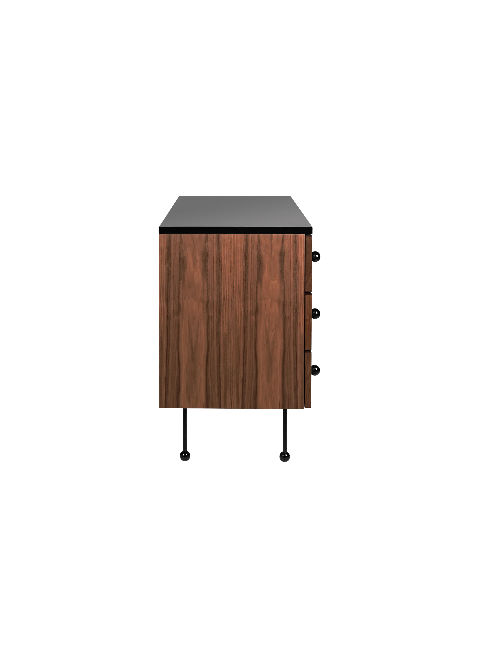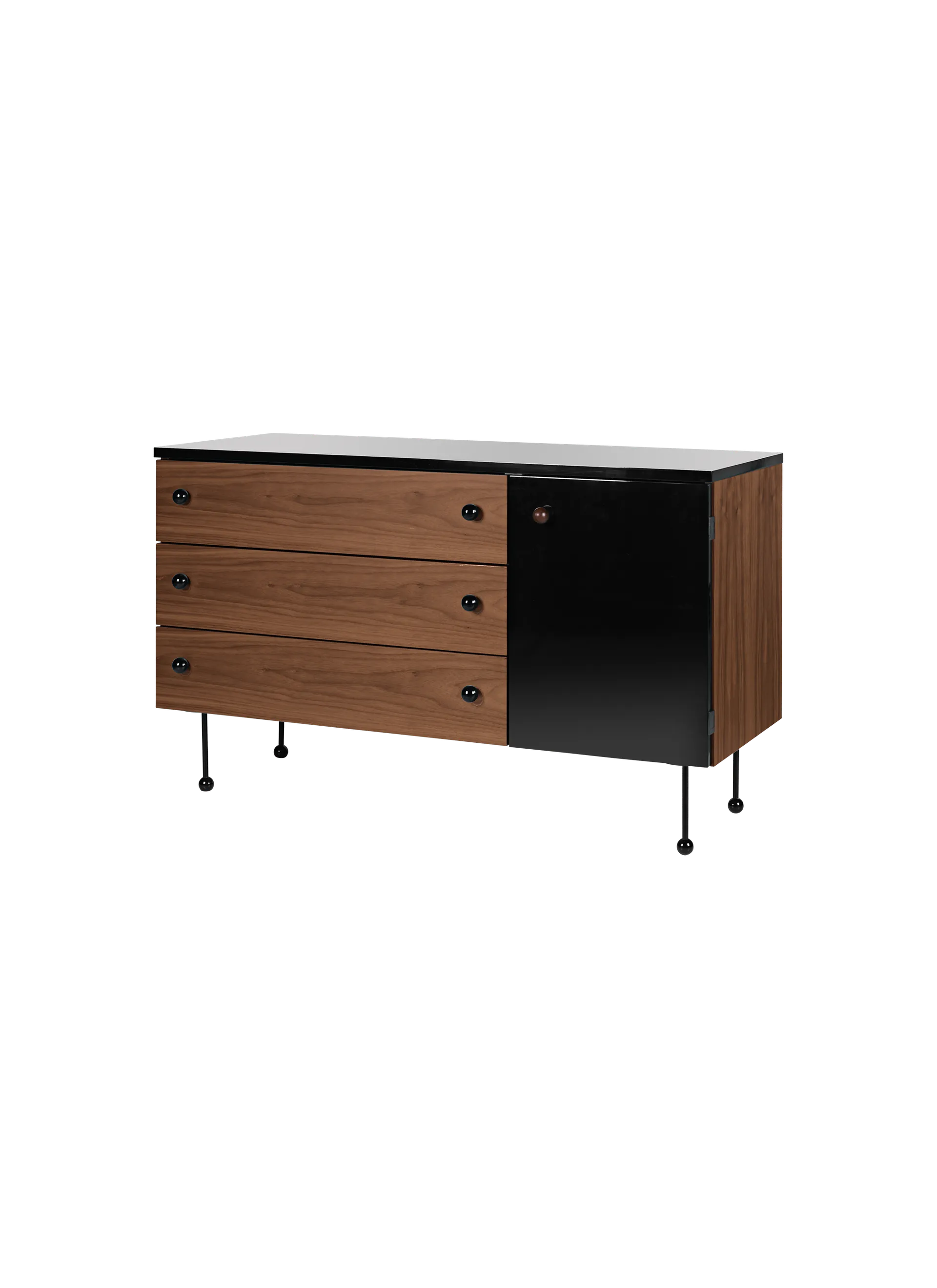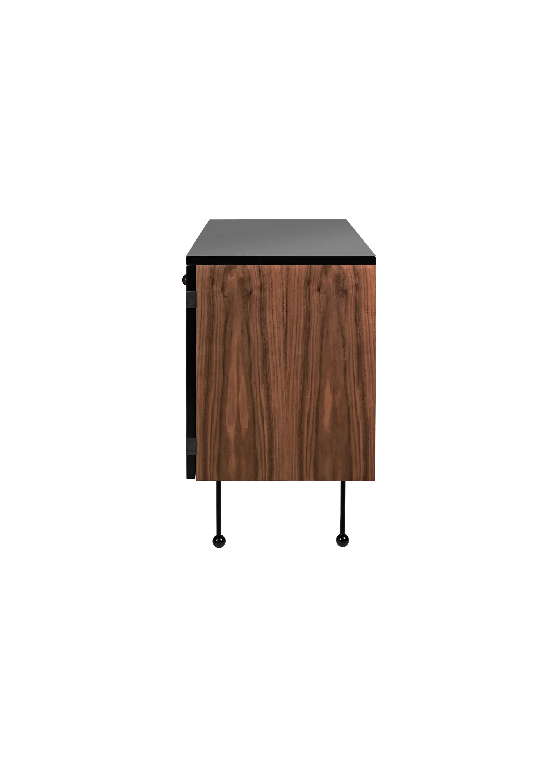 Designed in 1952 by Greta M. Grossman, but named the 62 Sideboard as it was deemed to be ten years ahead of its time. The sideboard illustrates the designer’s penchant for exceptional shapes and unusual pairing of materials. The slender metal legs with ball-shaped feet, a characteristic trait of Grossman, contrasts the sharp rectangular shape in luxurious American walnut, giving the furniture a characteristic appearance of lightness and almost seeming to defy gravity. Adding to its elegance, the sideboard is provided with a deep, black full gloss finish on the tabletop and small solid wooden spheres.