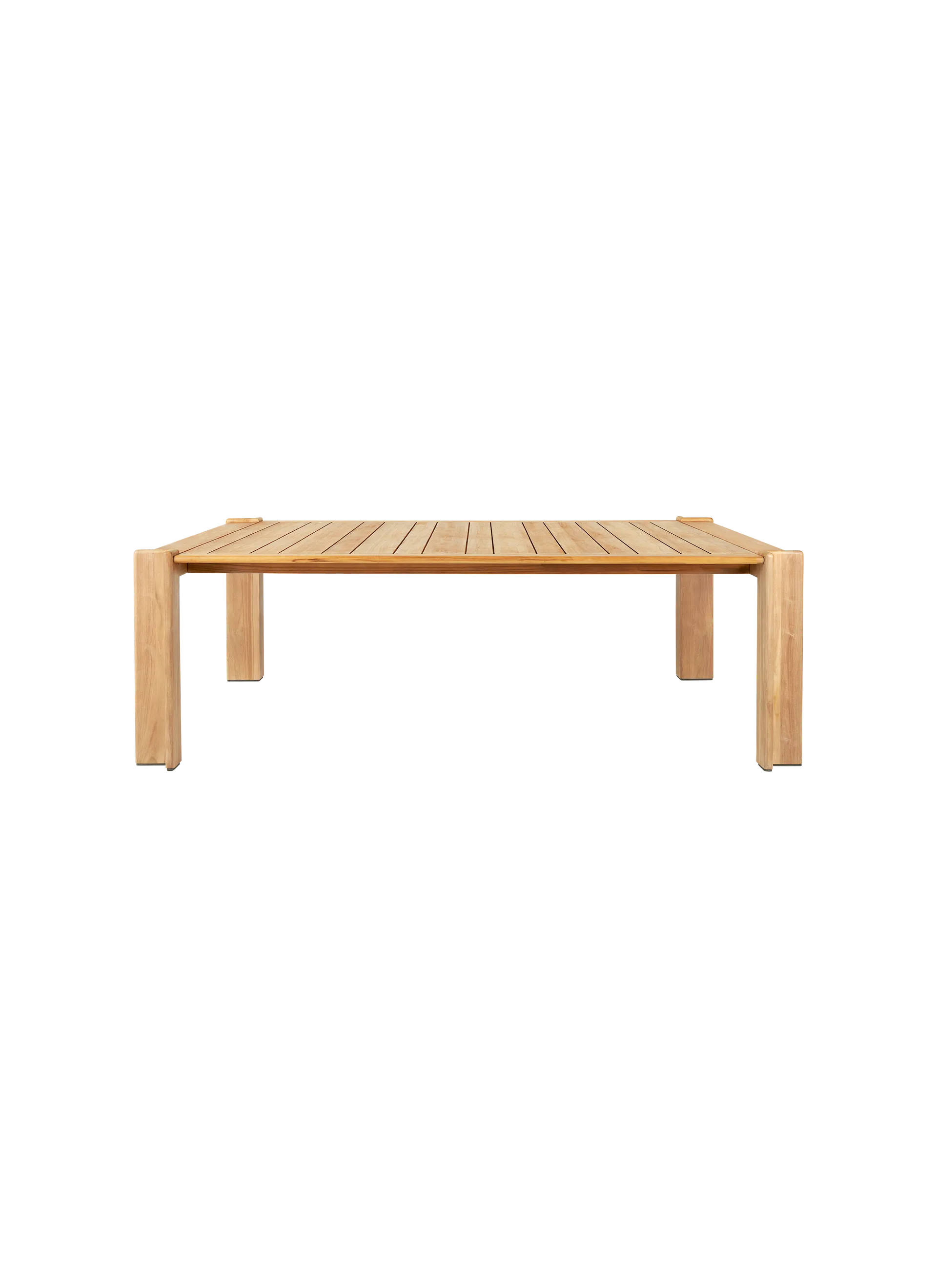 The tables’ simple aesthetics maintain an understated poise with a nod to classic references without being too formal. The tabletops are made from rhythmic, repeating slats of solid, premium teak, enclosed by a frame made from the same slats, giving a minimalist feel. The table legs are formed from two vertical slats, using a miter joint that creates an inverted ‘L-shape’ on each corner. Referencing architectural and maritime design, the unusual leg design provides both structural support and visual interest, giving the piece a certain lightness. Each leg protrudes slightly above the tabletop surface, culminating in a rounded detail in contrast to the geometric lines of the structure, that gives a calm composure to the design.