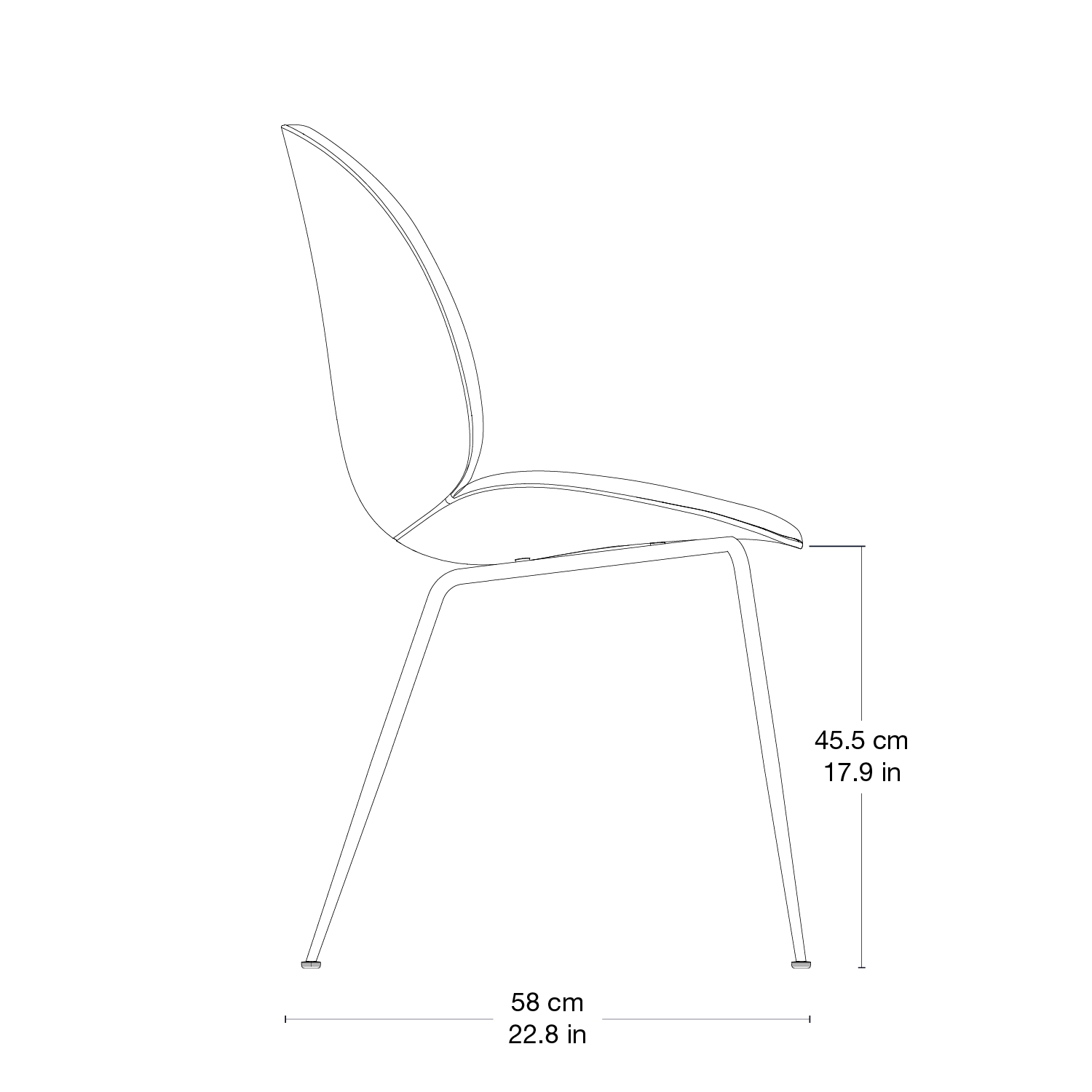 The Beetle Dining Chair can be customized in any one of a vast array of fabrics and materials, further echoing the versatility of its insect namesake. The distinctive silhouette enables the Beetle to carry bold colors with tactile expressions, or upholsteries can be color matched to the shell for a more understated finish.