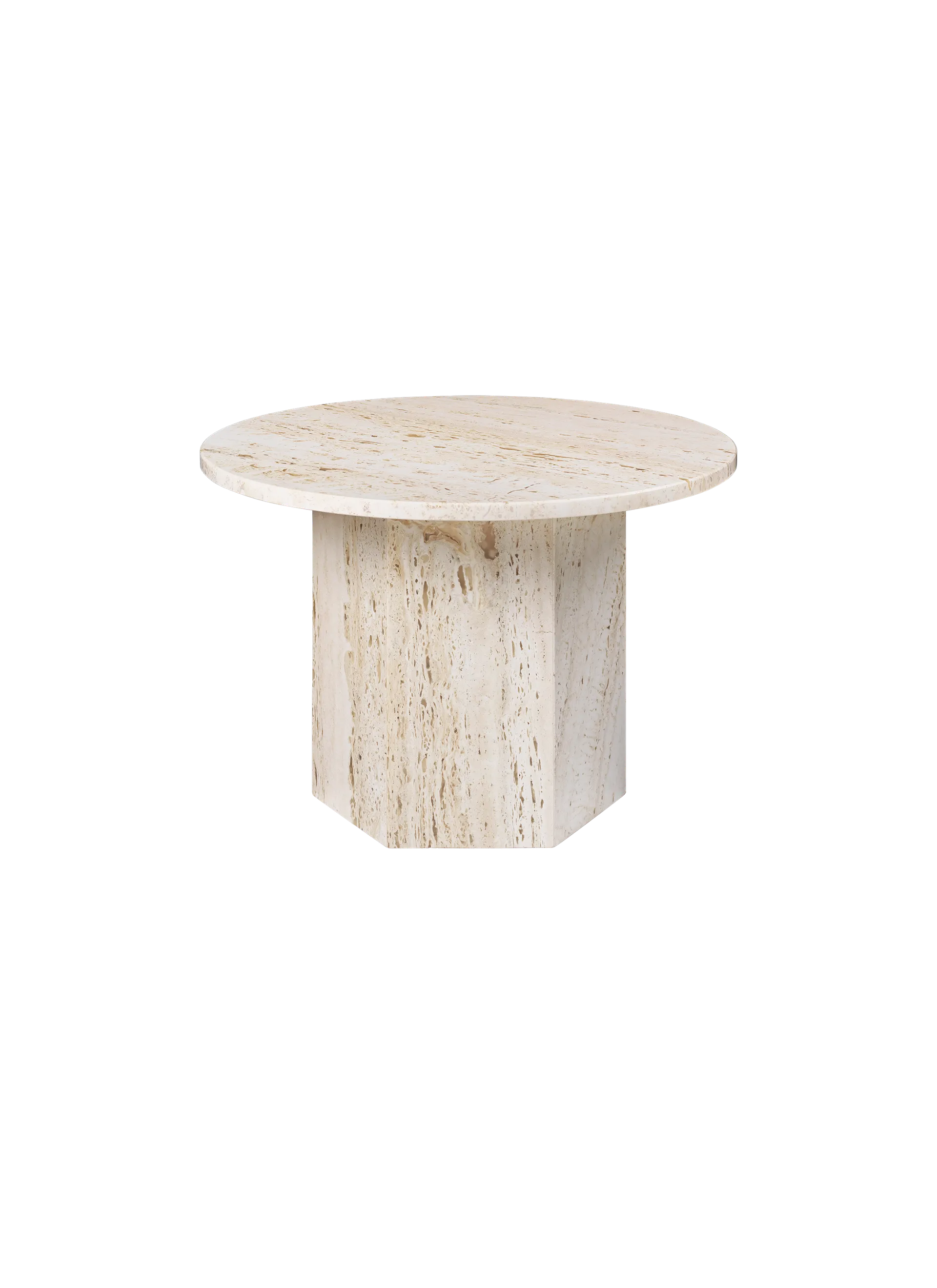 Made in Italy from travertine stone, the monolithic form emphasizes the materiality of the stone, the natural beauty of its veins, and the vibrant texture of its unique patina, in which a new detail can be discovered with every use.