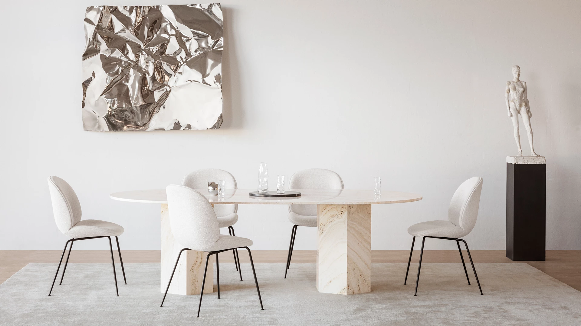The new Epic Elliptical Table by GamFratesi features two monolithic columns supporting a new elongated tabletop in the shape of an ellipse, making it perfect for dining settings and larger gatherings. Named after the epic poems of ancient times, GamFratesi’s Epic Table for GUBI is a sculptural piece of furniture inspired by Greek columns and Roman architecture. The table is made in Italy from white travertine, its monumental form emphasizes the materiality of the stone, the natural beauty of its veins, and the vibrant texture of its unique patina, in which a new detail can be discovered with every use.