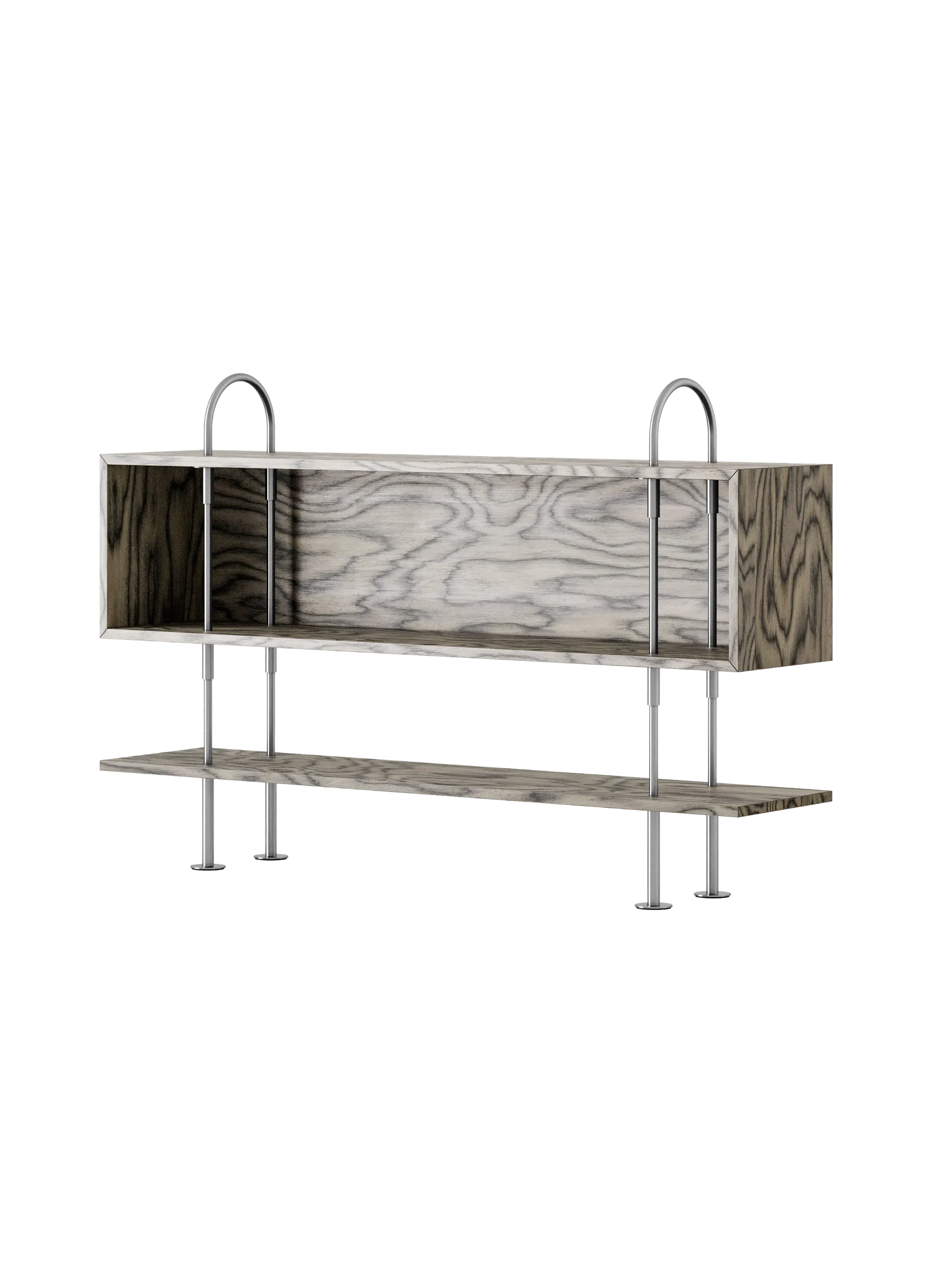The core components of the system are vertical metal rods, three lengths of open shelf, an enclosed box shelf, feet for the bottom, and soft arches at the top. The connectors enable the unit to be extended vertically by adding more rods and shelves, with each rod piercing the shelf above through a specially engineered connector bracket.