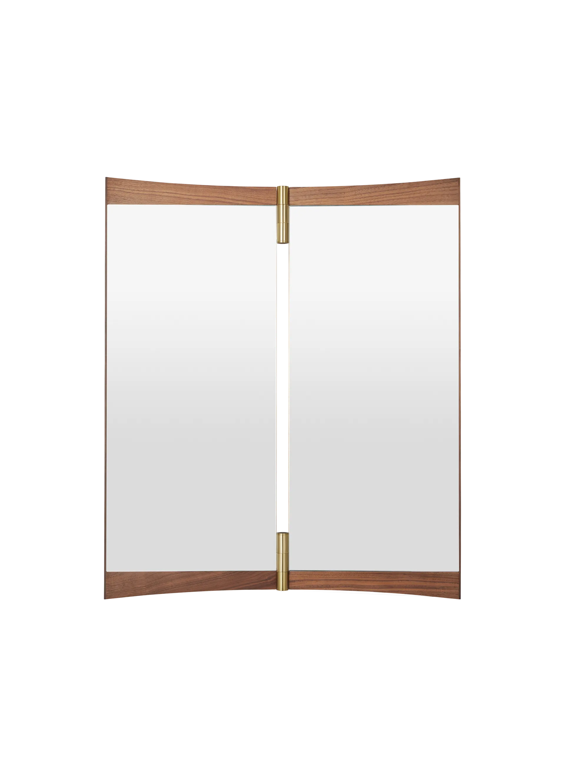 A contemporary echo of the 18th-century vanity-table mirror that gives it its name, the Vanity Mirror Collection is GamFratesi’s second wall-mounted mirror design for GUBI. The collection comprises three variations – with one, two and three mirror panels, respectively. The design’s defining features are its warm walnut veneer and brass hinges. These allow the angle of the mirror to be adjusted, influencing the perspective it offers and the play of the light in the room. On the single-panel Vanity Mirror 1, the hinges permit a 15o rotation, whereas the 180o hinges on the Vanity Mirror 2 and Vanity Mirror 3 allow the panels to fold flat on top of one another, covering the mirror when not in use.