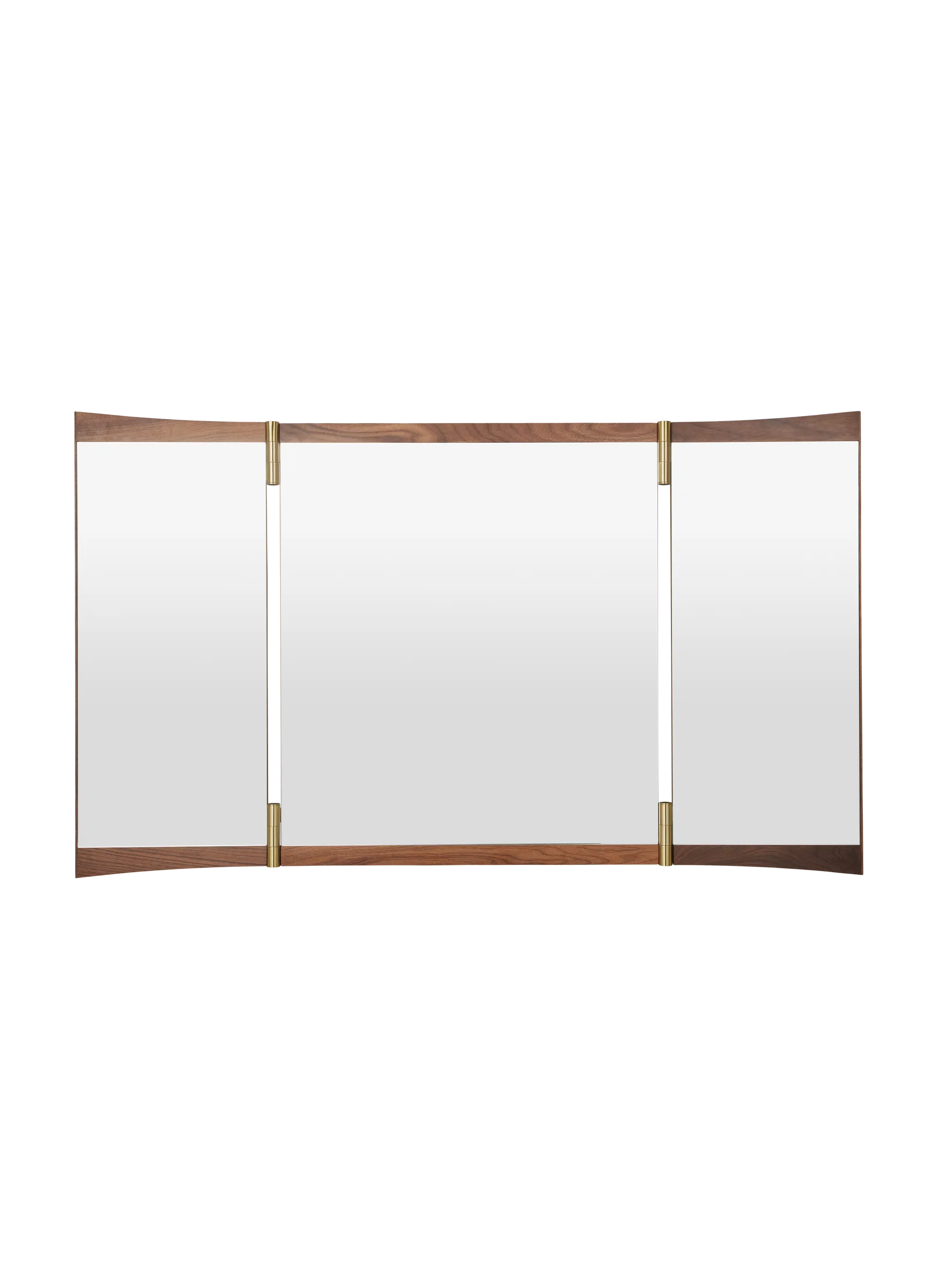 A contemporary echo of the 18th-century vanity-table mirror that gives it its name, the Vanity Mirror Collection is GamFratesi’s second wall-mounted mirror design for GUBI. The collection comprises three variations – with one, two and three mirror panels, respectively. The design’s defining features are its warm walnut veneer and brass hinges. These allow the angle of the mirror to be adjusted, influencing the perspective it offers and the play of the light in the room. On the single-panel Vanity Mirror 1, the hinges permit a 15o rotation, whereas the 180o hinges on the Vanity Mirror 2 and Vanity Mirror 3 allow the panels to fold flat on top of one another, covering the mirror when not in use.