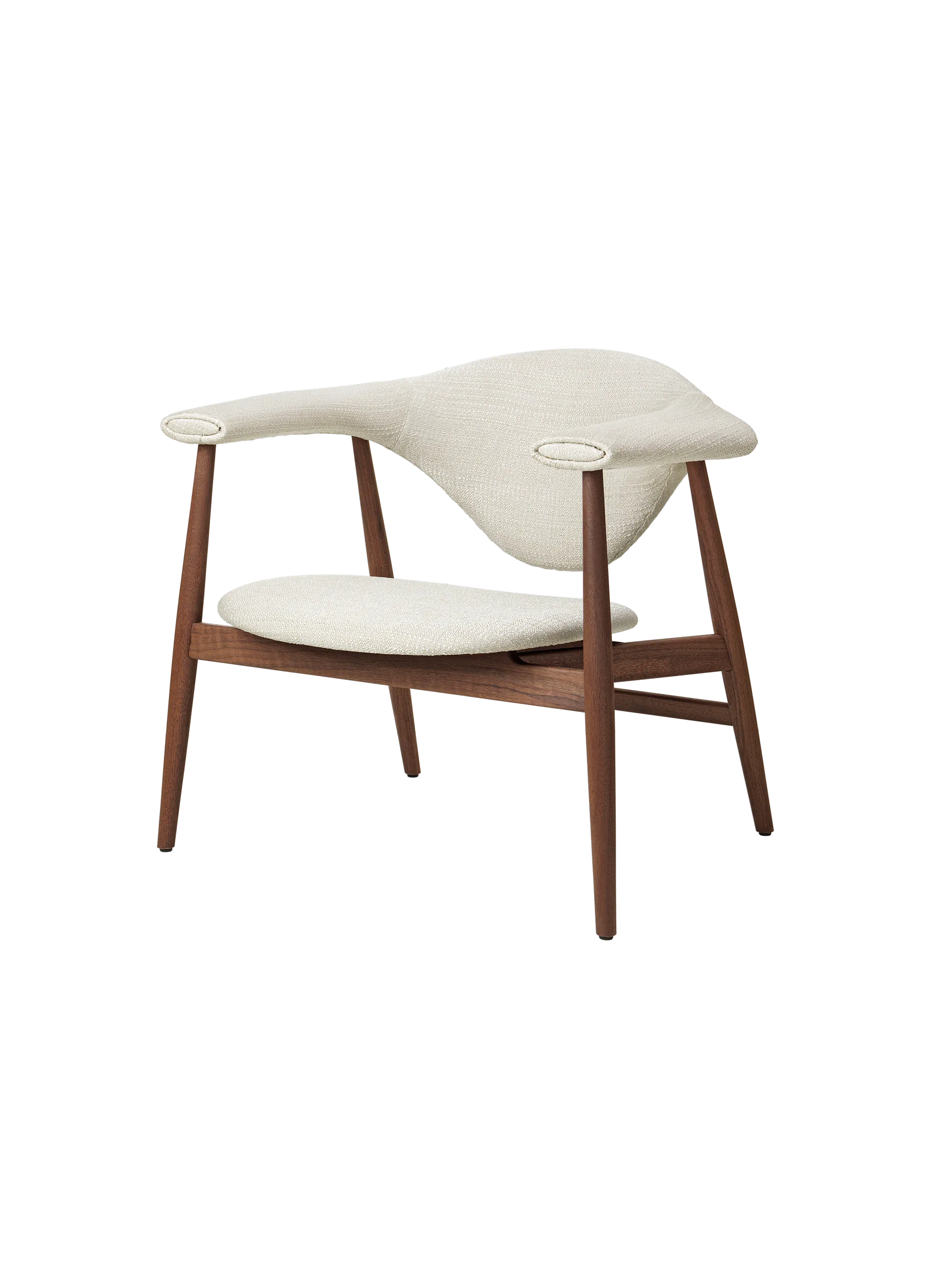 The characteristic Masculo Lounge Chair with a four-legged version in metal, giving the collection a domestic expression adapted to the hospitality market. Designed for the fine dining restaurant Copenhague at Maison du Danemark in Paris, the four-legged Masculo Chair and Lounge Chair in metal marry the idea of Danish elegance and simplicity with Italian refinement and playfulness. The backrest of Masculo is almost overly large and appears to float in the air which is challenging to the senses. This is supported by the slender metal legs that make the whole chair almost sculptural and exciting to the eye. The upholstered chair ensures a high level of comfort, while its clean metal legs and sophisticated form lend the chair a graceful presence. The metal base gives the chair a more domestic expression that is perfectly suited for hospitality projects as well as the private home.