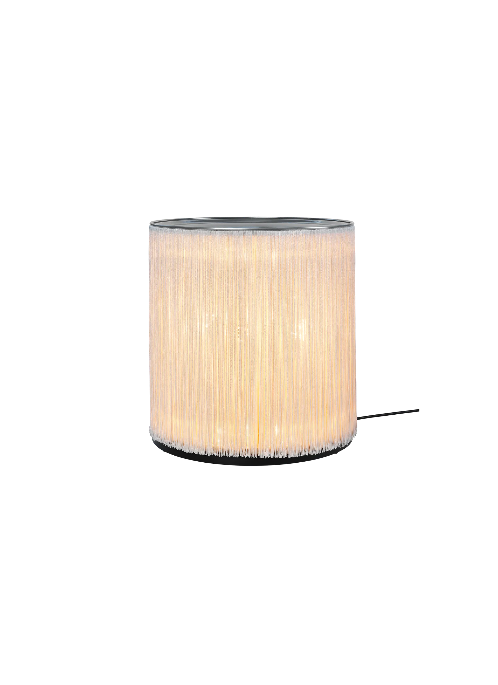 Its distinctive nylon fringes cascade gracefully from a diabolo-shaped aluminum base, where six lateral bulbs encircle the central core, while an additional bulb resides above, casting an enchanting 360º radiance through the fringes. This luminary masterpiece also creates an ethereal uplight, its glow dancing upon the polished aluminum, all within your control through a dual-button switch.