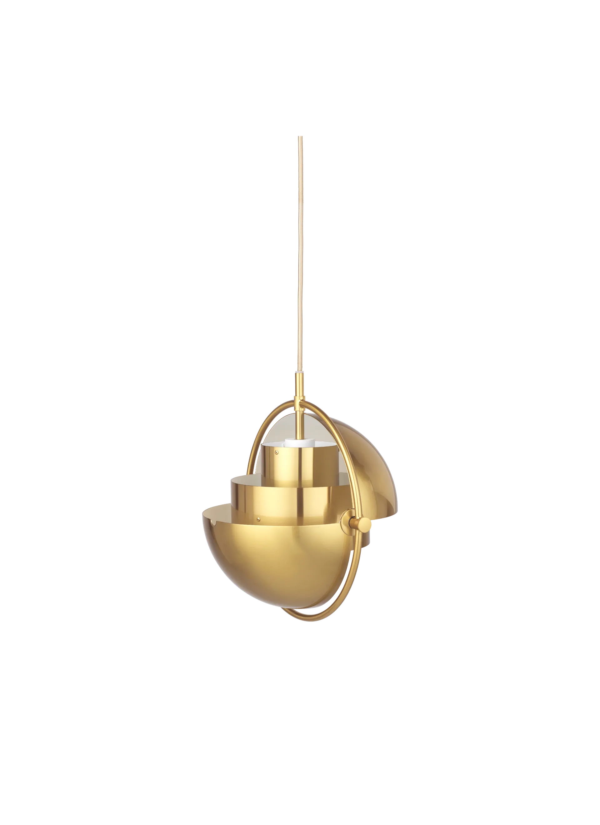 The Multi-Lite Pendant embraces the golden era of Danish design with its characteristic shape of two opposing outside, mobile shades that enable creating a personal installation and a wide range of lighting values in a room. By individually rotating the shades, the Multi-Lite Pendant can be transformed into multiple combinations where the light can be directed upwards, downwards or exude an asymmetrical art light. The Multi-Lite was first drawn in 1972 when Louis Weisdorf did an exception to his own design custom of using multiple repeating elements. Instead, it reflects his passion for diversity. Two cylindrical shapes lay the foundation of the lamp and a metal ring encompasses it and anchors the two quarter-spherical shades, which ultimately completes a picture of an iconic design with multiple purposes. The Multi-Lite Pendant has a timeless expression that fits into any domestic setting.